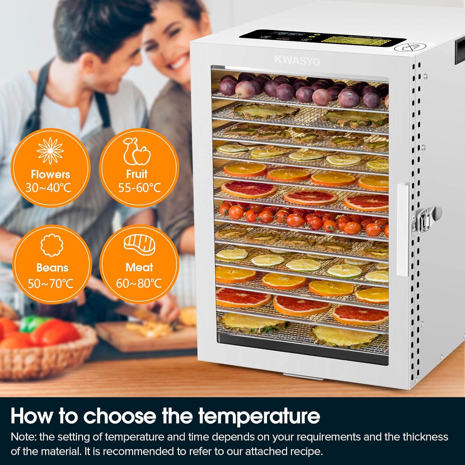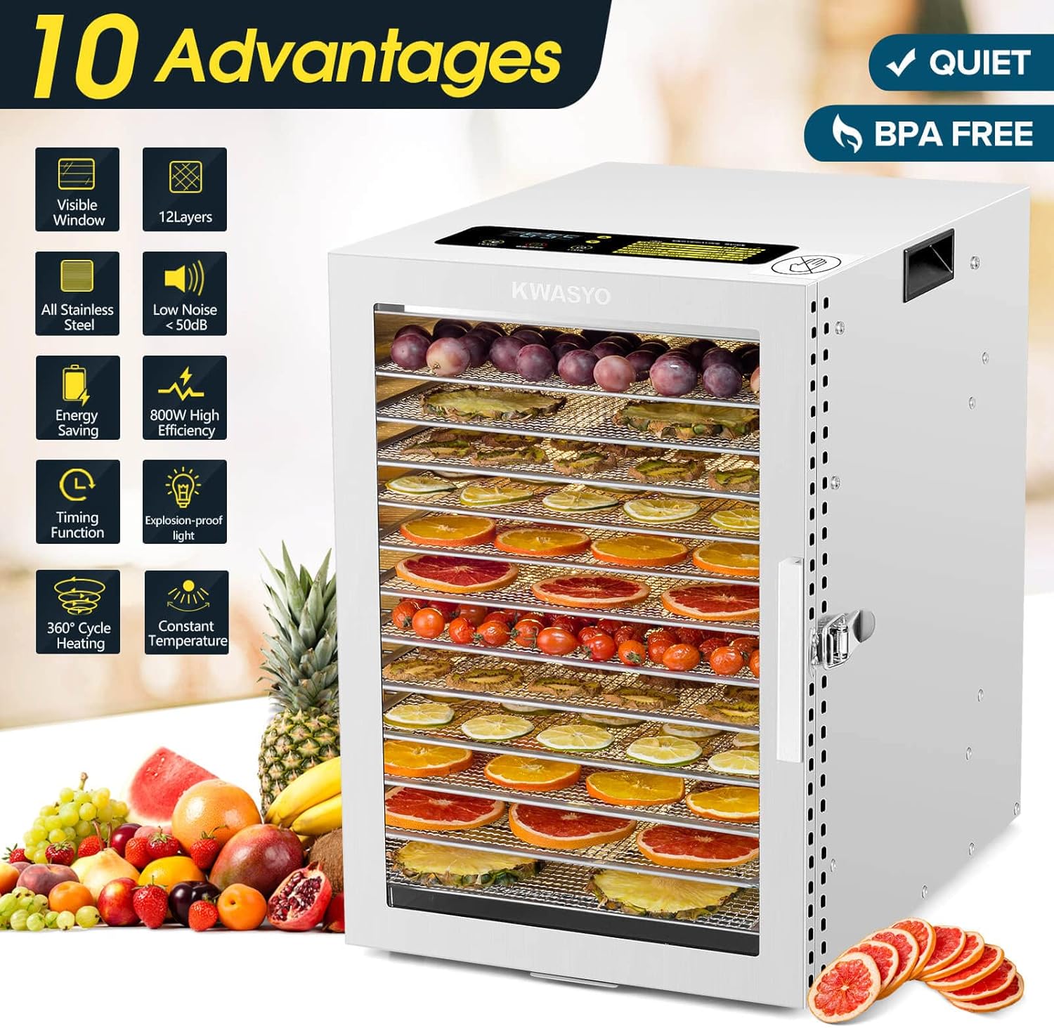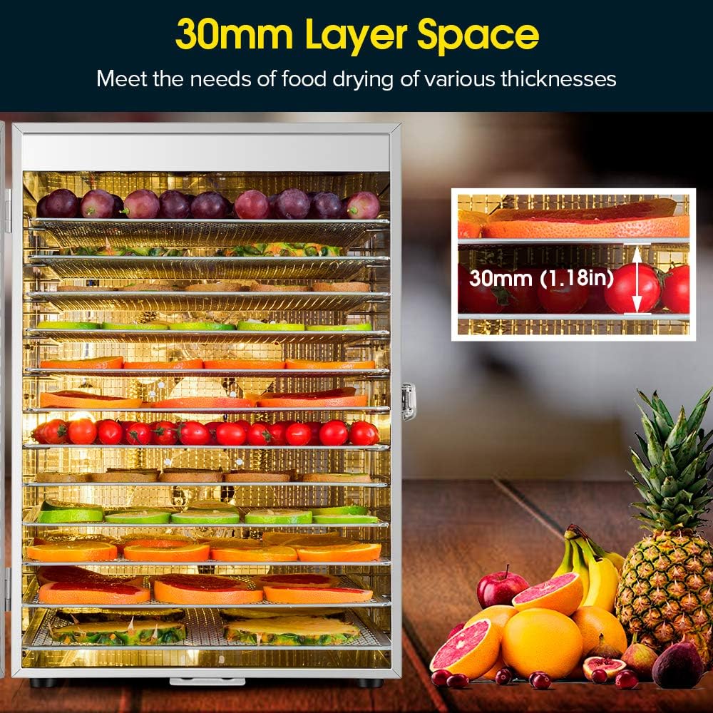 ღ【12 صينية ذات سعة كبيرة】- مع 12 صينية تجفيف متينة من الستانلس ستيل (29 × 29 سم)، كل طبقة منفصلة 3 ملم، منطقة التجفيف 1.01 متر مربع، مثالية لتجفيف مختلف الخضروات والفواكه واللحوم والأعشاب والزهور وغيرها من الأطعمة. مجفف من الستانلس ستيل لتلبية احتياجات المنازل والشركات.