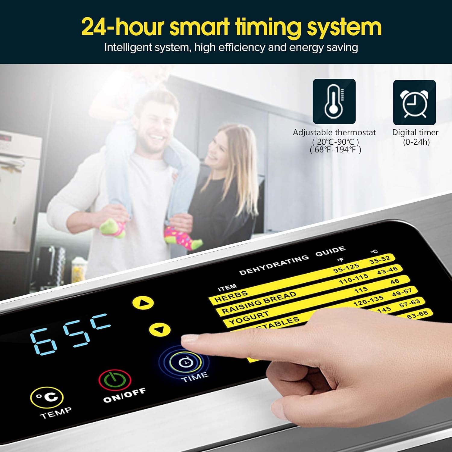 【سهل الاستخدام】يمكنك استخدام لوحة التحكم الرقمية لضبط المؤقت بزيادات من 30 دقيقة حتى 24 ساعة. قم بإعداد كميات كبيرة من الطعام المجفف في درجات حرارة دقيقة بين 20 و 90 درجة مئوية