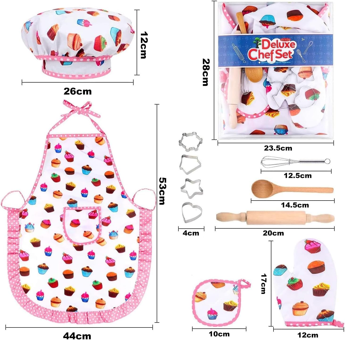 🍰【تتضمن مجموعة الطهاة للأطفال】تتضمن مجموعات الطبخ والخبز للأطفال قبعة شيف ومريلة وقفاز فرن ووسادة ساخنة وملعقة خشبية وخلاط يدوي ودبوس لف و4 قطاعات بسكويت لجميع احتياجات الطبخ والخبز للطهاة الصغار.