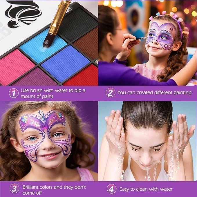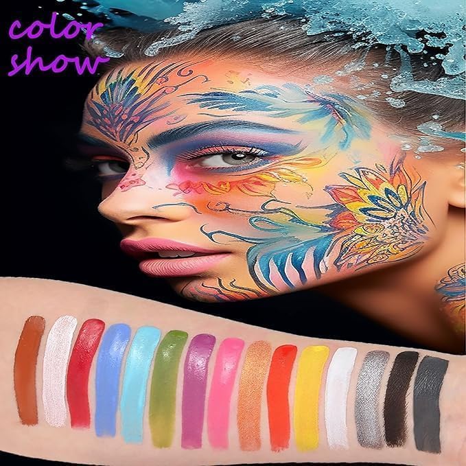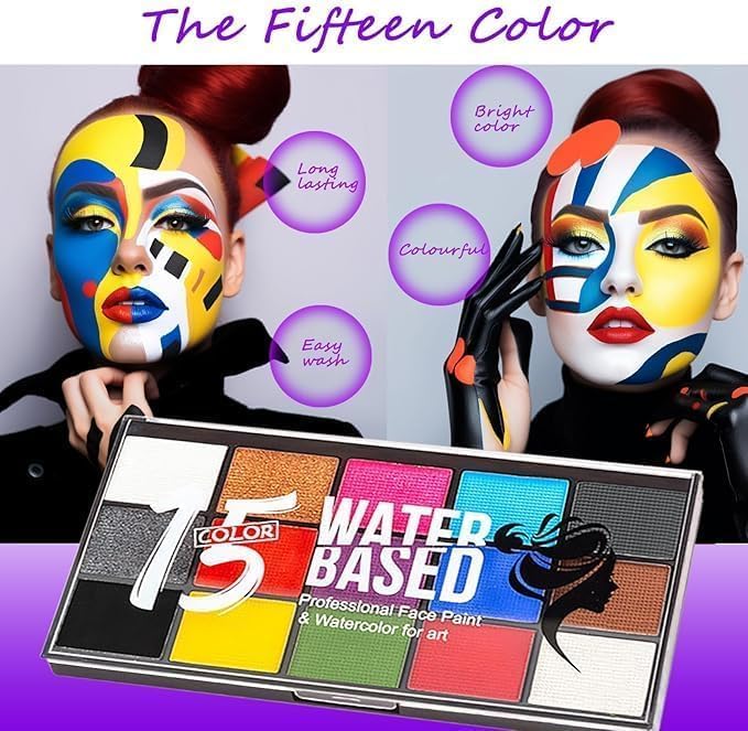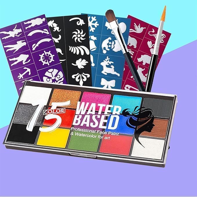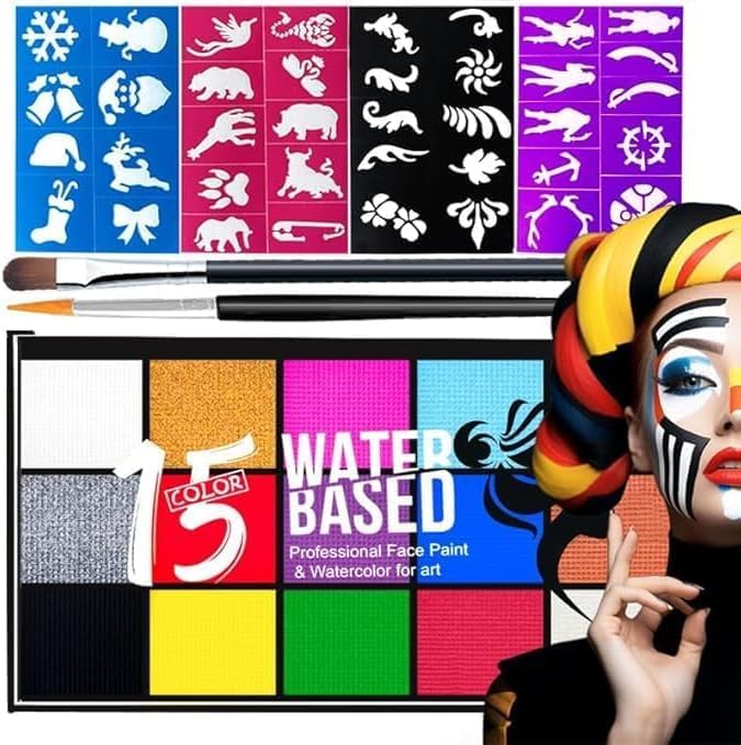 مجموعة كاملة: لوحة طلاء وجه احترافية تتميز بـ 15 لونًا نابضًا بالحياة، وتتضمن استنسل بتصميمات مختلفة وفرش احترافية لتطبيق مفصل