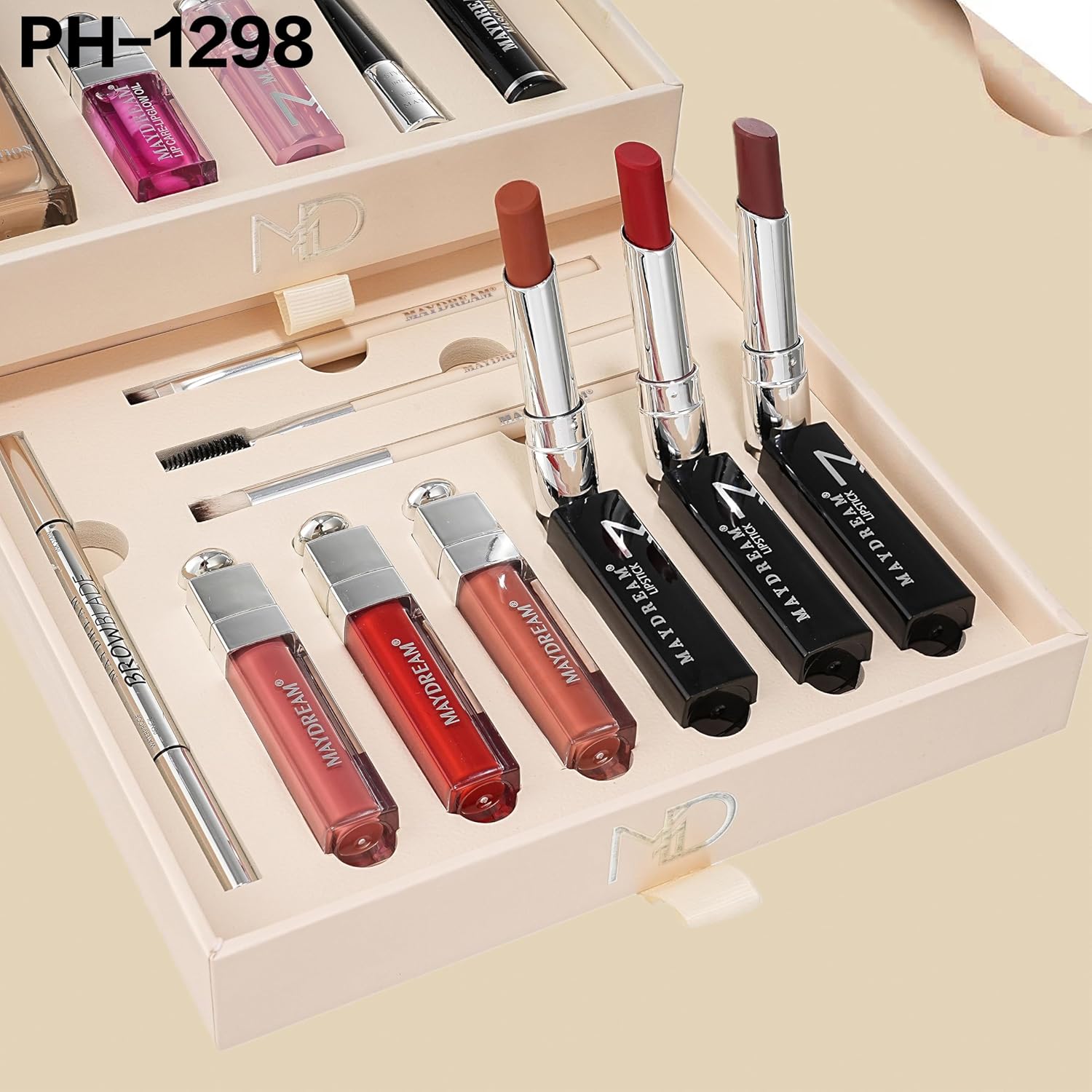 ٥) محتويات غنية: تشمل المجموعة كريم الأساس، ملمع الشفاه، أقلام الحواجب، وفرش المكياج الأساسية