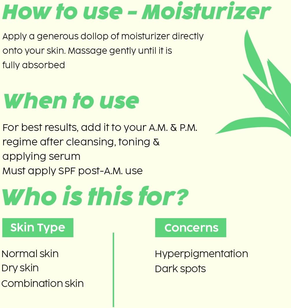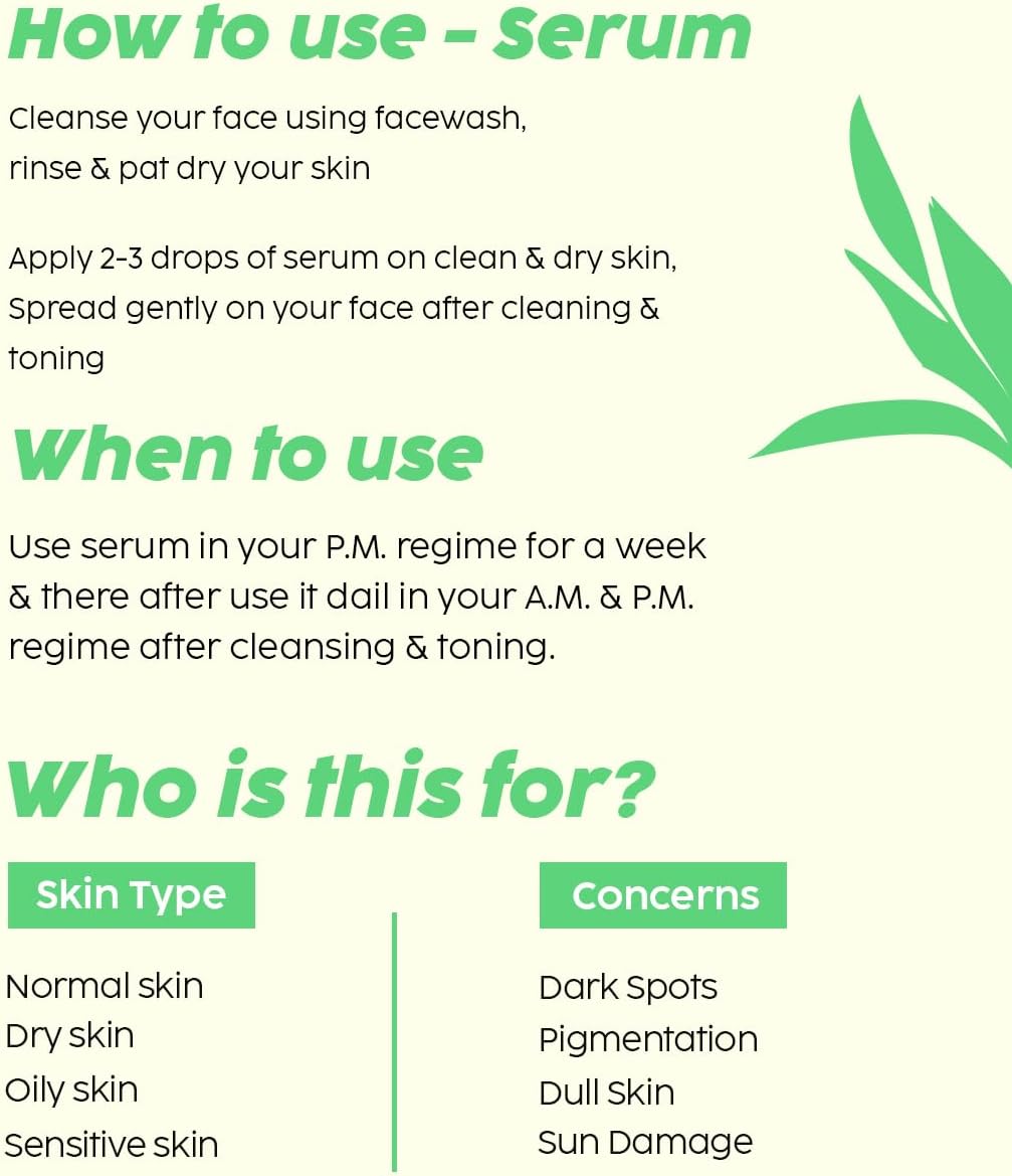 كيفية الاستخدام: ضعي 2-3 قطرات من السيروم على بشرة نظيفة وجافة. ضعيه على مناطق الاستخدام بنعومة ووزعيه بلطف على الوجه والرقبة. ضعي كمية كبيرة من المرطب مباشرة على بشرتك. دلكي بلطف حتى يتم امتصاصه بالكامل. يجب استخدام عامل الحماية من الشمس بعد استخدام ايه ام. خذي كمية وفيرة من غسول الوجه ودلكي وجهك حتى يصبح رغوة على البشرة المبللة. اشطفي وجهك جيدًا بماء نظيف وجففي وجهك بلطف. استخدمه في كل من روتين ايه ام وبي ام الخاص بك.