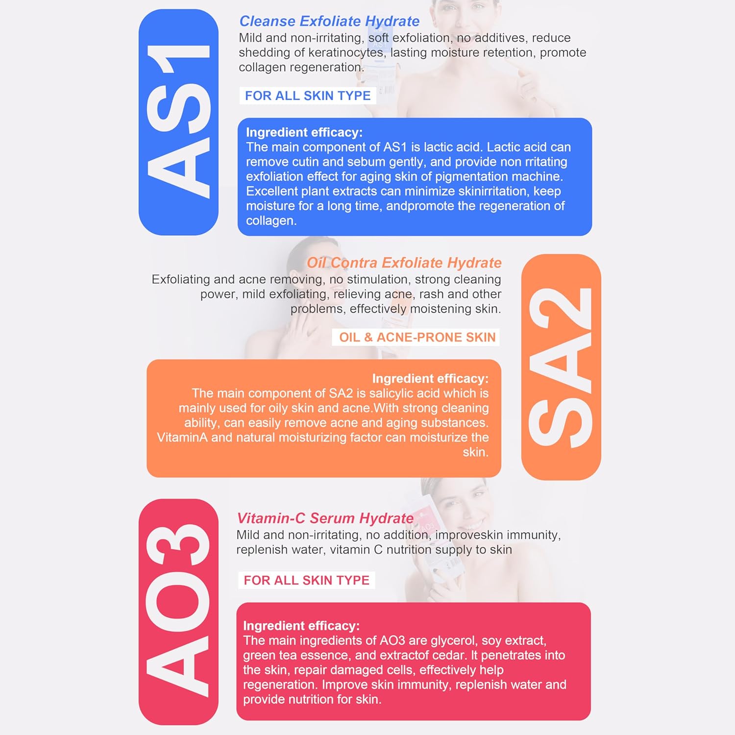 AS1 مناسب للبشرة العادية SA2 للبشرة الحساسة AO3 لجميع أنواع البشرة التي تحتاج إلى التغذية أو الترطيب AS1: مقشرات نظيفة، خفيفة وغير مهيجة، تقشير ناعم، بدون إضافة، تحفز تساقط الخلايا الكيراتينية، الاحتفاظ بالرطوبة الدائمة، تعزيز تجديد الكولاجين SA2: تقشير، لطيف وغير مهيج، قوة تنظيف قوية، قرنية خفيفة، ترطيب فعال يتأهل ويث ويسكني البشرة AO3: يرطب البشرة ويغذيها، ويزود بفيتامين سي المغذيات للبشرة، ويساعد على التجدد. استخدام واسع النطاق: يمكن استخدامه لجميع أنواع أجهزة هيدرا للوجه.