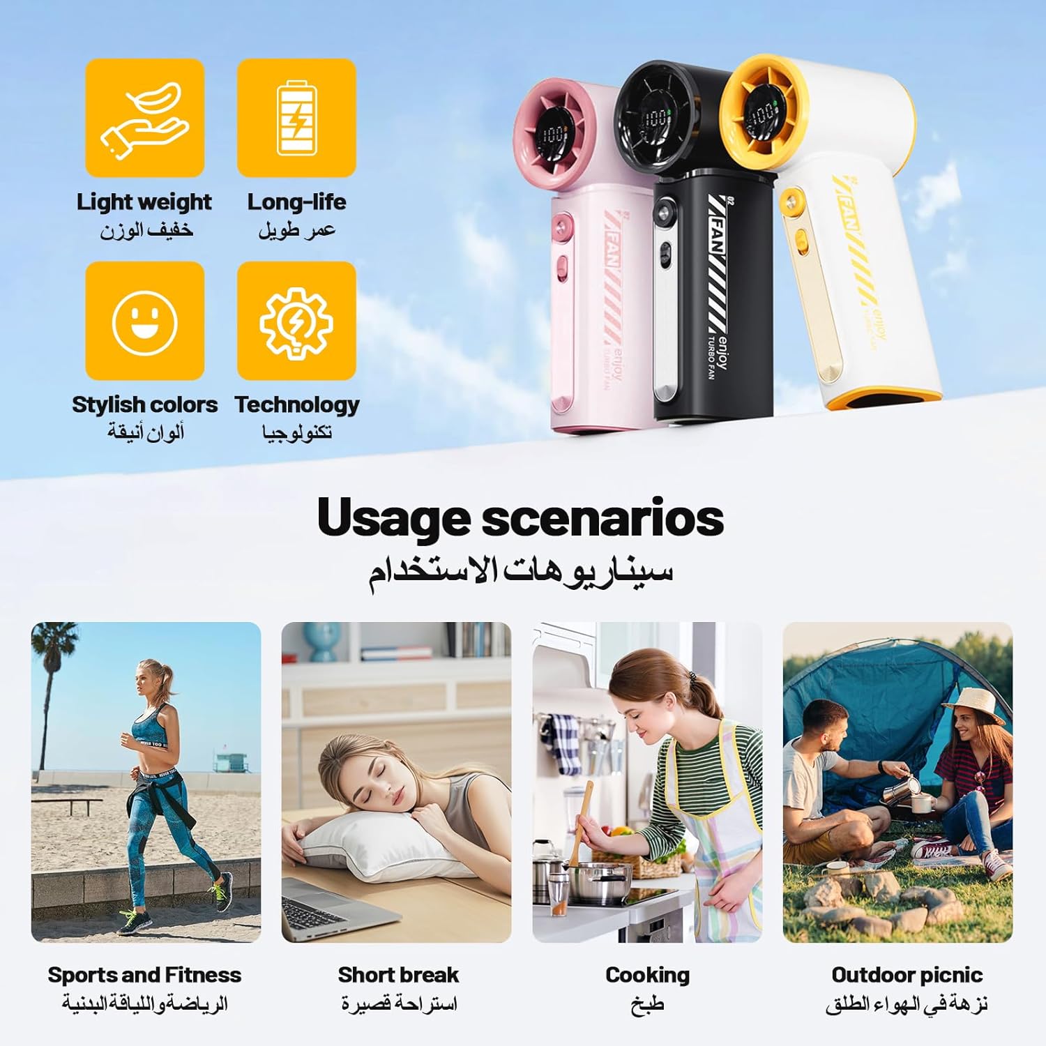 【5 سرعات قابلة للتعديل والتحكم في الرياح بدون خطوات 100 مستوى】: استمتع بتدفق الهواء الدقيق مع 5 أوضاع سرعة مضبوطة مسبقًا (منخفضة إلى توربو) وتعديل سلس بدون خطوات بـ 100 مستوى. تعرض الشاشة الرقمية الذكية السرعة في الوقت الفعلي وعمر البطارية المتبقي، مما يضمن الراحة المثلى في مناخات الشرق الأوسط الحارقة