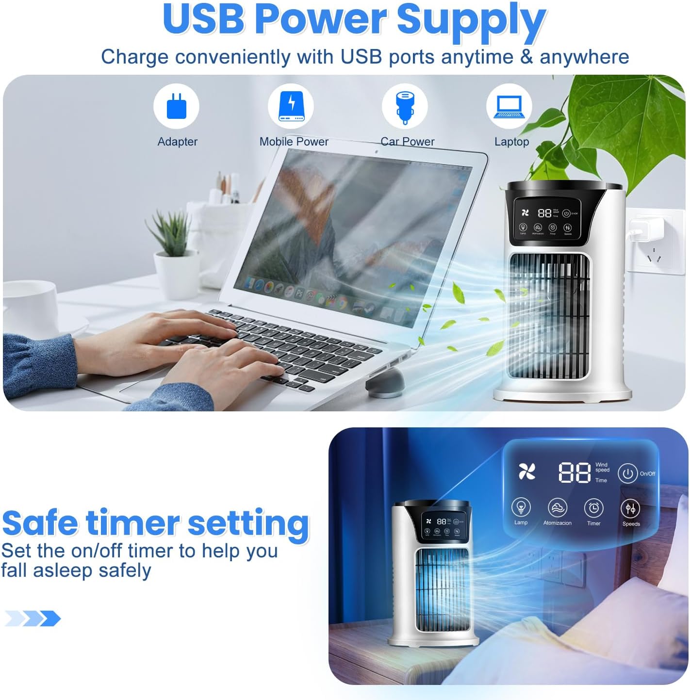 【مروحة تكييف هواء محمولة 3 في 1 للتبريد والترطيب】 وظيفة ثلاثية – يمكن استخدامها كمروحة مكتب شخصية، مبرد هواء محمول ومرطب، مثالية للاستخدام على مدار العام (التبريد والنفخ في الصيف، والترطيب في الشتاء). شحن USB، يمكن شحنها بسهولة باستخدام رأس الشحن وUSB للكمبيوتر ومصدر الطاقة المحمول وUSB للسيارة.
