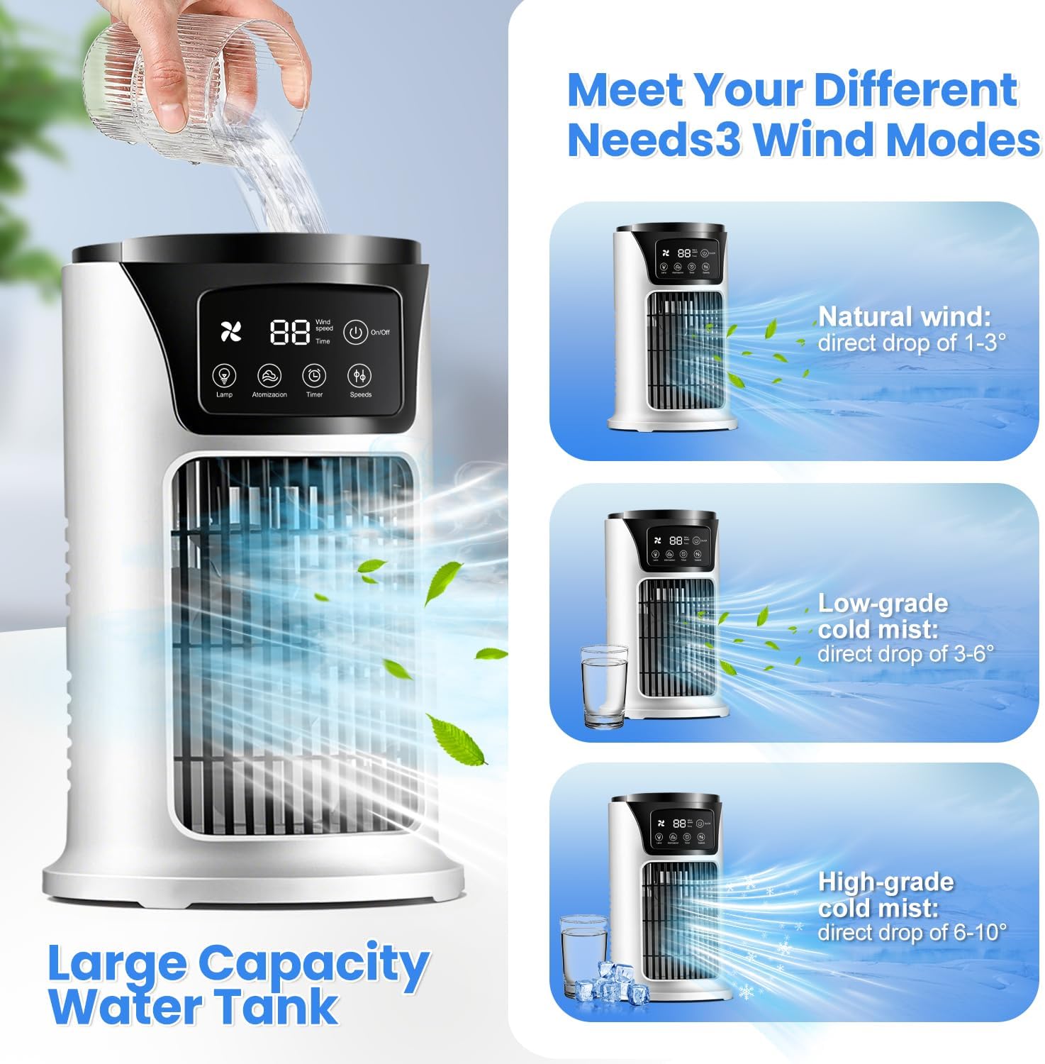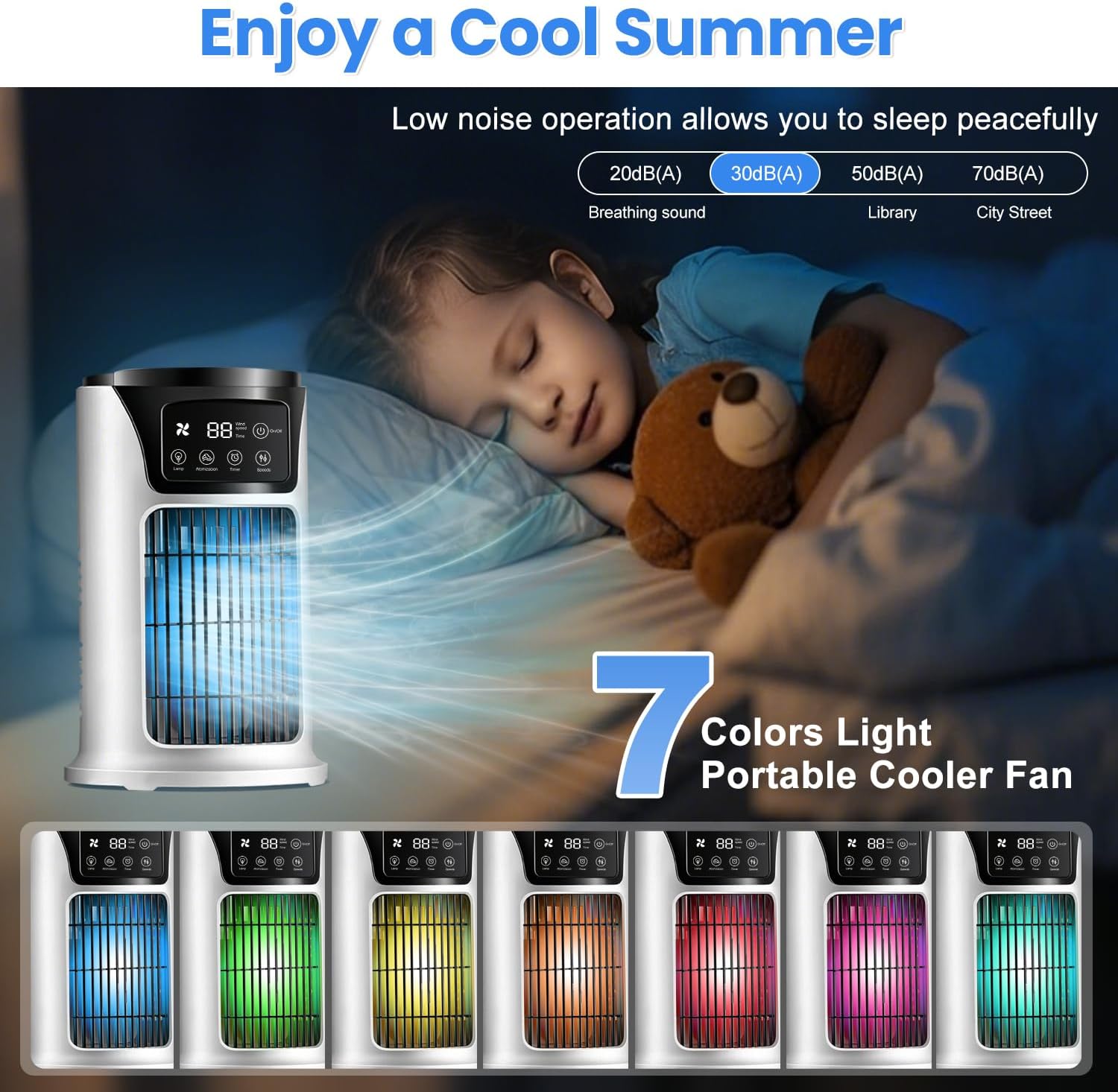 مرحبًا بك في برودة الصيف! نقدم لك مكيف هواء بارد صيفي قوي يسمح لك بالاستمتاع بالبرودة والراحة في أي وقت وفي أي مكان سواء في المنزل أو المكتب أو أثناء الأنشطة الخارجية. مروحة مكيف هواء محمولة، بـ 6 سرعات قابلة للتعديل، أضف الماء والثلج لترطيب الرذاذ، ضوضاء منخفضة، مع وظيفة المؤقت، إضاءة ليلية بـ 7 ألوان، مكيف هواء مكتب صغير لغرفة النوم والأماكن الخارجية والمكتب