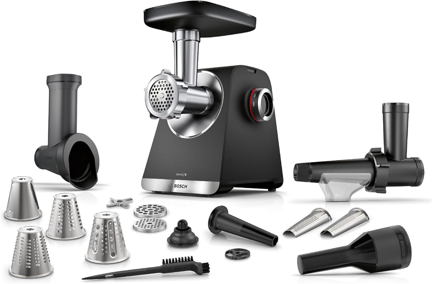 تتيح لك مفرمة اللحم القوية مالتي باور سيريز 6 من بوش مع نظام طاقة – تتكون من كتلة محرك 2100 واط ومعدات كوكبية ووصلة معدنية وسكين مزدوج الحواف – إعداد كميات كبيرة في وقت قصير على الإطلاق. بفضل الحجرة الواسعة، تقوم مفرمة اللحم بمعالجة ما يصل إلى 3.5 كجم من اللحم في الدقيقة. يضمن نظام الطاقة معالجة قوية وفعالة – حتى مع اللحوم الليفية والخضروات الصلبة. الهيكل القوي والحجرة عالية الجودة وأجزاء الطحن الدقيقة تضمن ثباتًا عاليًا وموثوقية وأمان. بالإضافة إلى ذلك، تم تصميم مفرمة اللحم هذه ليتم إصلاحها. سواء كان اللحم أو السمك أو الخضروات: يمكن معالجة كل شيء وفقًا لتفضيلاتك الخاصة في فطائر البرجر أو كرات اللحم أو الكبة أو النقانق أو السلطات أو العصائر الطازجة. يتيح لك زر التحكم الاختيار بين إعدادين للسرعة. بفضل وظيفة الإرجاع، يمكن إخراج الطعام المسدود بسهولة. • كتلة محرك قوية بقدرة 2100 واط • سعة عالية: 3.5 باوند من اللحوم في الدقيقة • حلول تخزين ذكية • إعدادين للسرعة ووظيفة الإرجاع • تتضمن الملحقات: وعاء التعبئة، المكبس، 3 أقراص مثقوبة (3، 4.5، 8 ملم)، سكين، فرشاة تنظيف، ملحق السجق، ملحق الكبة، ملحق مبشرة مع 4 براميل (قطع الجرذان الخشن الخشنة ، gr. غرامة)، ملحق عصارة