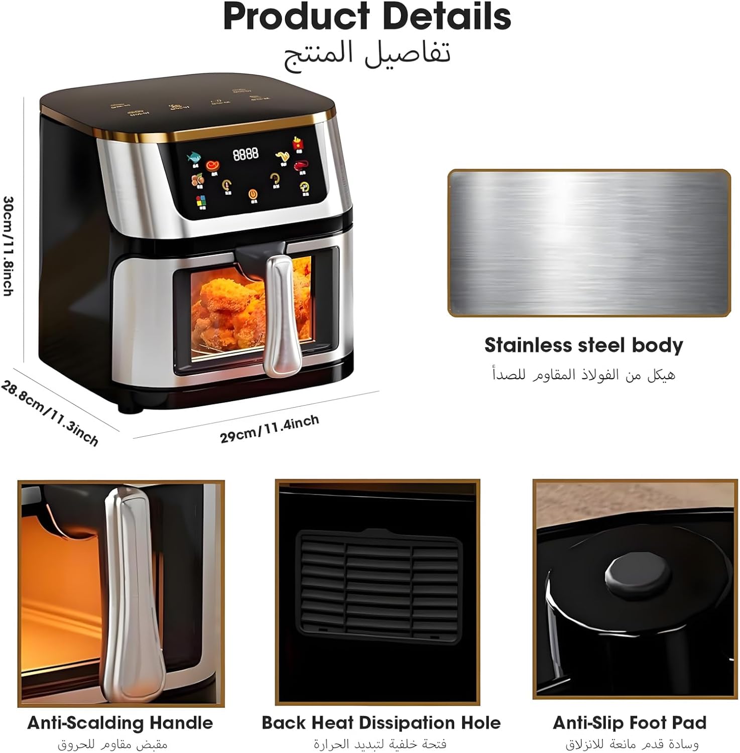 【طهي فعال】اطبخ وجباتك بسرعة وبشكل متساوٍ باستخدام تقنية دوران الهواء الساخن، وراقب تقدمك في الطهي من خلال النافذة المرئية، مما يزيد من متعة الطبخ وإنجازك. بالإضافة إلى ذلك، يمكنها أيضًا تجنب بعض مخاطر السلامة، مثل حرق الطعام أو الإفراط في الطهي.