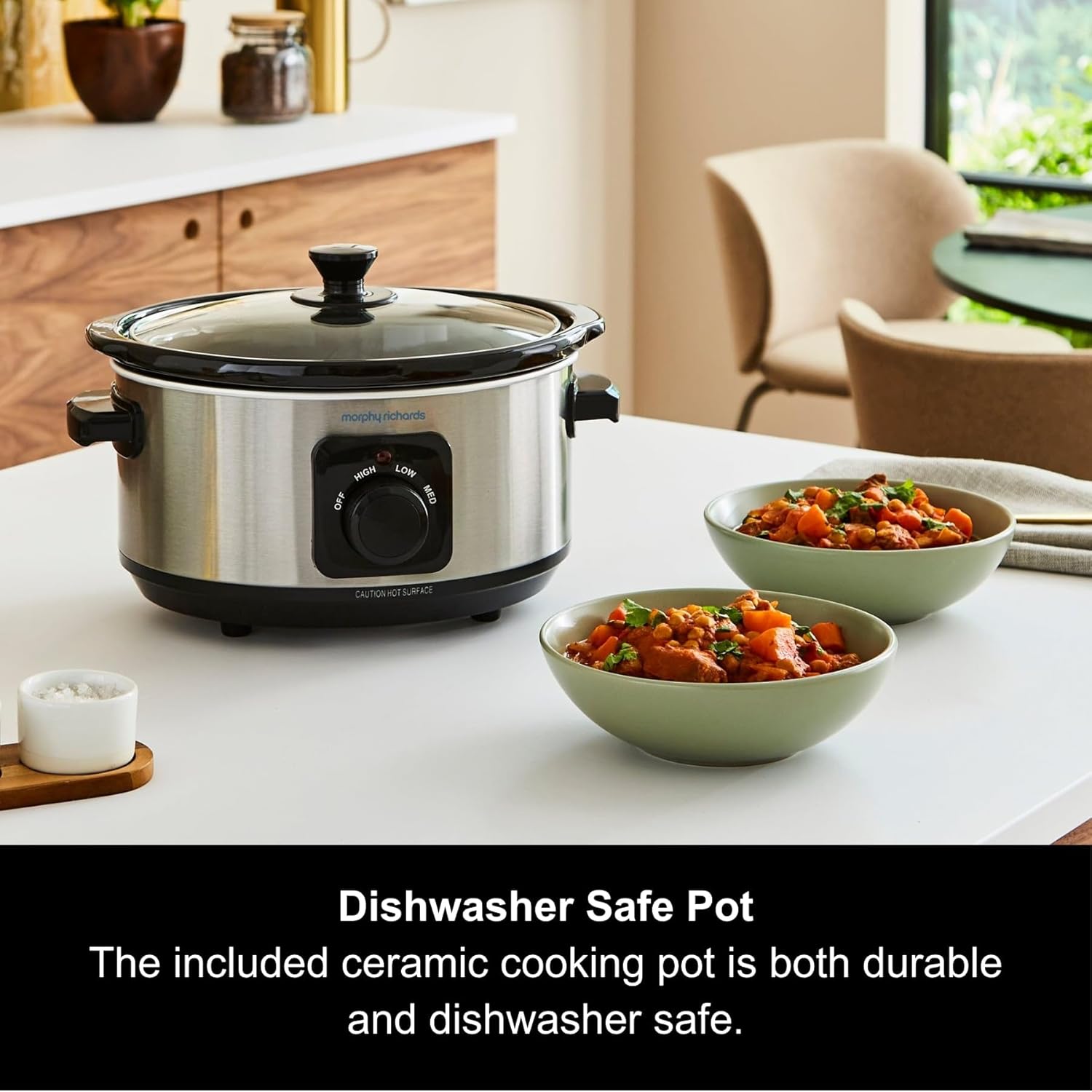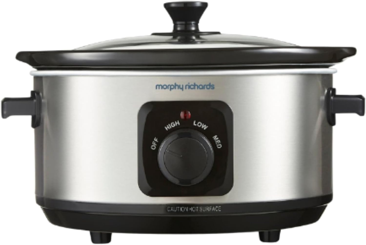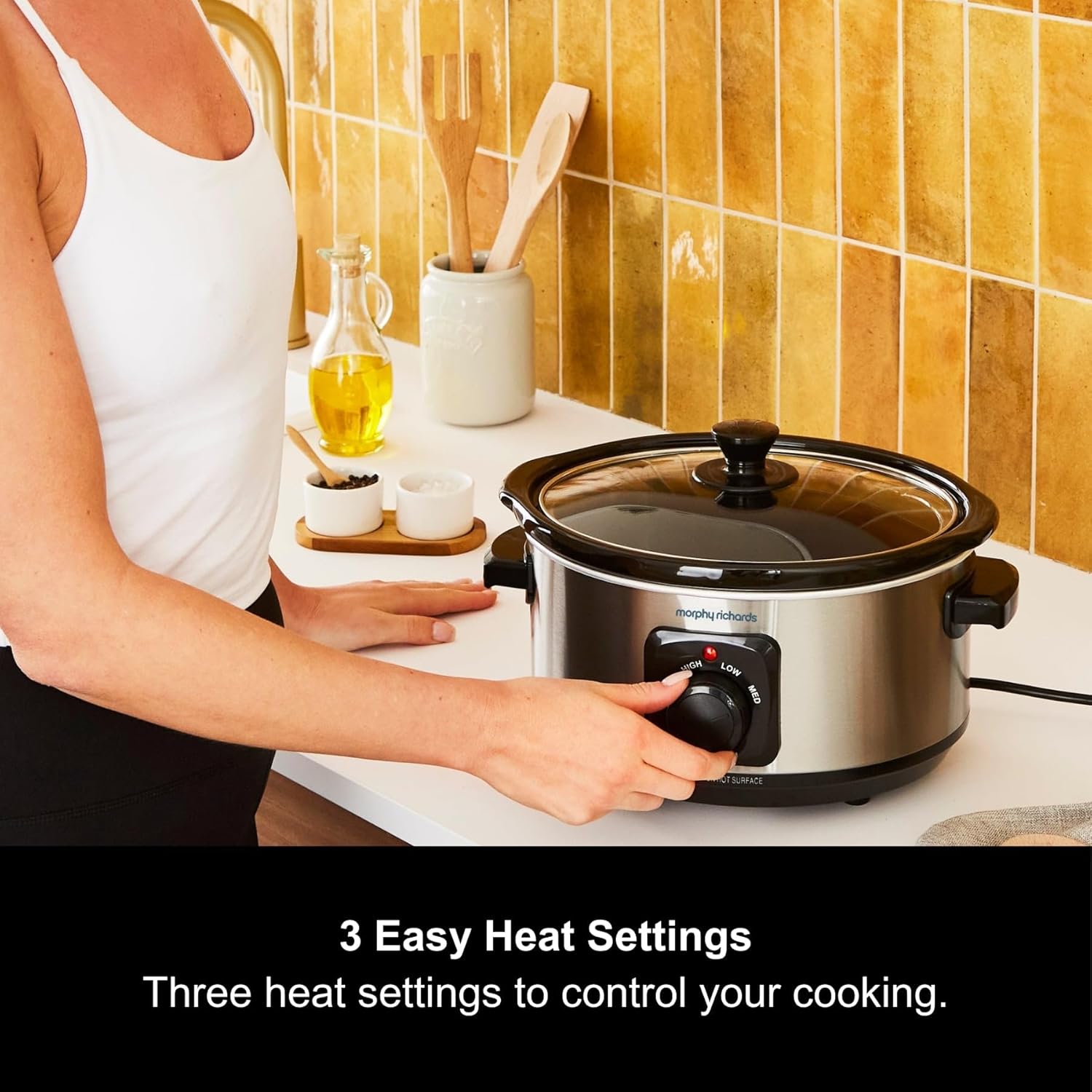 طباخ سيراميك بطيء سعة 3.5 لتر طراز 460017 مورفي ريتشارد يعد الطهي البطيء أحد أكثر طرق الطهي صحة وفعالية من حيث التكلفة. يمكن للطباخ البطيء السيراميك سعة 3.5 لتر من مورفي ريتشارد تقديم 6 حصص للمبتدئين أو 4 أطباق رئيسية بشكل مريح، مما يجعله مثاليًا للوجبات العائلية. وعاء سيراميك بيضاوي الشكل سعة 3.5 لتر مثالي لمفاصل اللحوم وكذلك الأوعية المقاومة للحرارة والكاري والفلفل الحار – مثالي للعائلة والترفيه. يسمح لك المينا سهل الاستخدام باختيار درجة حرارة الطبخ؛ منخفضة (6-12 ساعة)، متوسطة (4-10 ساعات) أو عالية (3-8 ساعات). وهذا يضمن أن وجبتك جاهزة في الوقت الذي تحتاجه. يتم تضمين مجموعة متنوعة من الوصفات في دليل تعليمات المنتج لتستمتع بها. الغطاء الزجاجي المقوى يعني أنه يمكنك مشاهدة عملية الطهي دون ترك الحرارة تهرب، كما أن وعاء السيراميك القابل للإزالة هو طبق تقديم مثالي. عند الانتهاء، ما عليك سوى وضع وعاء الطهي المصنوع من السيراميك في غسالة الصحون لسهولة التنظيف. تشمل الميزات الأخرى: مقابض ذات ملمس بارد وأقدام غير قابلة للانزلاق.