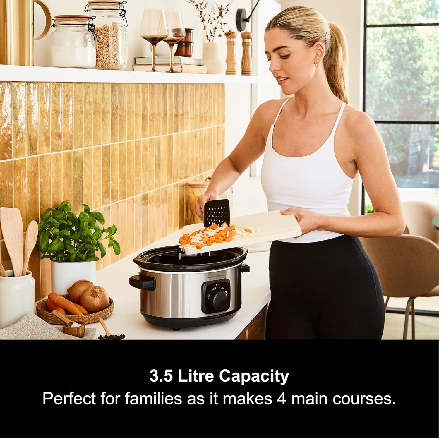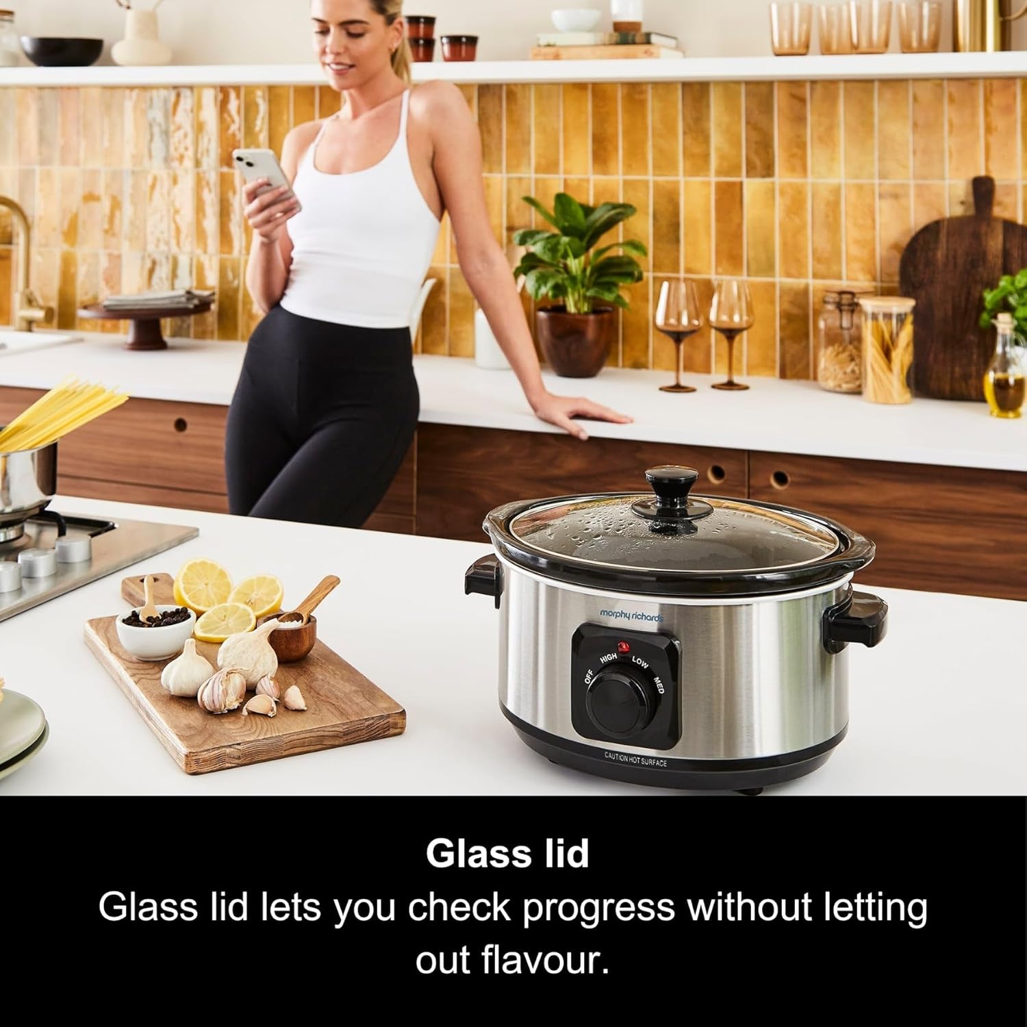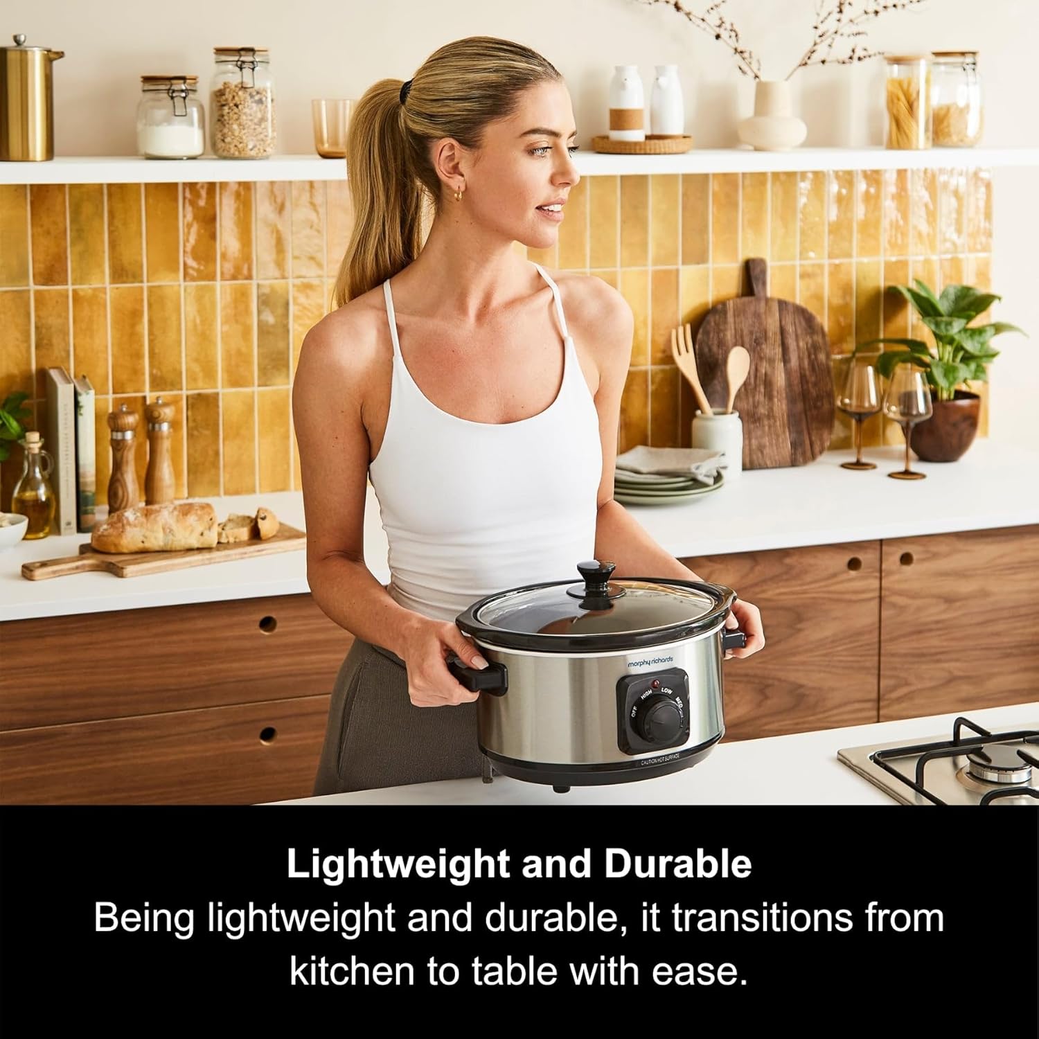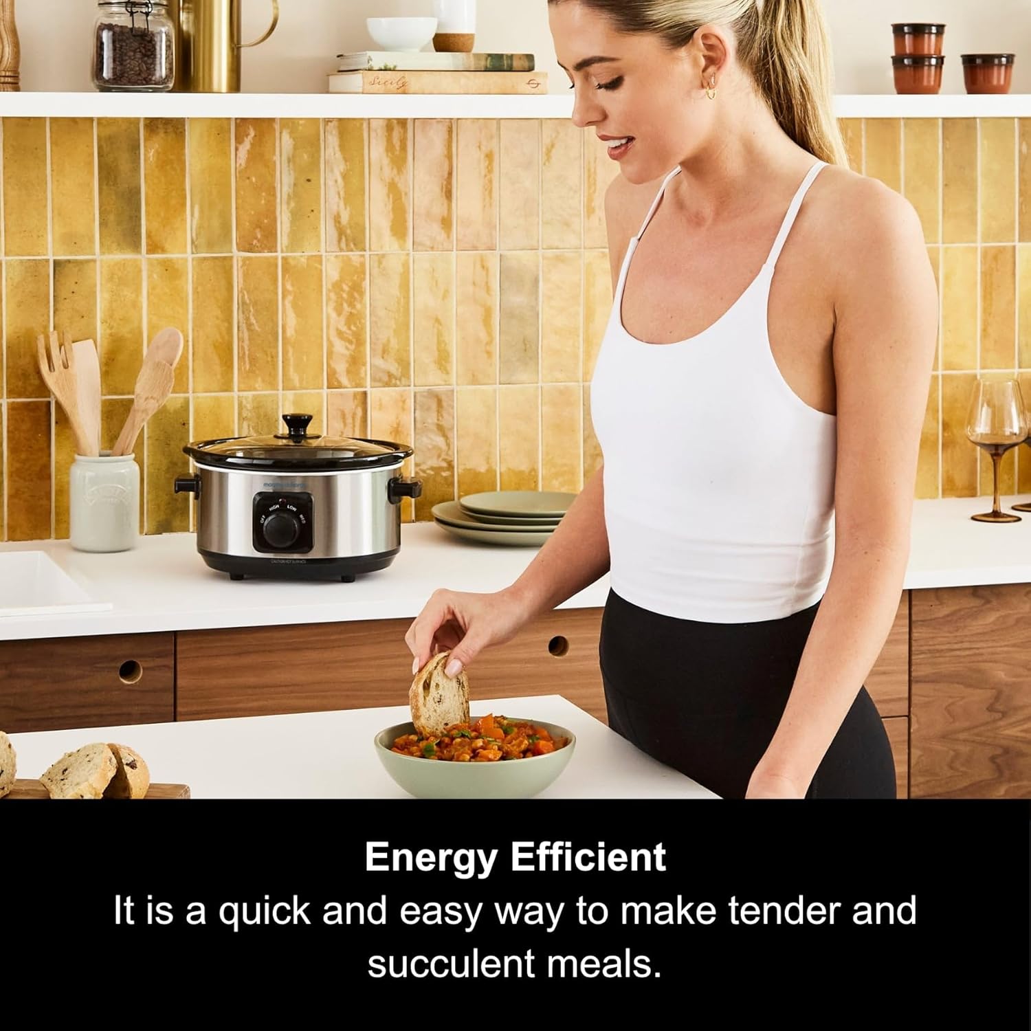 طباخ سيراميك بطيء سعة 3.5 لتر طراز 460017 مورفي ريتشارد يعد الطهي البطيء أحد أكثر طرق الطهي صحة وفعالية من حيث التكلفة. يمكن للطباخ البطيء السيراميك سعة 3.5 لتر من مورفي ريتشارد تقديم 6 حصص للمبتدئين أو 4 أطباق رئيسية بشكل مريح، مما يجعله مثاليًا للوجبات العائلية. وعاء سيراميك بيضاوي الشكل سعة 3.5 لتر مثالي لمفاصل اللحوم وكذلك الأوعية المقاومة للحرارة والكاري والفلفل الحار – مثالي للعائلة والترفيه. يسمح لك المينا سهل الاستخدام باختيار درجة حرارة الطبخ؛ منخفضة (6-12 ساعة)، متوسطة (4-10 ساعات) أو عالية (3-8 ساعات). وهذا يضمن أن وجبتك جاهزة في الوقت الذي تحتاجه. يتم تضمين مجموعة متنوعة من الوصفات في دليل تعليمات المنتج لتستمتع بها. الغطاء الزجاجي المقوى يعني أنه يمكنك مشاهدة عملية الطهي دون ترك الحرارة تهرب، كما أن وعاء السيراميك القابل للإزالة هو طبق تقديم مثالي. عند الانتهاء، ما عليك سوى وضع وعاء الطهي المصنوع من السيراميك في غسالة الصحون لسهولة التنظيف. تشمل الميزات الأخرى: مقابض ذات ملمس بارد وأقدام غير قابلة للانزلاق.