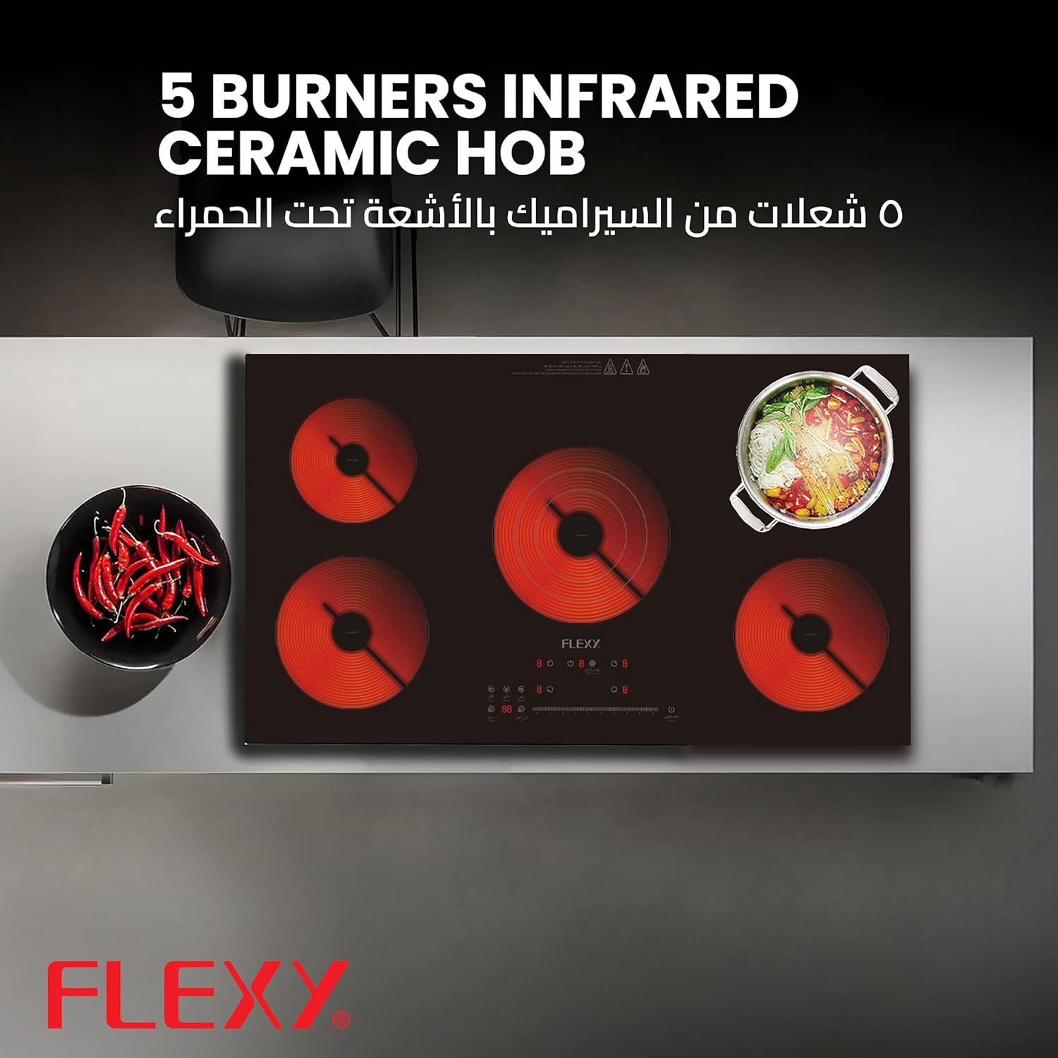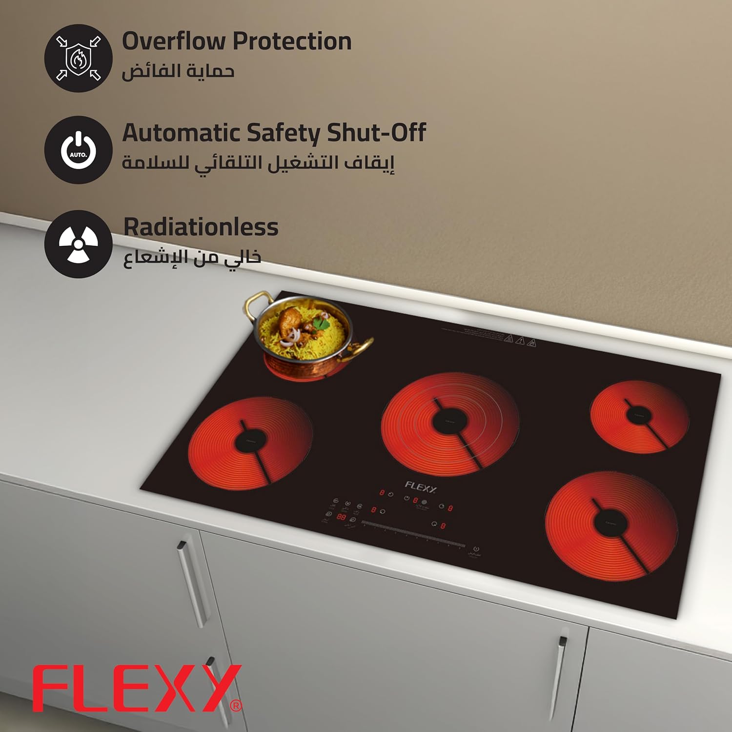 طبخ خالٍ من الإشعاع لحياة أكثر صحة: تم تصميم موقد فليكسي بـ 5 شعلات من السيراميك بالأشعة تحت الحمراء بتقنية خالية من الإشعاع، مما يضمن بيئة طهي أكثر أمانًا وصحة لك ولعائلتك. يعمل هذا الموقد السيراميكي بالأشعة تحت الحمراء عبر انتقال الحرارة بالإشعاع، مما يجعله خيارًا آمنًا وموفرًا للطاقة في آن واحد. لا يعزز عدم وجود الإشعاع جوًا أكثر صحة في مطبخك فحسب، بل يضيف أيضًا طبقة إضافية من الأمان، خاصة للمنازل التي بها أطفال أو حيوانات أليفة. استمتع بالطهي براحة البال، مع العلم أن هذا الجهاز يعطي الأولوية لرفاهيتك.