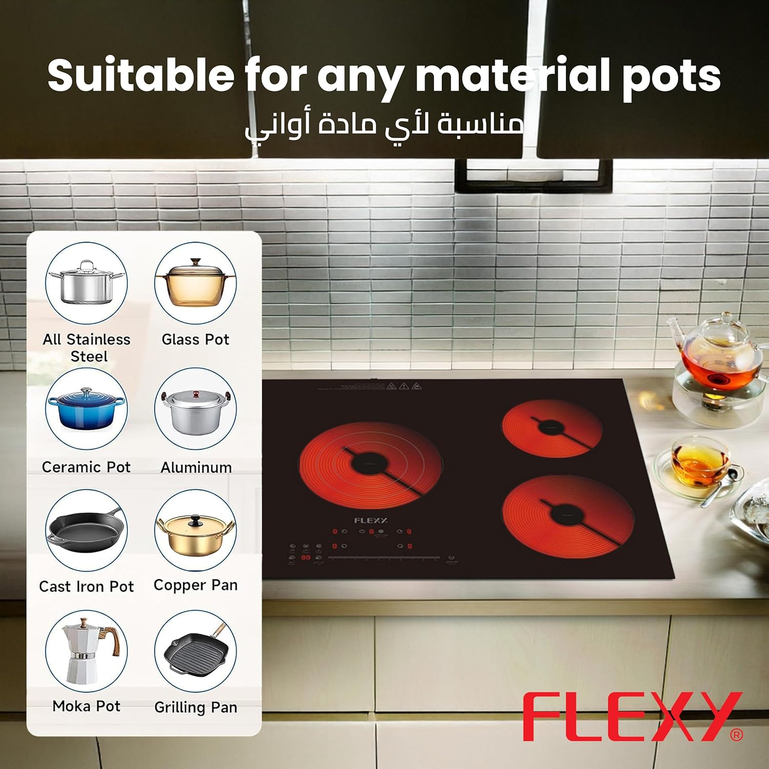 توافق شامل للأواني للطهي متعدد الاستخدامات: تتمثل إحدى الفوائد الرئيسية لموقد السيراميك بالأشعة تحت الحمراء ذو 5 شعلات من فليكسي في توافقه مع أي نوع من أواني الطهي تقريبًا. سواء كنت تفضل استخدام أواني الفولاذ المقاوم للصدأ أو الحديد المصبوب أو الألومنيوم، فإن هذا الموقد يعمل بسلاسة مع جميع المواد. يسمح لك سطح الطهي متعدد الاستخدامات باستخدام الأواني والمقالي المفضلة لديك، دون الحاجة إلى أواني طهي محددة، مما يجعلها مريحة للغاية وفعالة من حيث التكلفة. يوفر المرونة لاستخدام ما لديك في المنزل، مما يوفر لك متاعب الاضطرار إلى شراء أواني أو مقالي مخصصة لتتناسب مع الموقد.