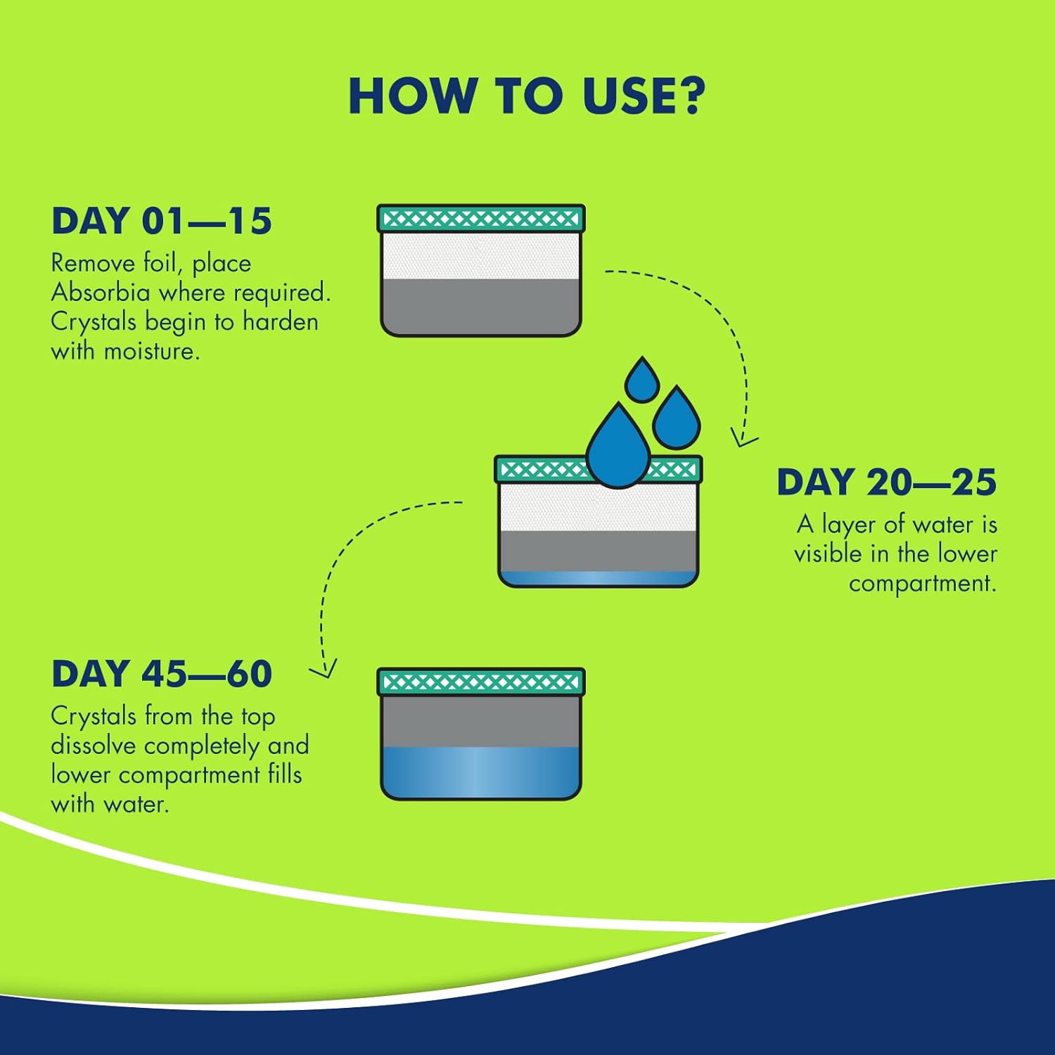 NO MORE EXCESS MOISTURE – Absorbia is a dehumidifier that gets rid off excess moisture and dampness. It will keep your products, especially electronics and other valuables fresh, safe and dry.;FIGHTS OFF MOULD & FUNGUS – Absorbia is the ideal room dehumidifier for your home. The crystals in the products absorb excess moisture and prevent mould, fungus, mildew & allergens;HOW TO USE – Simply remove the aluminum foil cover, leaving the white filter below intact. Place the box as desired, and res