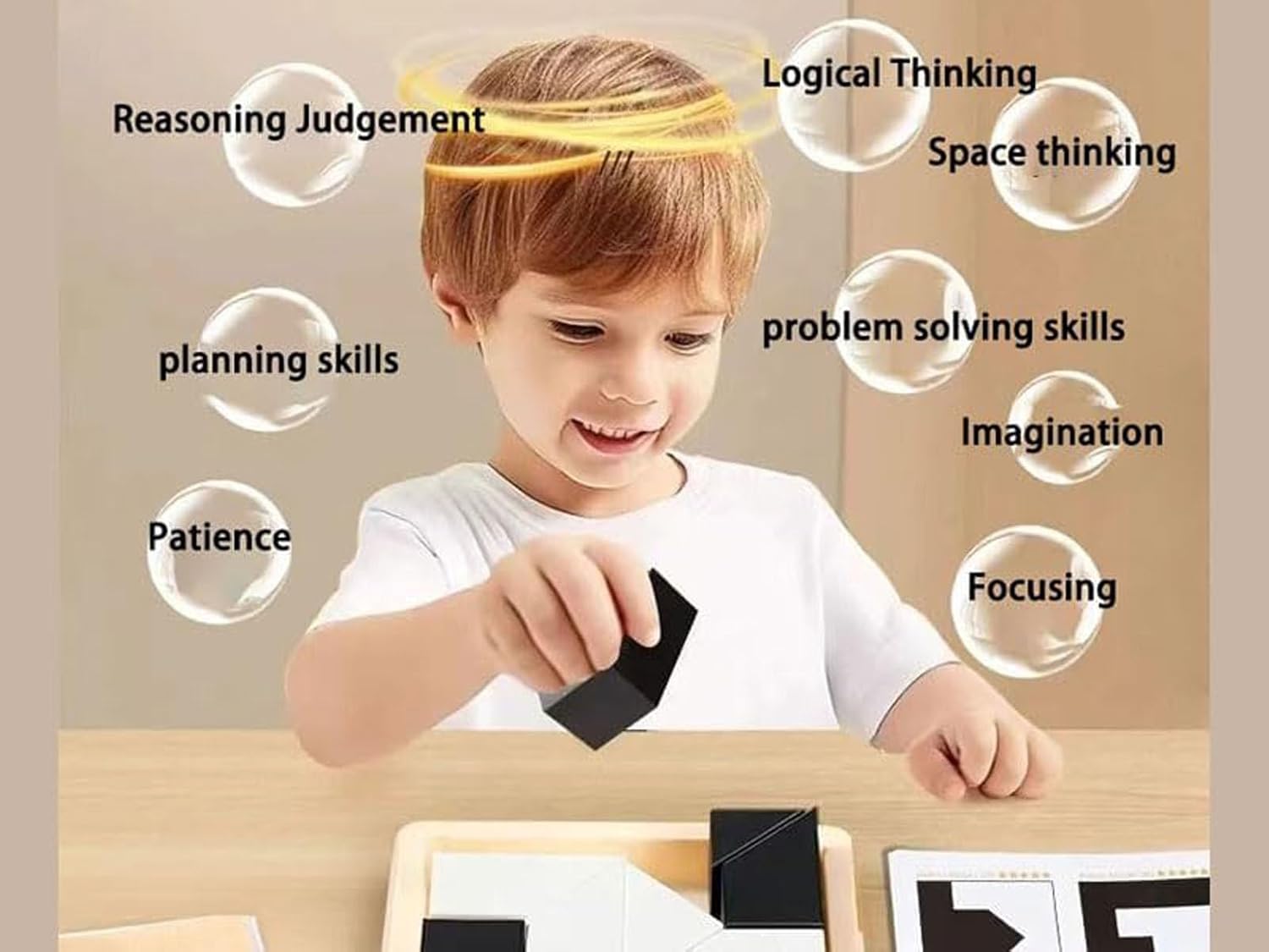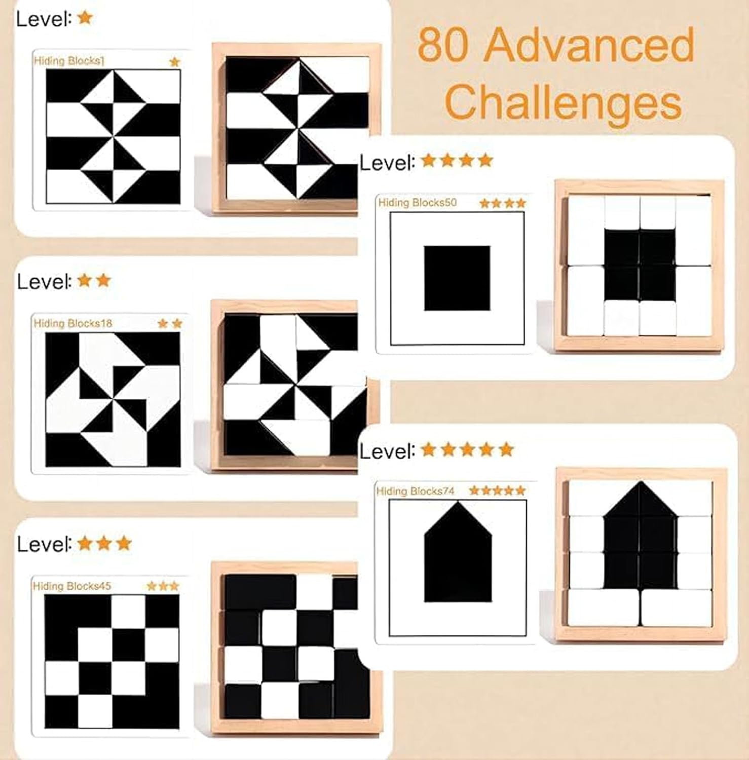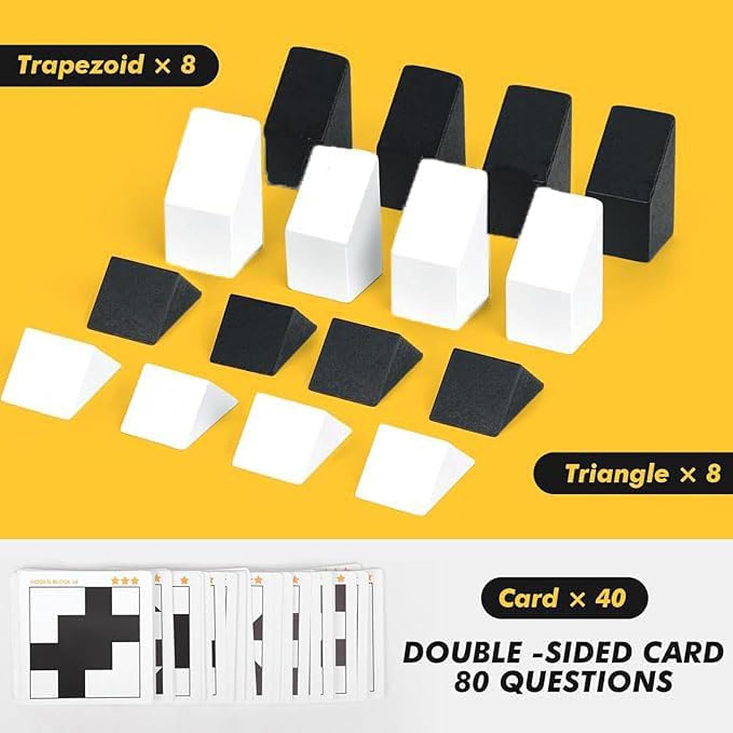 4. Set up the brain puzzles for kids as shown on the Flash cards, the goal is to put the white and black blocks to form the patterns. Although there are only two colors and two shapes of building blocks, there are different ways to complete a pattern through hiding blocks. How To Hide is this IQ toy’s challenge. This is the uniqueness of our brain teasers toy.There are 8 trapezoids and 8 triangles to choose from in the Assembly puzzles. Kids can explore different combinations and unlock fun hidden blocks images.By exploring different puzzle board combinations, kids can unleash their creativity and imagination.