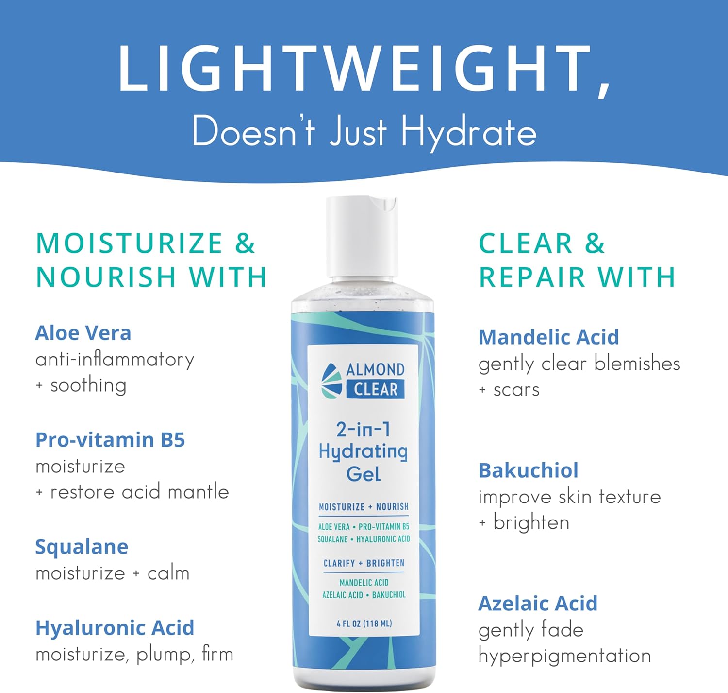 CLARIFY & BRIGHTEN: Formulated to fight acne and folliculitis and brighten & smooth the skin with Mandelic acid, Bakuchiol, and Azelaic acid. This mattifying gel improves the clarity and tone of your skin over time.