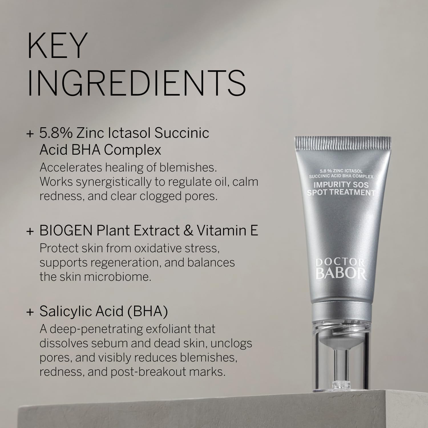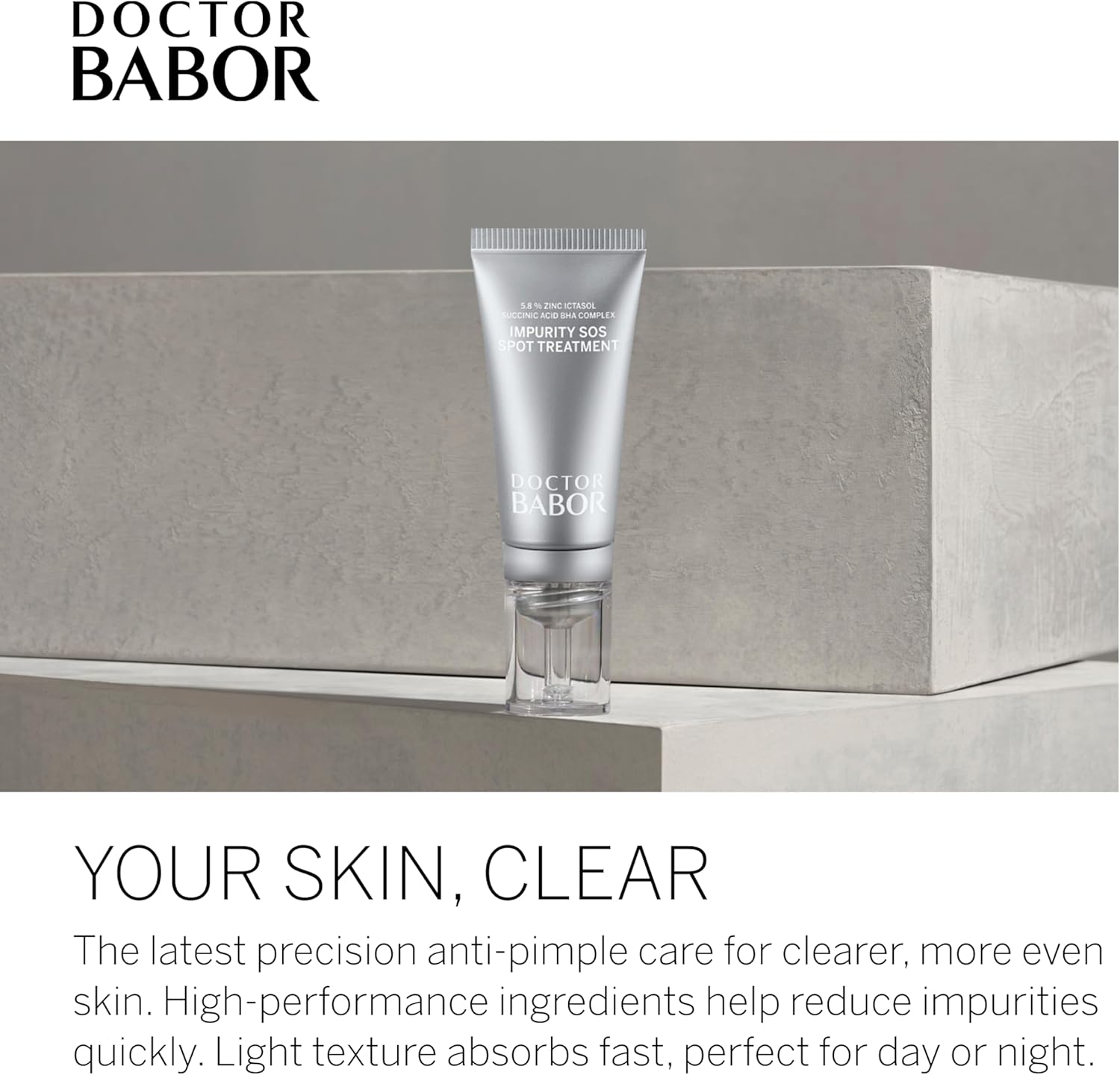 Experience immediate help for spots with the DOCTOR BABOR CLARIFYING Impurity SOS Spot Treatment, the must-have for blemishes. With a 3.7% zinc-succinic acid complex, it specifically combats spots for a clean and even complexion.