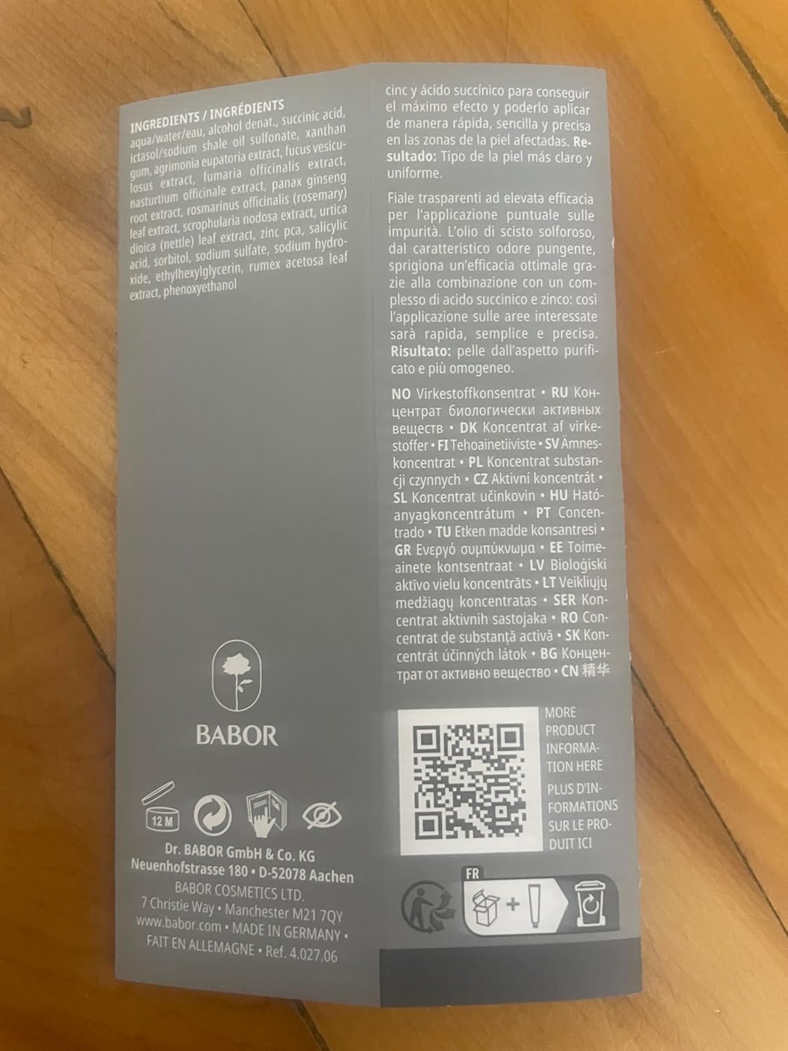 DOCTOR BABOR Impurity SOS Spot Treatment is an effective solution for anyone struggling with blemishes. This fragrance-free, transparent, highly concentrated active ingredient concentrate was specially developed for the spot treatment of pimples. The effective formulation not only reduces pimple breakouts immediately, but also prevents new breakouts and, with regular use, treats the after-effects such as pimple marks in the long term to improve the skin’s appearance. It also regulates sebum production, normalises pore size and rebalances the microbiome. This solution combines the effect of sulphonated shale oil with a 3.7% zinc-succinic acid complex to combat existing impurities quickly and precisely. The result is clarified and more even skin. Thanks to its vegan and highly concentrated formulation, the Spot Treatment is particularly effective. BABOR not only respects the needs of your skin, but also the environment. The products stand for ‘clean beauty’, without harmful additives such as parabens, silicones or microplastics. BABOR’s commitment to sustainability and performance ensures that with the Impurity SOS Spot Treatment, you are choosing skincare that is free from unnecessary additives while delivering effective results. With BABOR, you are choosing a brand that harmonises quality, luxury and responsible action.