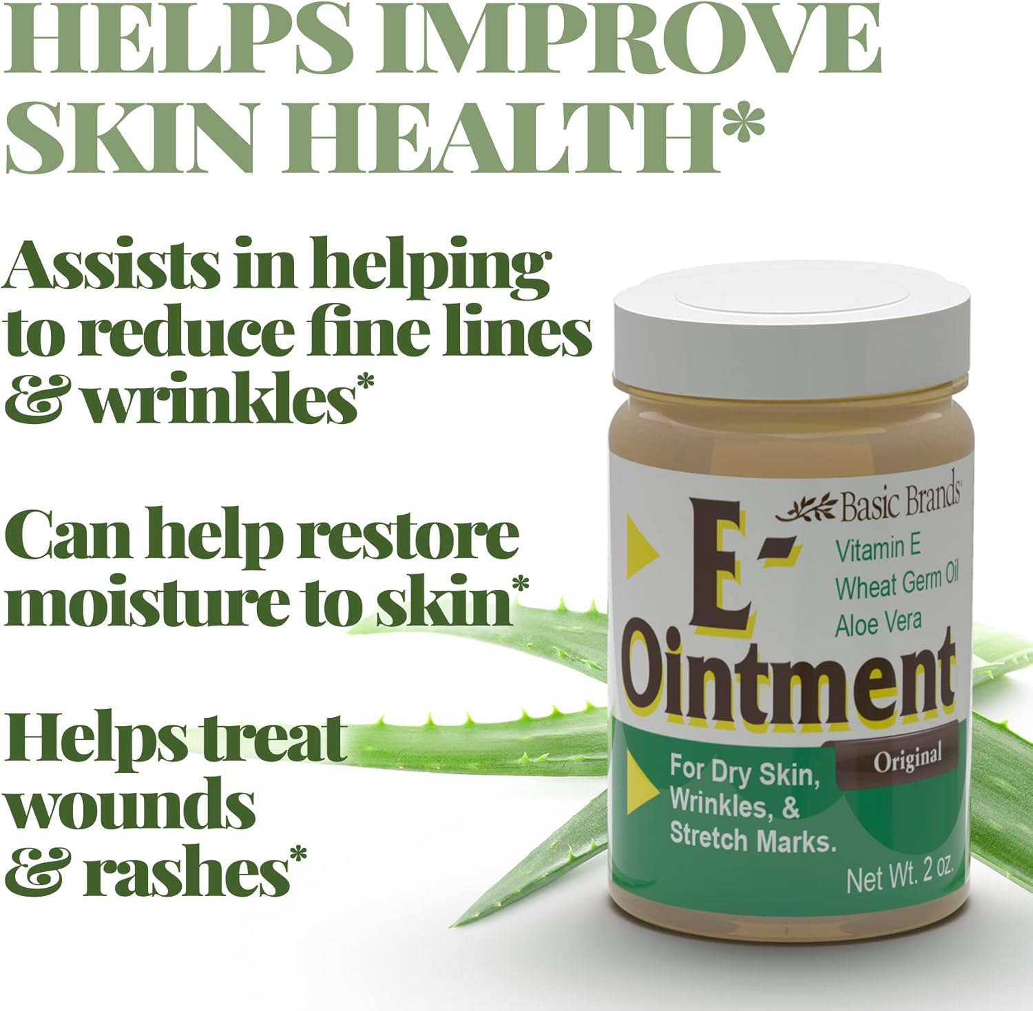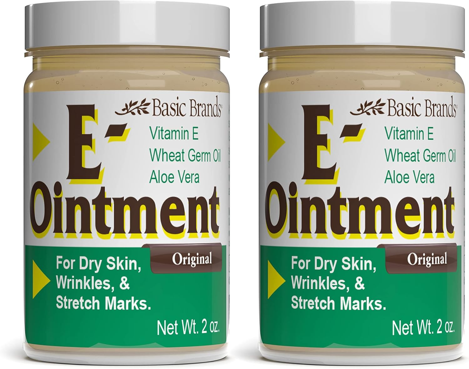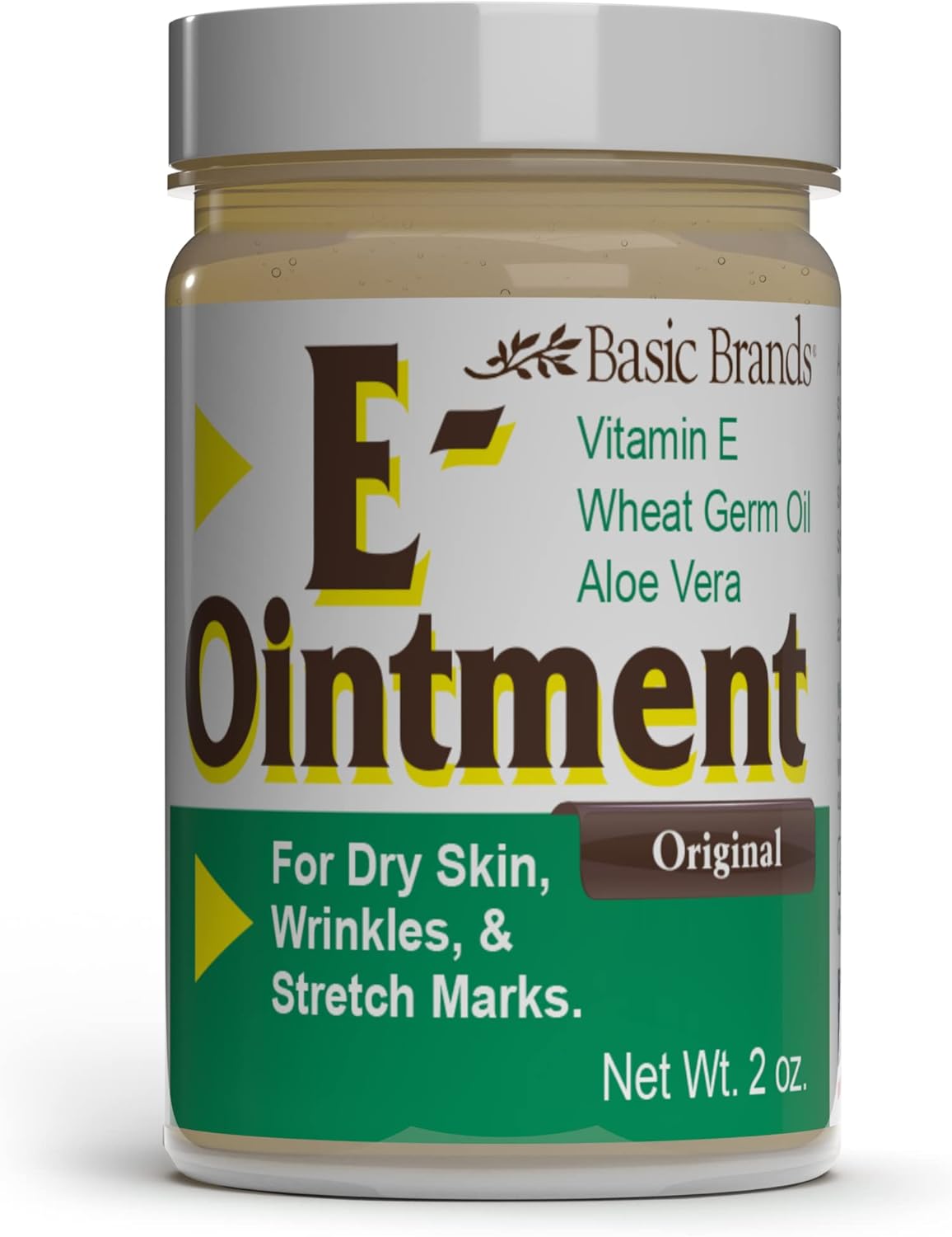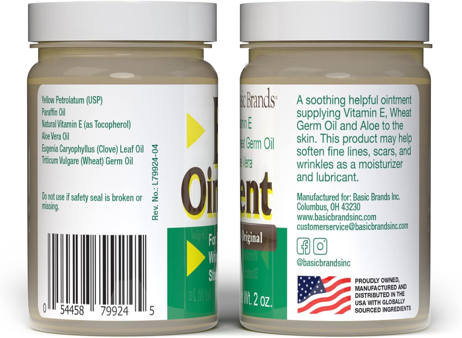 Vitamin E is a natural antioxidant that protects tissue from damage caused by free radicals. Basic Brands Vitamin E ointment includes moisture enhancing Vitamin E, aloe vera, and skin repairing wheat germ oil. Vitamin E ointment has many benefits to skin, including helping to reduce the appearance of fine lines, wrinkles and sun spots, increasing and restoring moisture to your skin to help improve elasticity, is beneficial for rashes, helps reduce the appearance of stretch marks, and more. It also helps to strengthen brittle nails and improves the health of hair. Our Vitamin E Ointment can also be used in one’s nightly skincare routine to remove makeup.