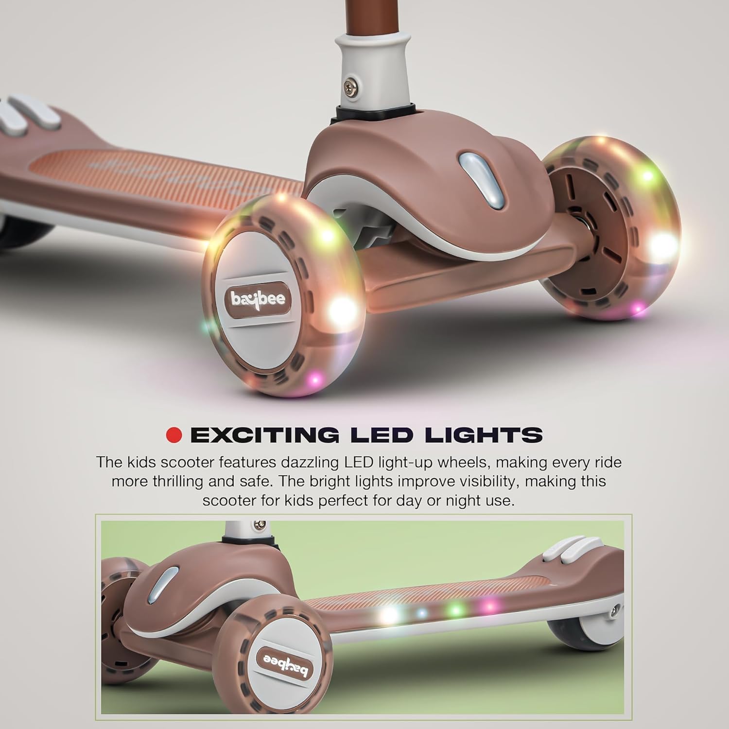 🚦 Exciting LED Light-Up Wheels for Added Fun : The kids scooter features dazzling LED light-up wheels, making every ride more thrilling and safe. The bright lights not only add fun but also improve visibility, making this scooter for kids perfect for day or night use.