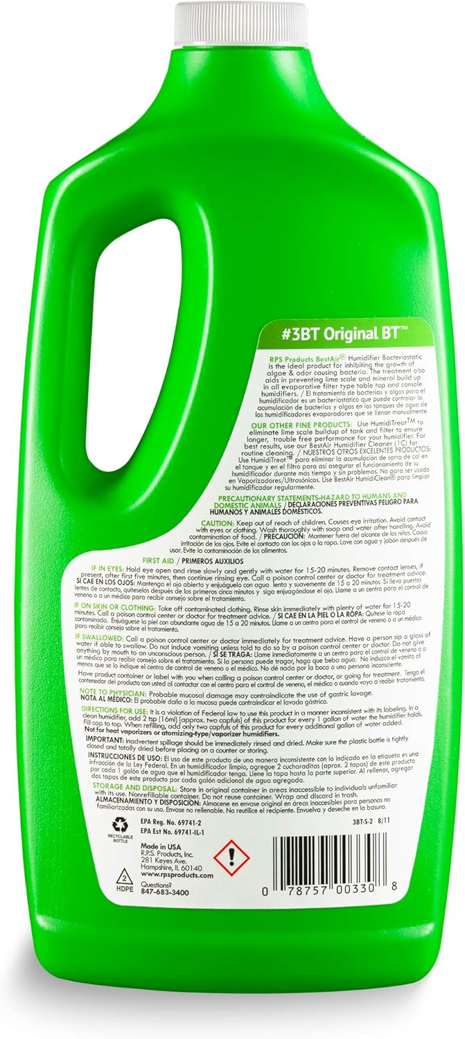 The BEST-AIR-3BT is a bacteriostatic water treatment product that helps to inhibit the growth of bacteria, mildew, and mold from growing on your humidifier filter. Used with evaporating humidifiers, not vaporizers, this product will reduce the bacterial growth on your filter and allow your machine to produce fresher smelling air. Without treatment humidifiers can become a breeding ground of mildew, algae, and mold growth with contributes to unusual odor and potentially harmful contaminant distribution. Protecting your filters also affords increased efficiency and filter life. Order your BestAir Humidifier Bacteriostatic Water Treatment today!