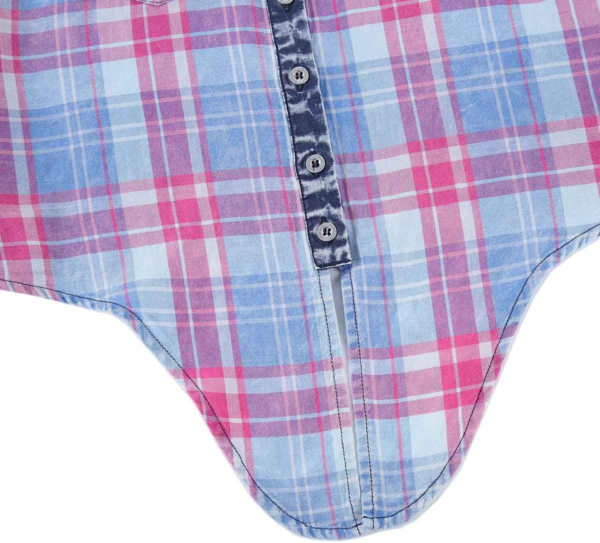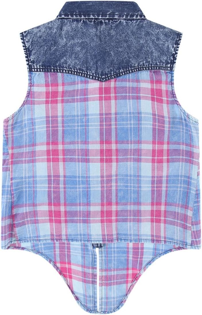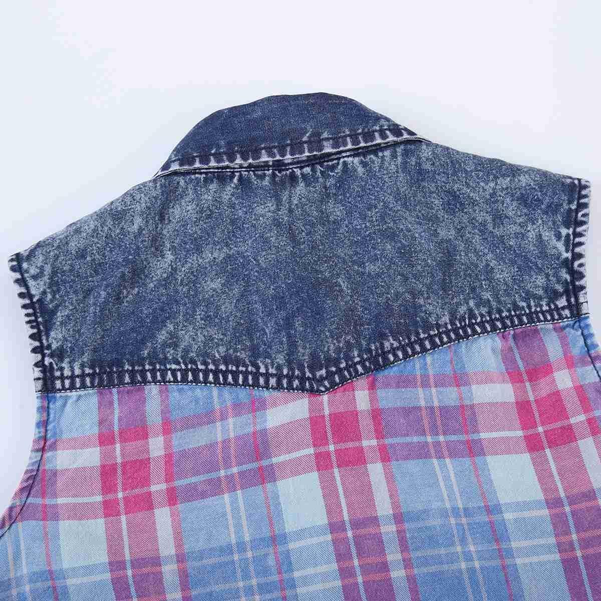 This vintage inspired tank top features a stylish patchwork design with plaid and denim accents, giving it a unique and fashionable look. Its crop length and front tie detail add a touch of cowgirl charm.