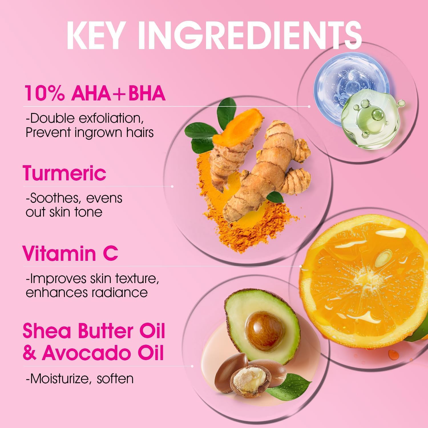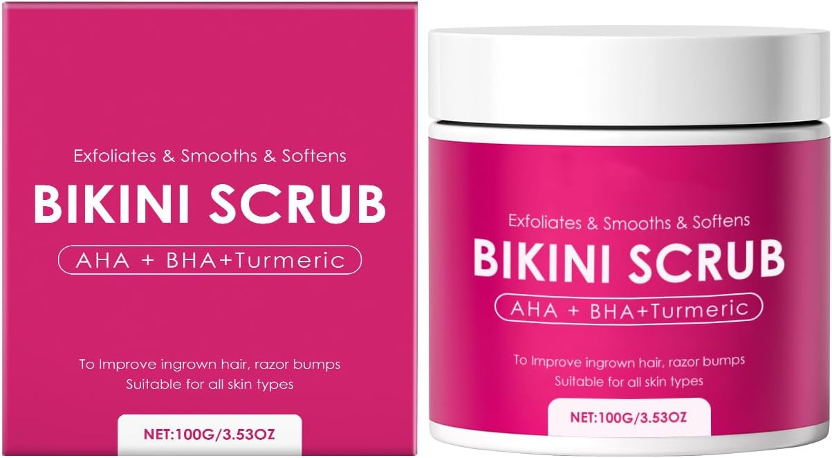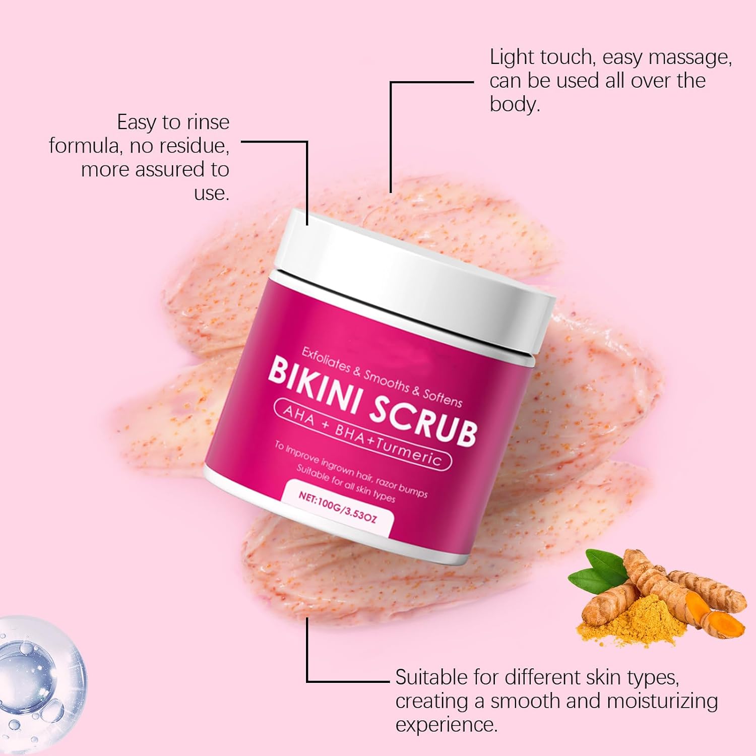 【POWERFUL INGREDIENTS】Our bikini scrub is infused with 8% Glycolic Acid (AHA) & 2% Salicylic Acid (BHA), Walnut Shell Powder to gently sloughs away dead skin cells, Turmeric and Vitamin C to even skin tone, and Shea Butter & Avocado Oil to soothe and nourish. Helps reduce ingrown hairs and razor bumps to reveal irresistibly soft skin