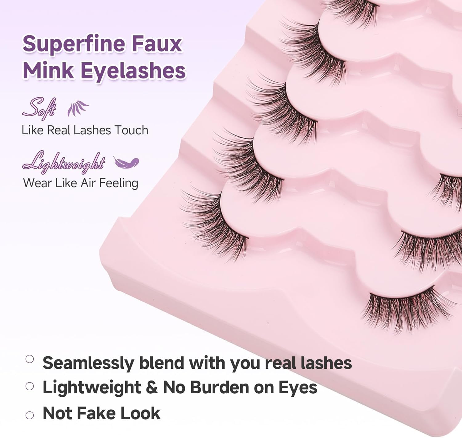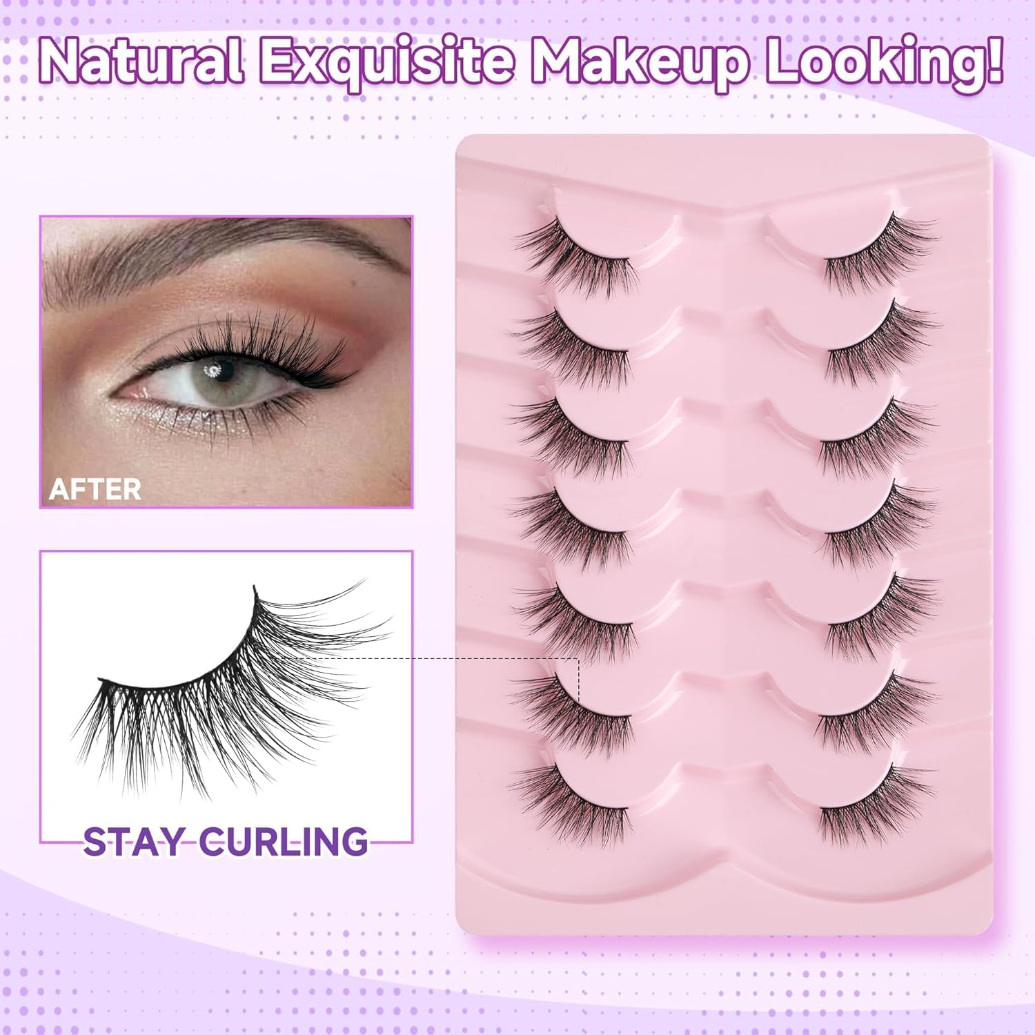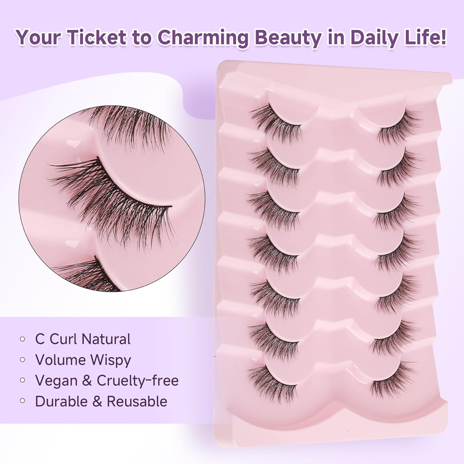 Reusable: 7 pairs false eyelashes pack. The fake eyelashes use ultra-light synthetic fibers, cruelty-free, skin friendly. Bring pretty natural lash extensions look without damaging your own eyelashes, suit for DAY-TO-DAY use, wedding, vacation and so on