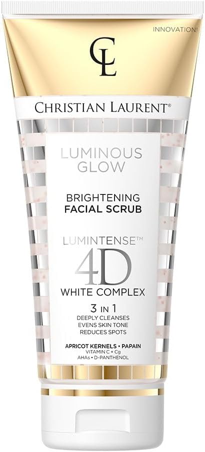 Brightening Facial Scrub 200ML This scrub is based on apricot kernel particles and papain, deeply purifies the skin, unclogs pores and minimizes their visibility. Effectively exfoliates dead epidermis, brightening the complexion and improving condition of the skin. CHRISTIAN LAURENT LUMINOUS GLOW is the luxury brightening and repair program focused on the advanced skin care and giving the skin the desired even tone and healthy glow. The use of Lumintense 4D White Complex activates the potential of synergistically acting ingredients with proven depigmentation properties: (arbutin, glutathione and niacinamide), ensuring MULTIDIMENSIONAL WHITENING EFFECT: brightening and reduction of spots and discoloration, evening skin tone as well as subtle illumination. HOW IT WORKS: – Papain Enzyme, removes excess sebum and smoothes. – Apricot Kernels,deeply purify pores and remove unwanted epidermis. – Lumintense 4D White Complex ensures multidirectional whitening effect. – Vitamin C Cg complex has strong antioxidant properties, rejuvenates the skin. – AHAs help the skin to regain its natural radiance by gently exfoliating dead epidermis. – D-panthenol soothes symptoms the symptoms of irritation and smoothes the skin APPLICATION: in the evening apply a small amount of the scrub onto cleansed skin, gently rub for a few seconds and wash with warm water. Then apply a cream. To boost the whitening effect, use the entire CHRISTIAN LAURENT LUMINOUS GLOW skin care program.