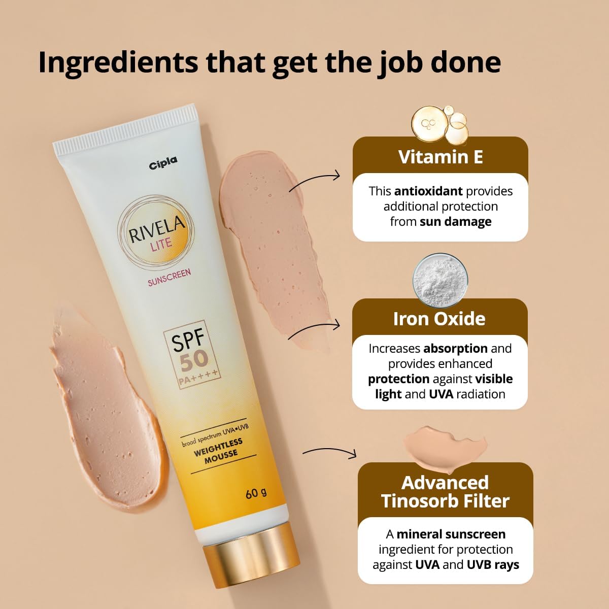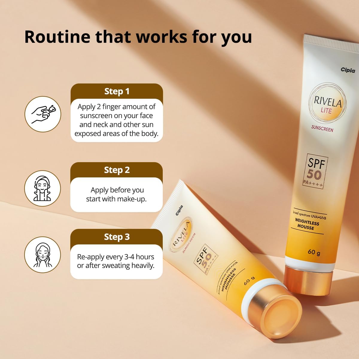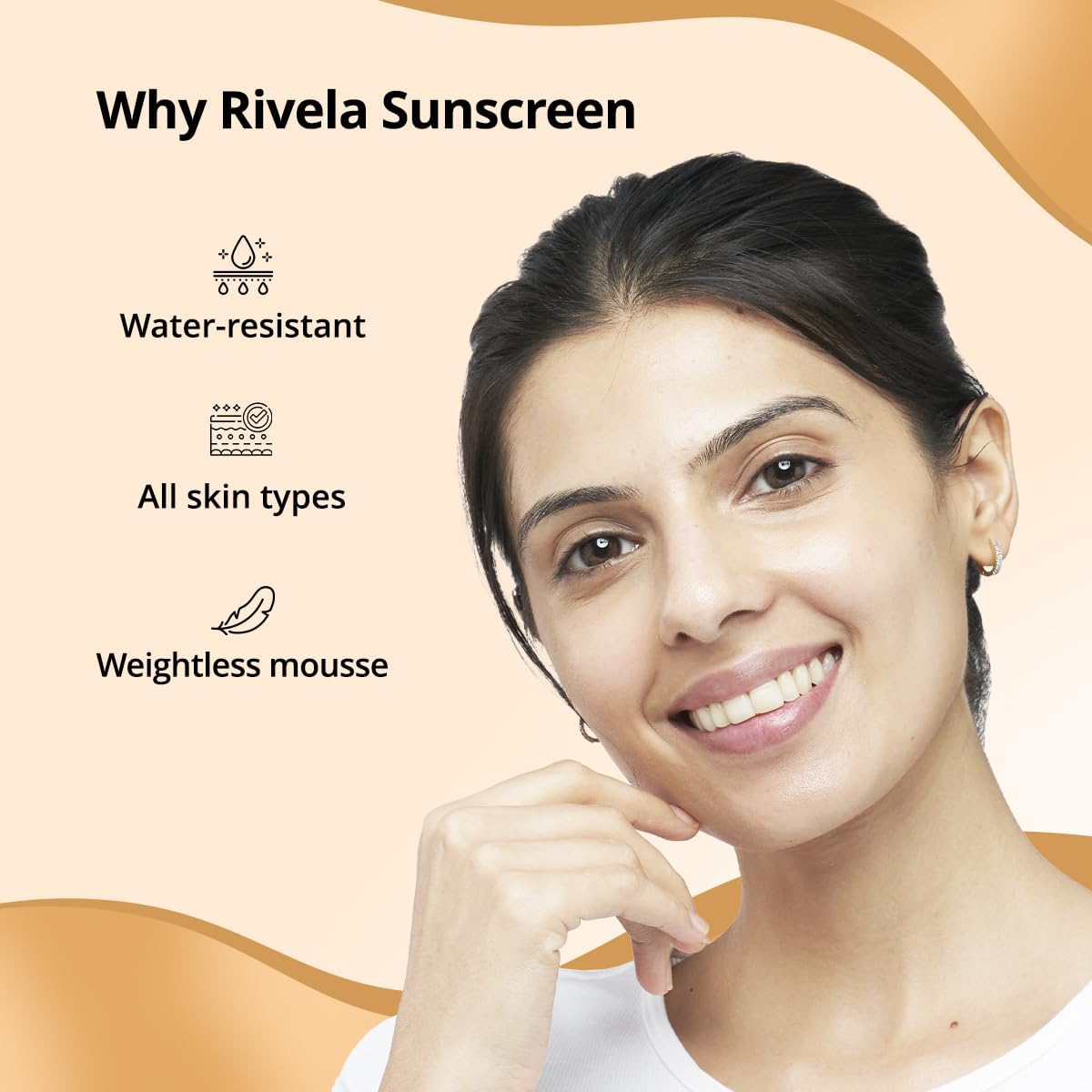 Rivela lite SPF 50+ cream is an advanced sunscreen with superior broad spectrum sun protection. It has a high SPF value of 50+ for protection against UVA & UVB rays. It slows down skin aging, is formulated with liquid crystal technology for a velvety touch and non sticky feel. It is dermatologically tested, hypoallergenic, non comedogenic and water resistant sun protection cream. Product type: cream; basic use: sunscreen (spf-50); high SPF value of 50+ for protection against UVA and UVB rays; dermatologically tested.