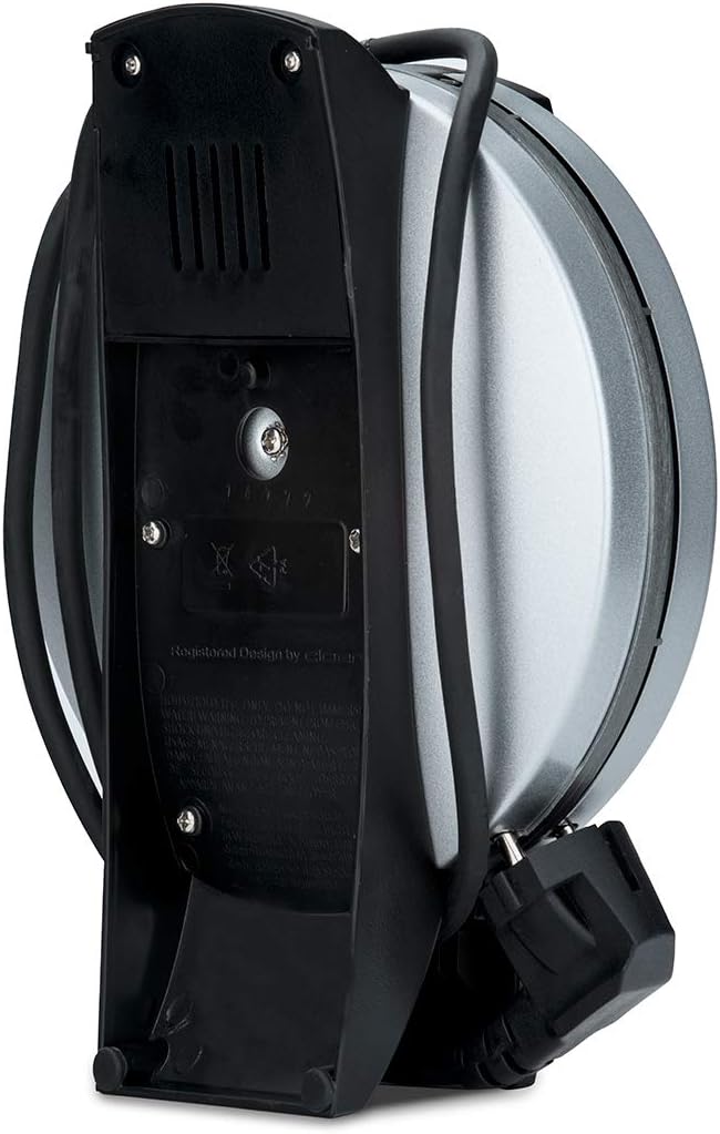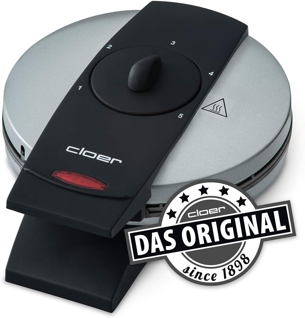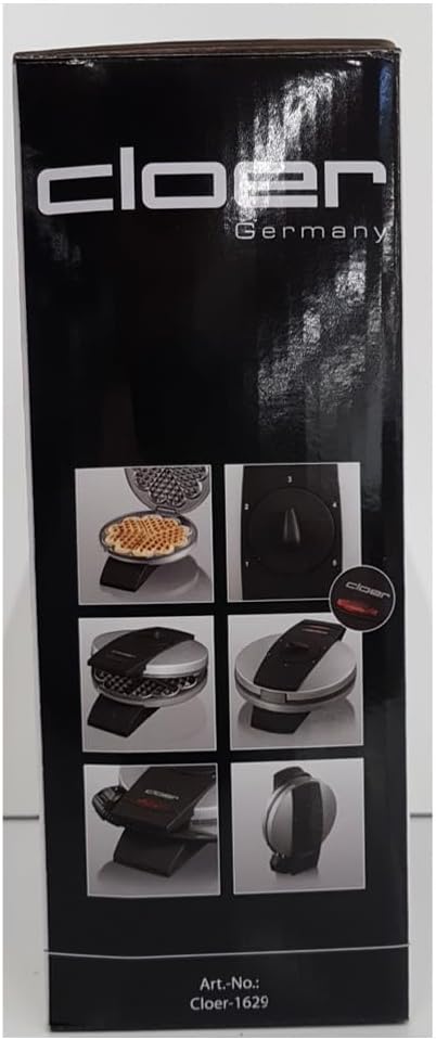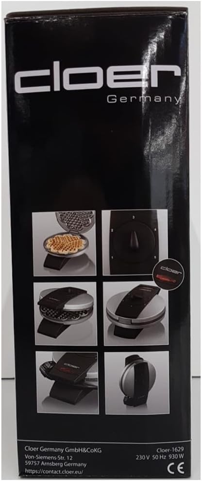 Waffle maker 1629 waffle size 15.5 cm low-fat baking thanks to non-stick coating cable reel with plug depot Easy cleaning thanks to internal hinge and grease collection groove. Optical completion message. Continuously selectable browning level with rotary control. Space-saving, storage on the handles. Cable rewind with plug depot. Flexible hinge for better rising of the waffle. Matted metal housing H = 10.0 cm x W = 24.0 cm x L = 18.50 cm 1.4 kg, 230 V, 930 W