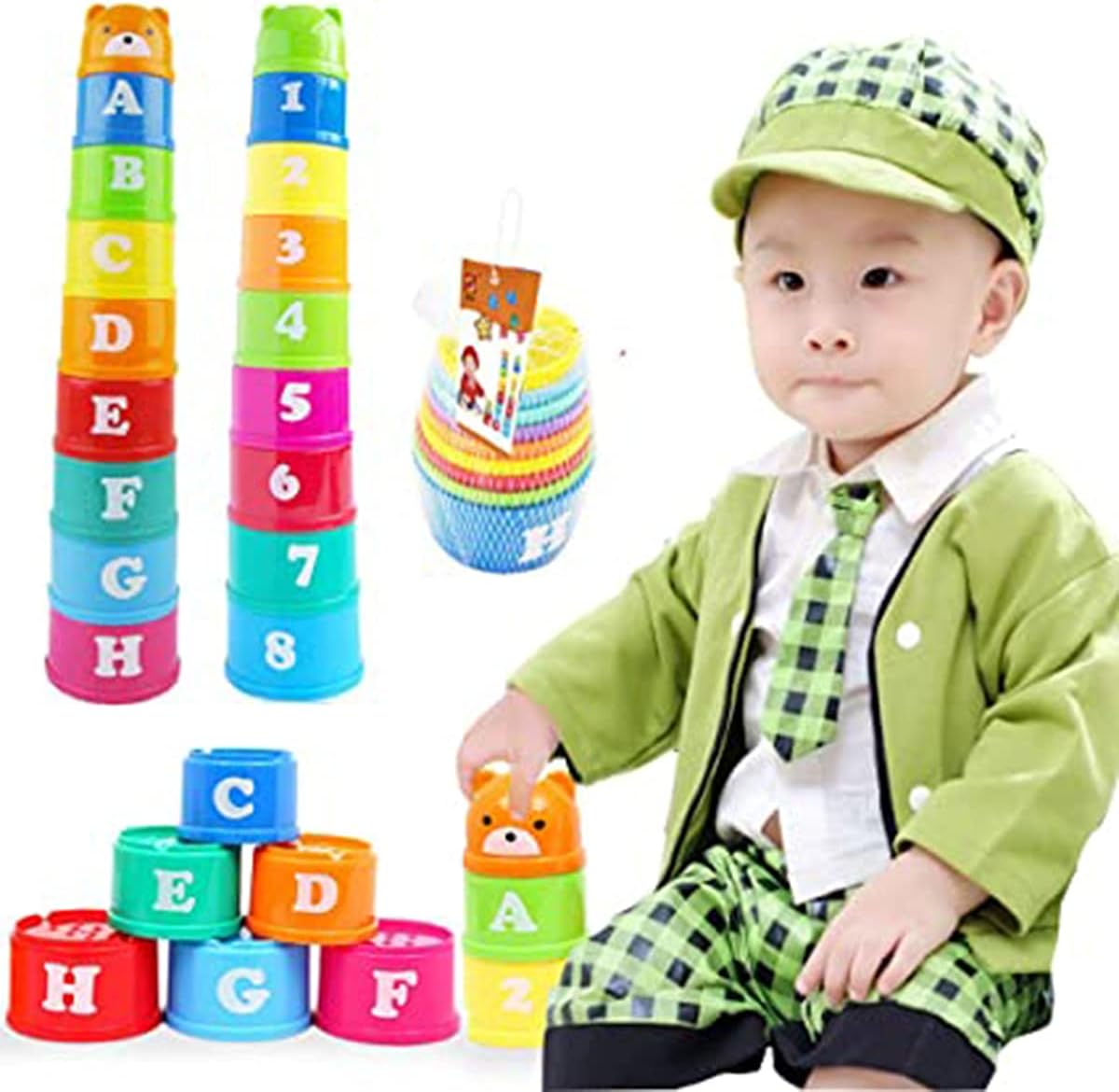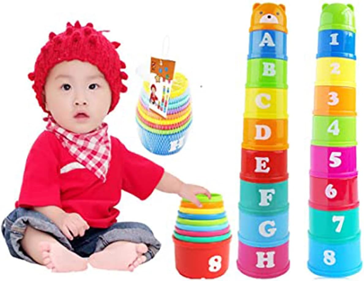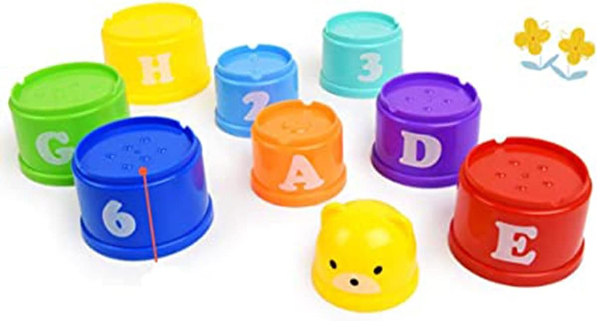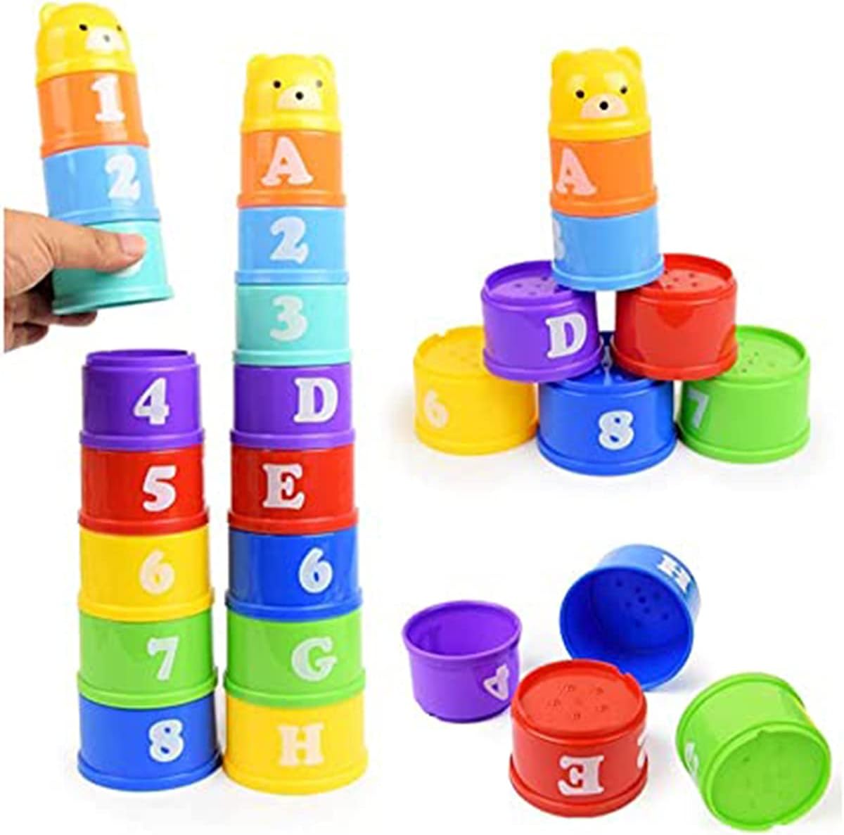 2.This set of stacking-cups have different colors, sizes and patterns on the body of cups. It can help children learn to identify them. And also can improve kids` imagination and skills for touching, stacking, folding, and so on.