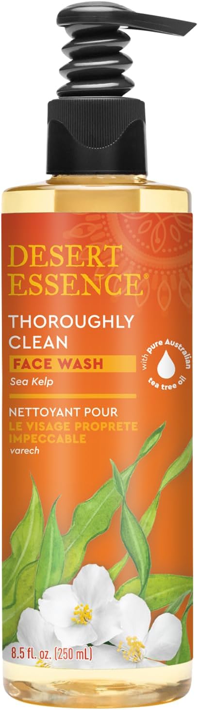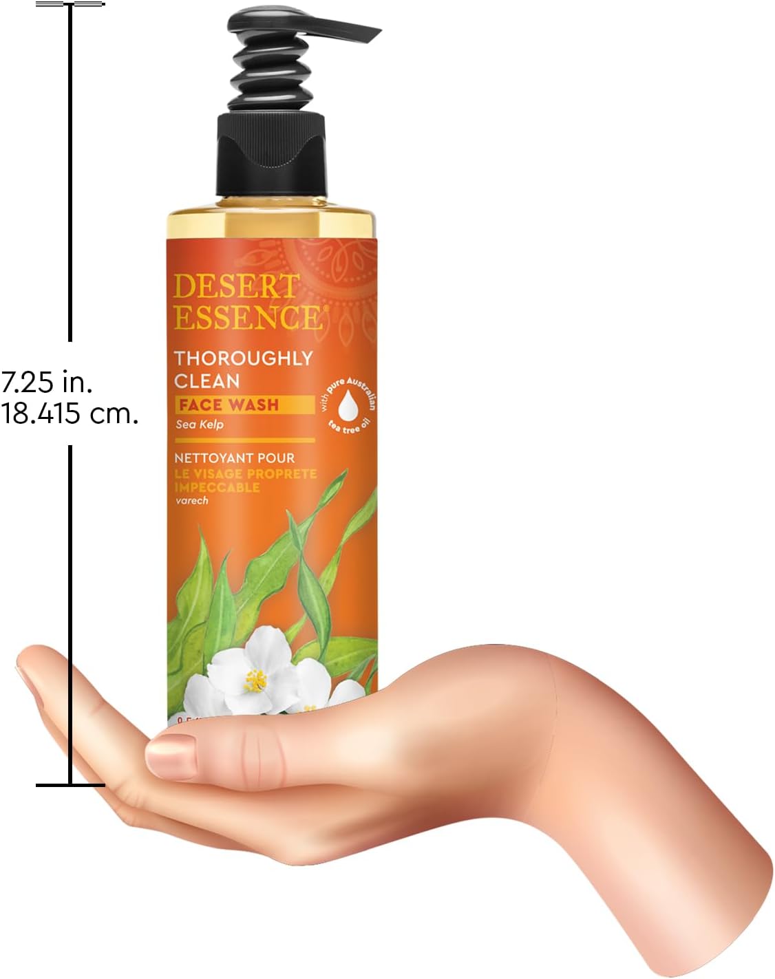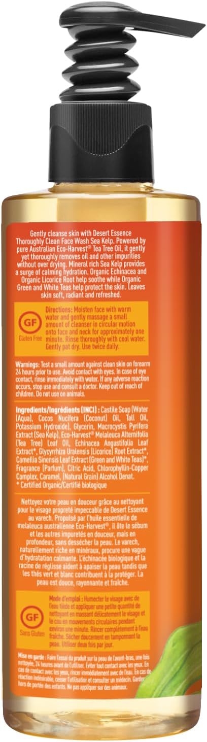 Desert Essence Thoroughly Clean Face Wash is a gentle skin cleansing solution made with Eco-Harvest tea tree oil and sea kelp. This cleansing formula is a unique blend of nutrient-rich plants harvested from both land and sea. Ideal for normal skin, it also features echinacea and licorice root extracts that work with green and white tea extracts to soothe the skin while providing anti-oxidant protection. The topical application of green and white tea extracts provides protection from solar-simulated ultraviolet light in human skin. This organic face wash gently yet effectively cleanses your skin while the presence of mineral-rich sea kelp provides rich nourishment to the skin for naturally vibrant and healthy-looking skin. It also aids in removing makeup, dirt and other impurities while being gentle on the skin.