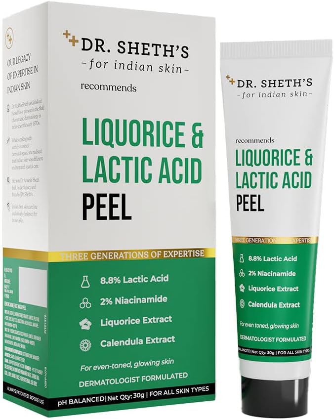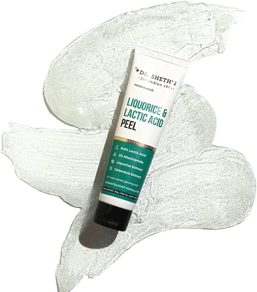 Dr. Sheth’s Liquorice and Lactic Acid Peel is power packed with Lactic Acid, an AHA which moisturizes and gently exfoliates dead cells and debris and gets you glowing. Natural extracts like Liquorice and Calendula help in brightening and soothing skin while Niacinamide leaves it feeling healthy and moisturized.
