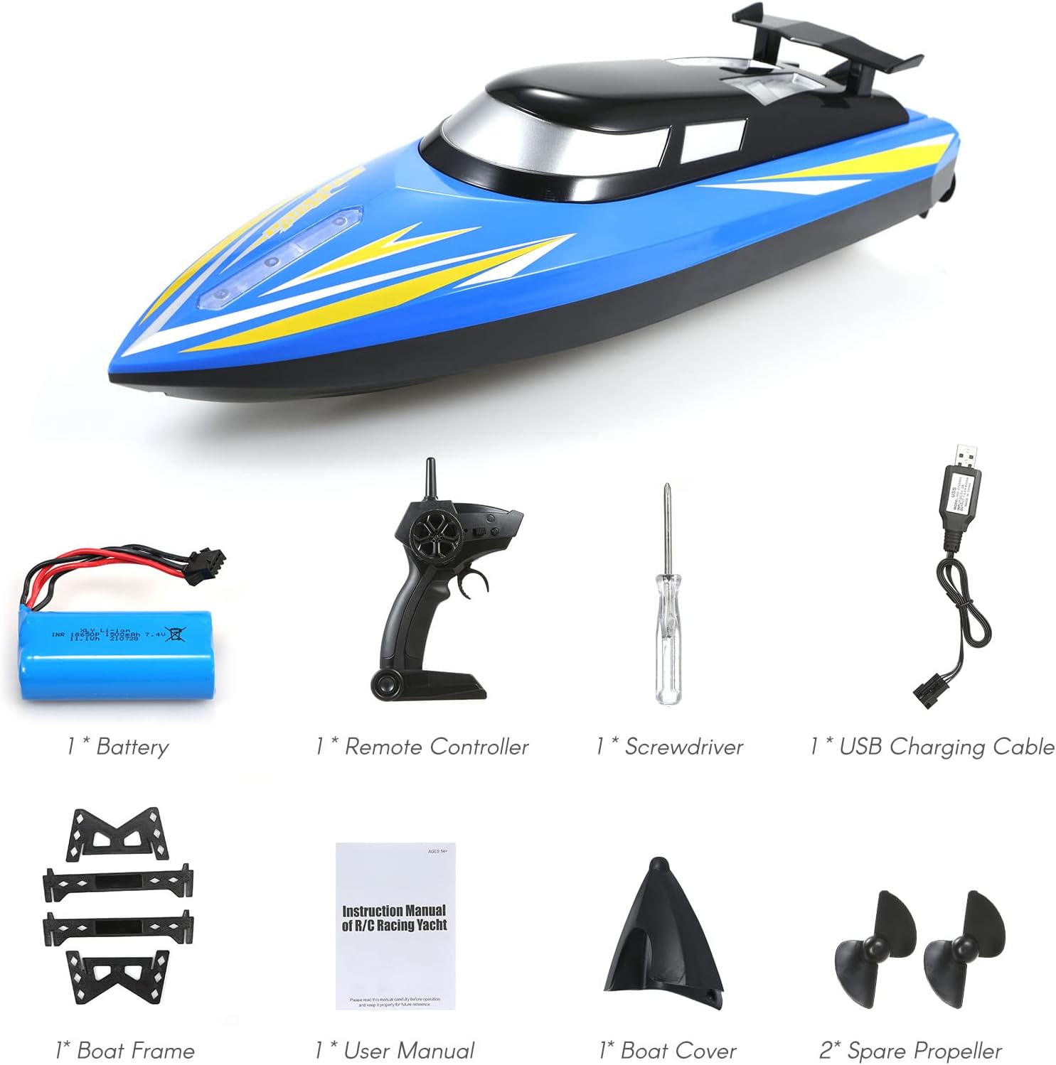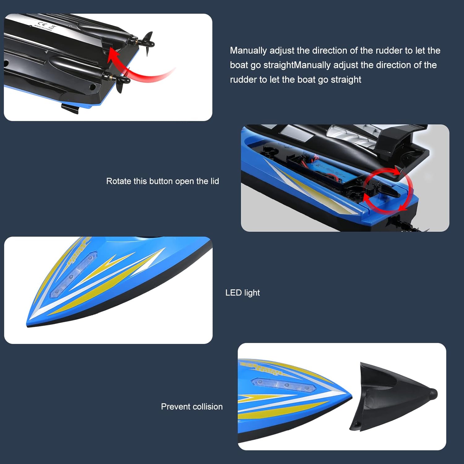 🌷 Function: Forward, backward, turn left and turn right, 3 speed adjustable, navigation light, low battery alarm. Manually adjust the direction of the rudder to let the boat go straight.