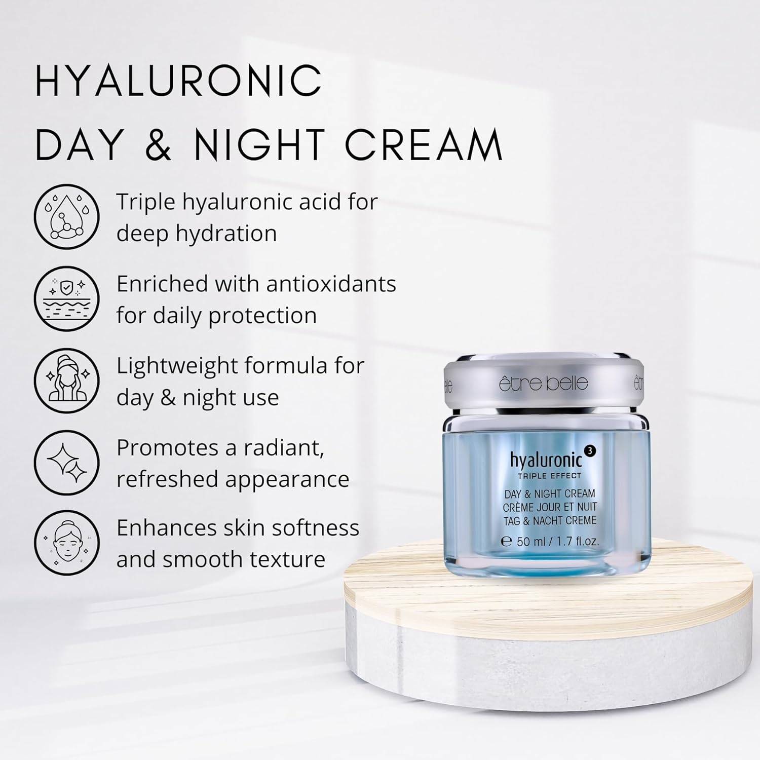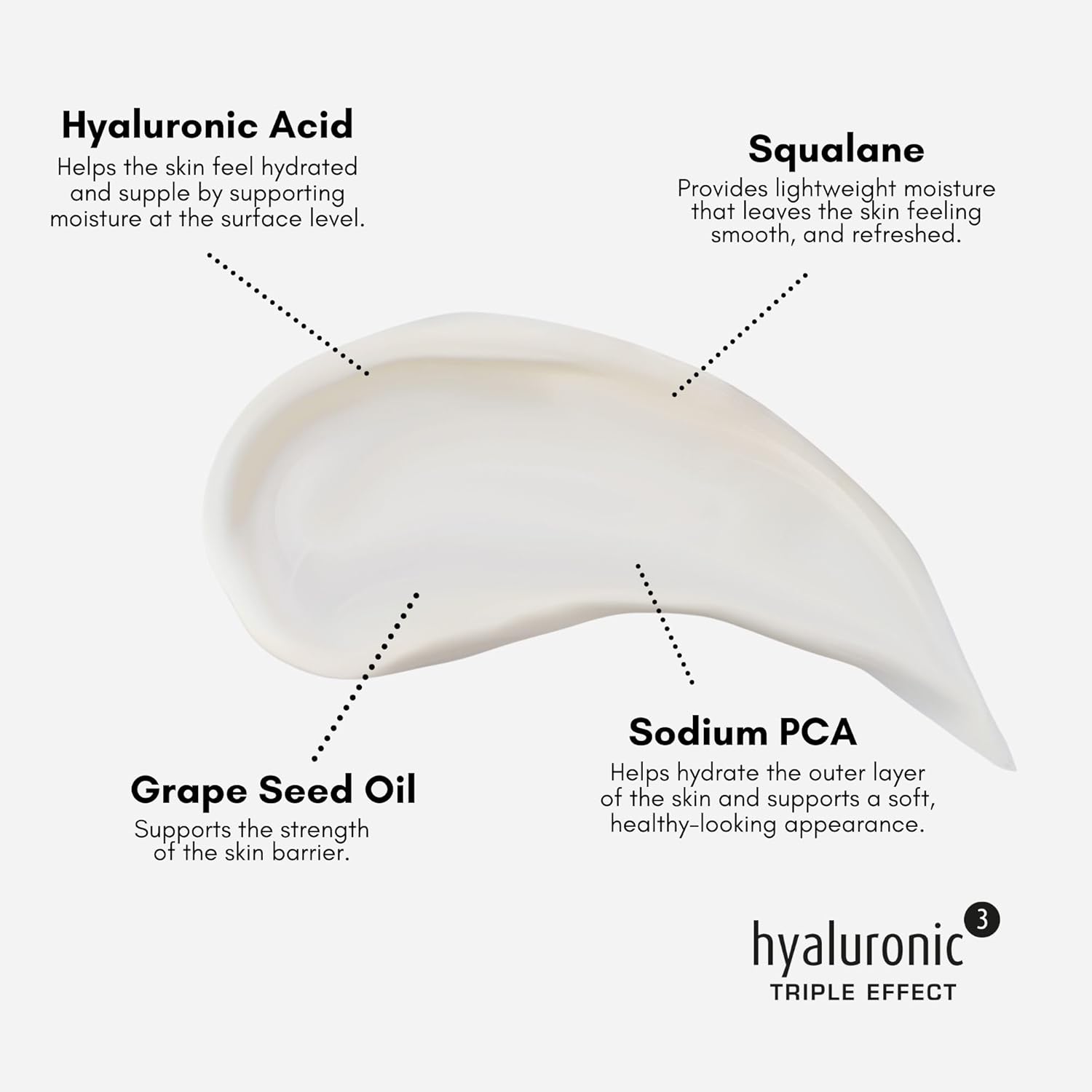 An intensively hydrating day and night cream. Triply active hyaluronic acid complexes act in an intelligent multi-stage system providing staggered release of hyaluronic acid to the different layers of the upper epidermis. Valuable grape seed oil, rich in antioxidants, jojoba oil and squalane enhance this formulation. The skin appears smoother, fuller and firmer. Youthful beauty is reactivated.