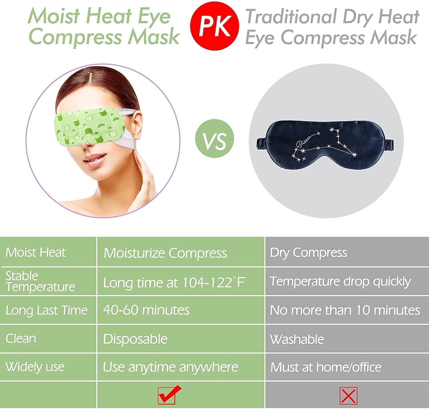【HOW THE EYE MASK WORKS】The moistness helps the heat penetrate through to the muscles, and improves blood circulation around the eyes. Moist heat in this way may provide better pain relief. After using the eye steam mask, moisturized and lubricated eyes will feel refreshed and rejuvenated, an effective alternative to eye drops