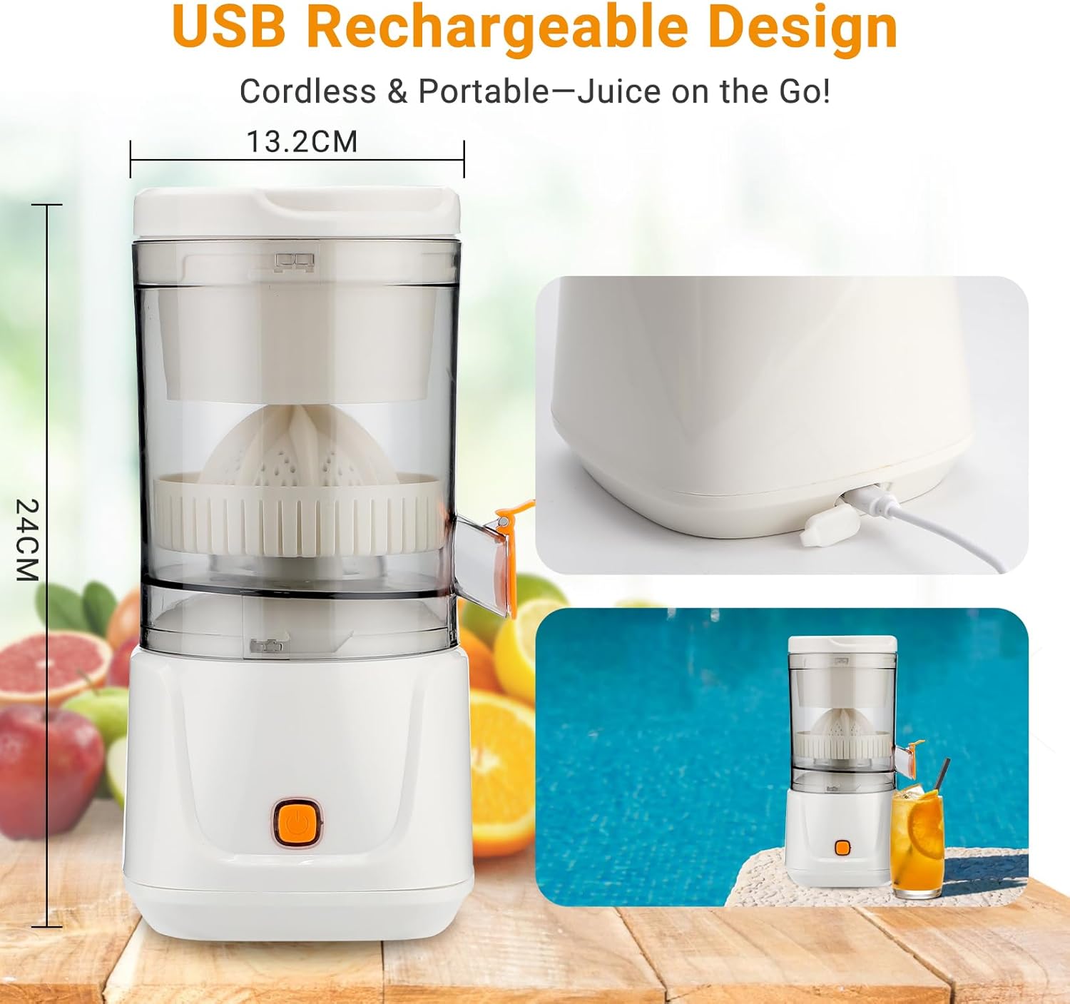 【USB Rechargeable & Portable】Charge the electric citrus juicer via USB-C for use anywhere, making it ideal for travel, gym, picnic, and home kitchens. 𝐅𝐨𝐫 𝐨𝐩𝐭𝐢𝐦𝐚𝐥 𝐩𝐞𝐫𝐟𝐨𝐫𝐦𝐚𝐧𝐜𝐞, 𝐞𝐧𝐬𝐮𝐫𝐞 𝐲𝐨𝐮𝐫 𝐣𝐮𝐢𝐜𝐞𝐫 𝐢𝐬 𝐟𝐮𝐥𝐥𝐲 𝐜𝐡𝐚𝐫𝐠𝐞𝐝 𝐛𝐞𝐟𝐨𝐫𝐞 𝐮𝐬𝐞. 𝐈𝐟 𝐲𝐨𝐮 𝐧𝐨𝐭𝐢𝐜𝐞 𝐭𝐡𝐞 𝐦𝐨𝐭𝐨𝐫 𝐬𝐭𝐫𝐮𝐠𝐠𝐥𝐢𝐧𝐠 𝐝𝐮𝐫𝐢𝐧𝐠 𝐣𝐮𝐢𝐜𝐞 𝐞𝐱𝐭𝐫𝐚𝐜𝐭𝐢𝐨𝐧, 𝐭𝐡𝐢𝐬 𝐦𝐞𝐚𝐧𝐬 𝐭𝐡𝐞 𝐛𝐚𝐭𝐭𝐞𝐫𝐲 𝐢𝐬 𝐥𝐨𝐰. 𝐒𝐢𝐦𝐩𝐥𝐲 𝐫𝐞𝐜𝐡𝐚𝐫𝐠𝐞 𝐢𝐭 𝐟𝐨𝐫 𝟑-5 𝐡𝐨𝐮𝐫𝐬 𝐭𝐨 𝐫𝐞𝐠𝐚𝐢𝐧 𝐦𝐚𝐱𝐢𝐦𝐮𝐦 𝐩𝐨𝐰𝐞𝐫 𝐚𝐧𝐝 𝐞𝐧𝐣𝐨𝐲 𝐭𝐡𝐞 𝐢𝐧𝐭𝐞𝐧𝐝𝐞𝐝 𝐩𝐞𝐫𝐟𝐨𝐫𝐦𝐚𝐧𝐜𝐞.