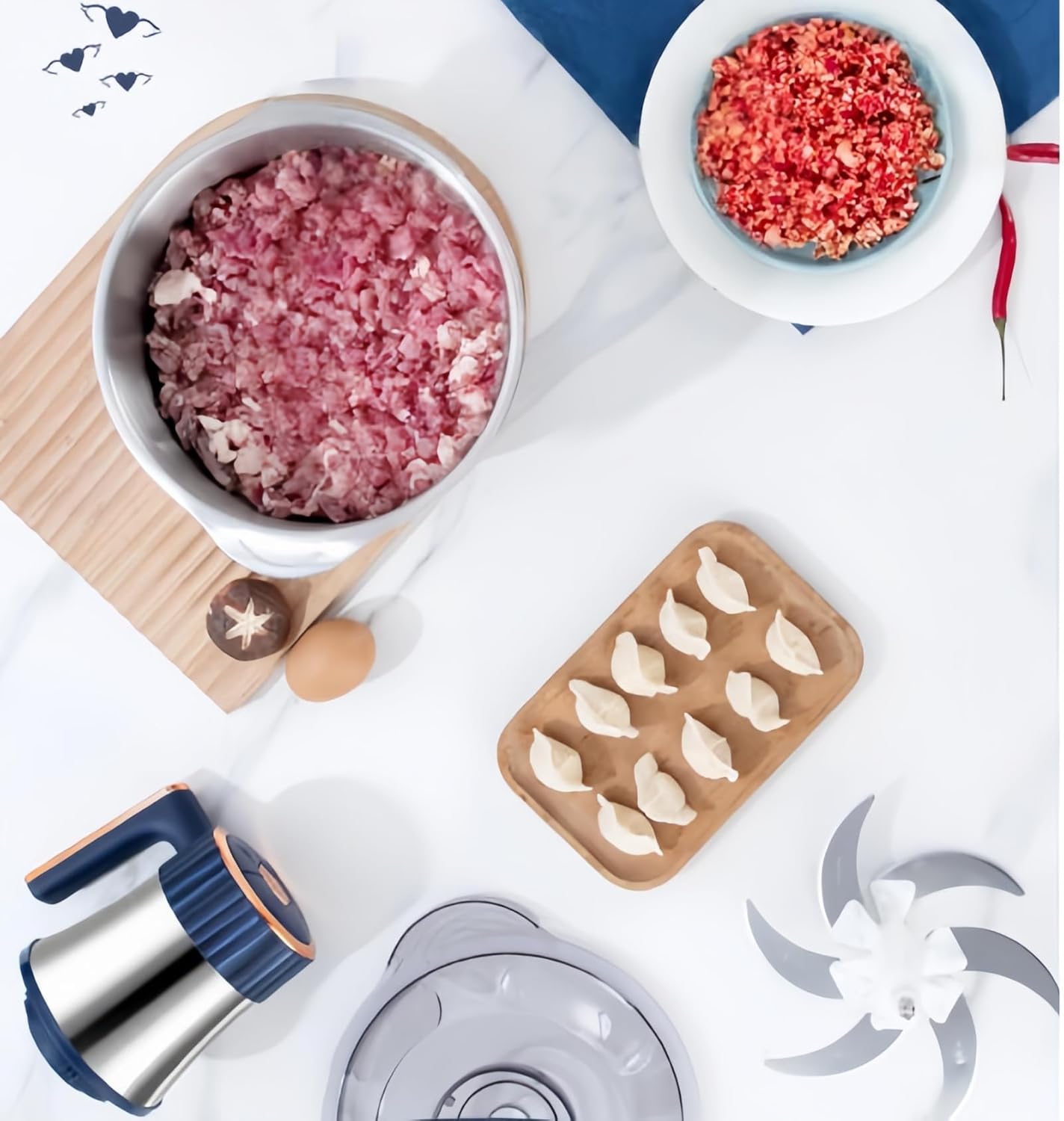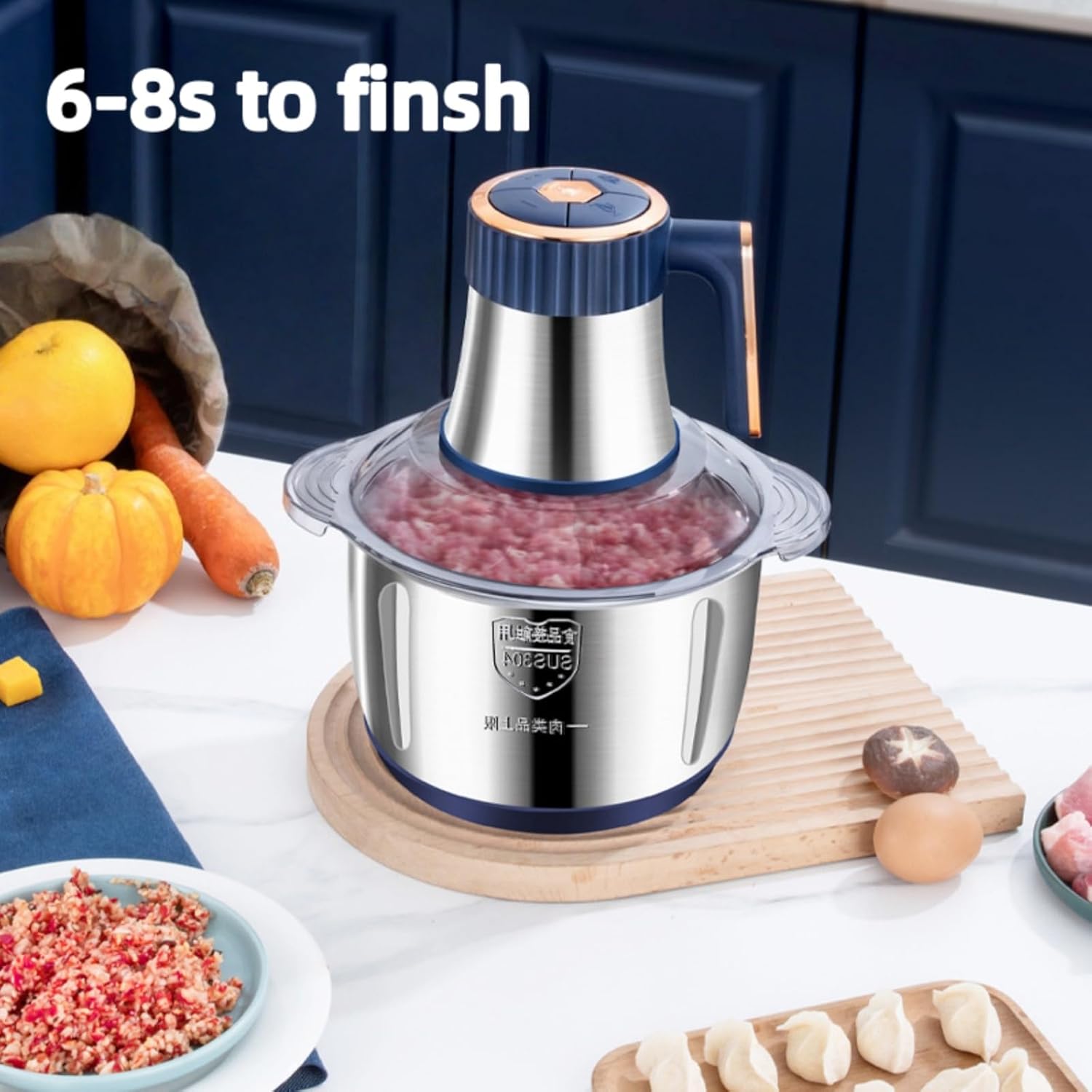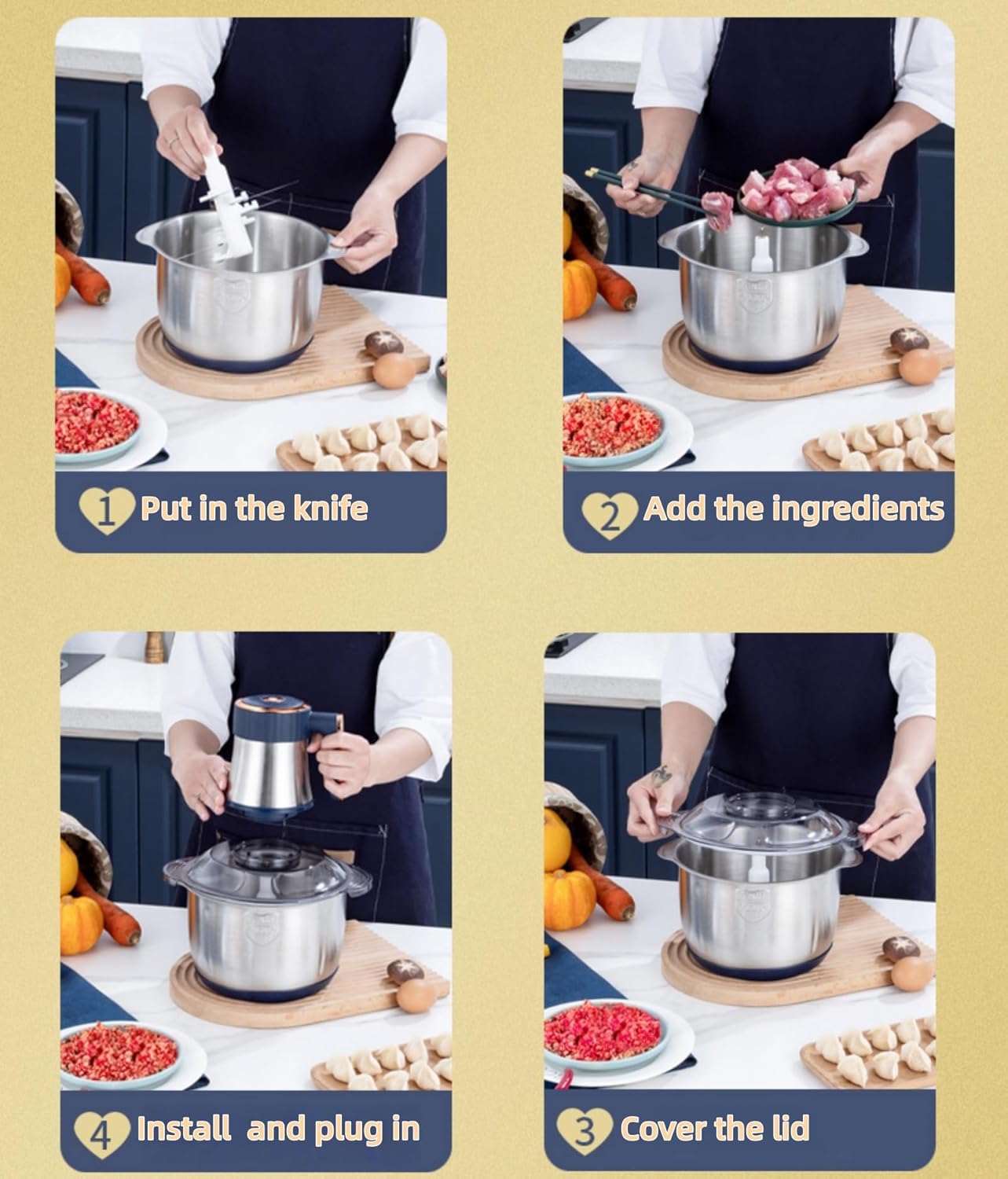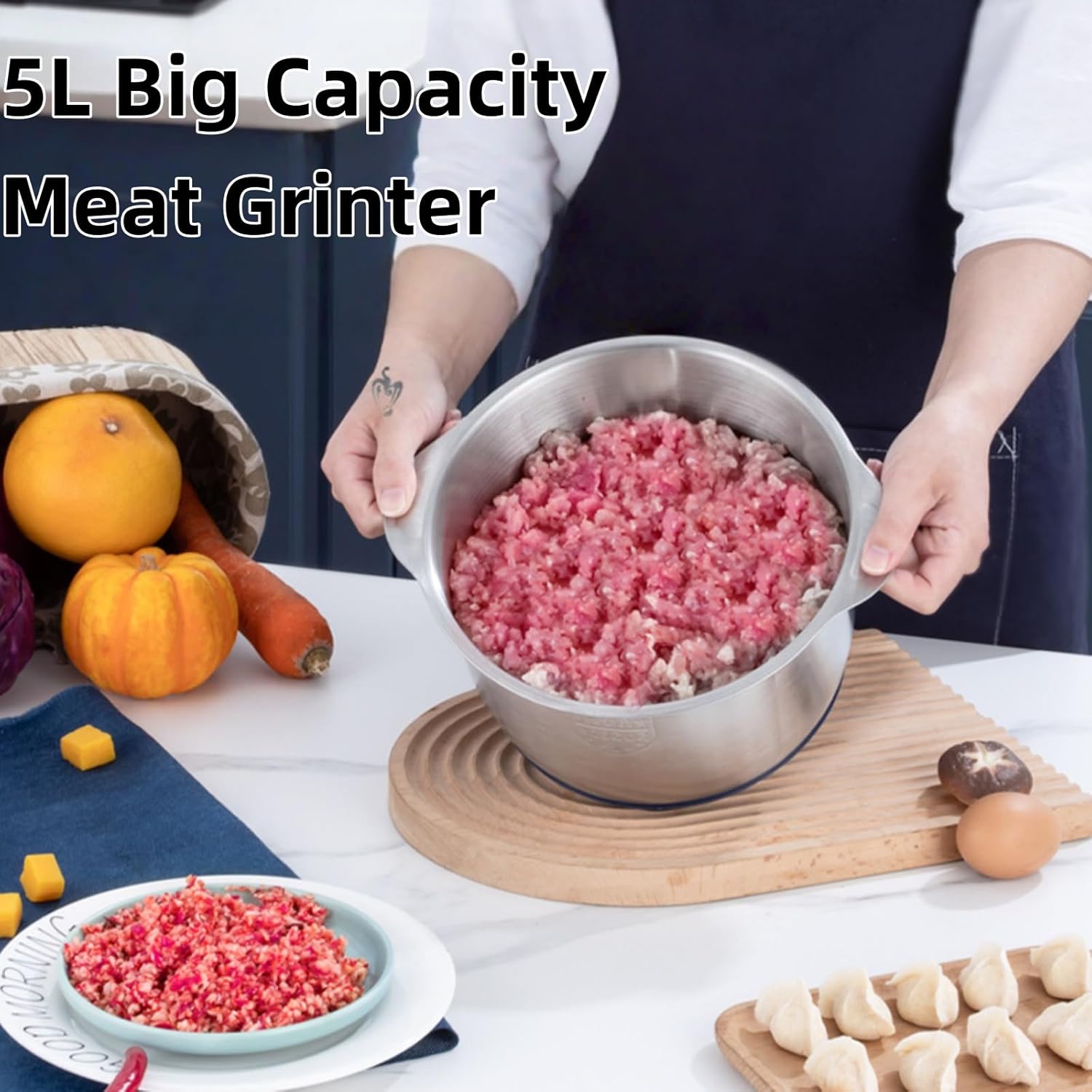 Ultra large capacity electric food chopper: 5L (20 cups) ultra large stainless steel bowl. Rubber rings to help bowls stay in place and dampen noise as it vibrates against the counter. Recommend to hold bowl tight during operation to avoid shake and fall.The kitchen food processing machine can meet the needs of crushing large amounts of food at once.