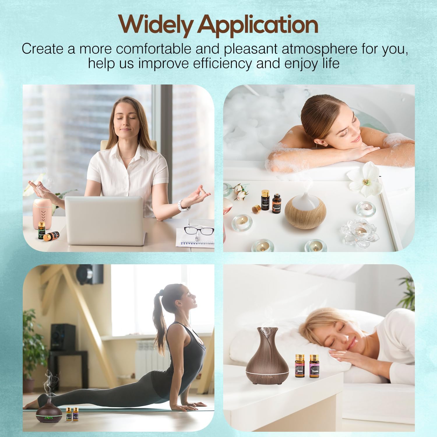 This essential oils variety pack is perfect for the home (bedroom, living room, bathroom, study room), office (workstation, conference room), outdoors, yoga room, spa, and more!