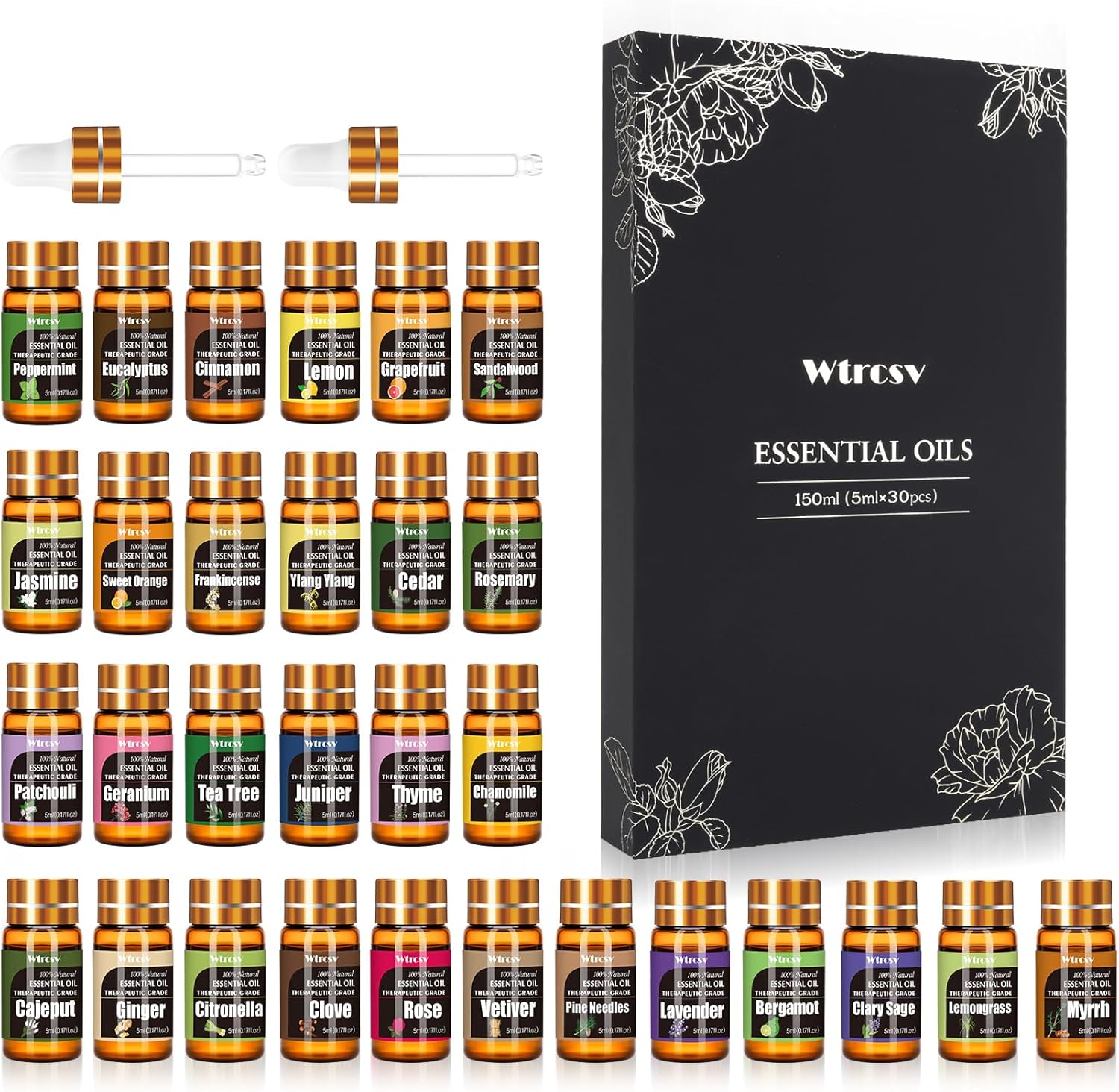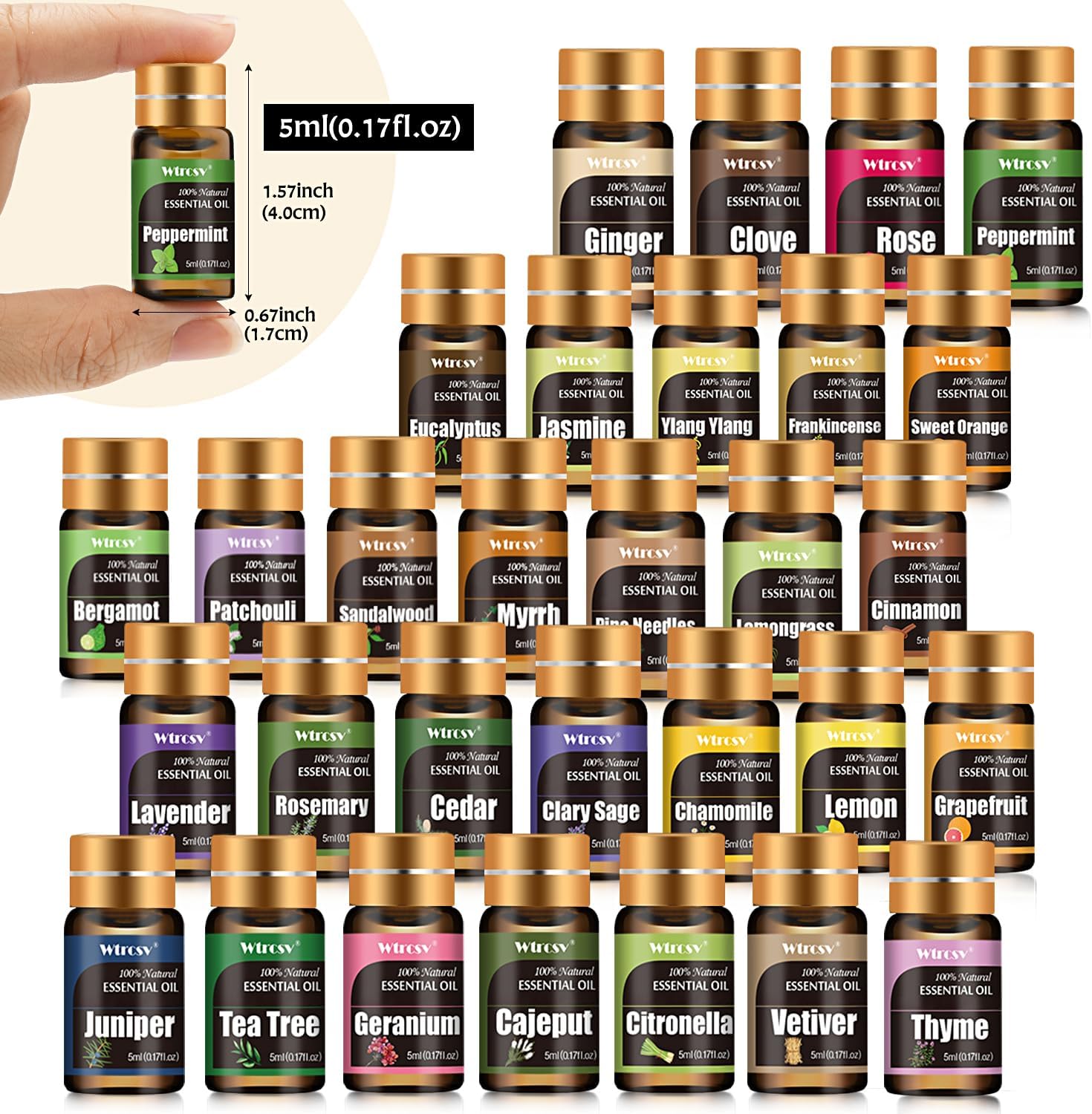 Essential Oils Set: Citronella, Chamomile, Patchouli, Sandalwood, Myrrh ,Cinnamon, Lemon, Eucalyptus, Bergamot, Lavender, Thyme, Jasmine, Cedar,Lemongrass,Peppermint,Clove, Sweet Orange,Grapefruit, Ginger, Vetiver, Rosemary, Juniper,Rose, Tea tree