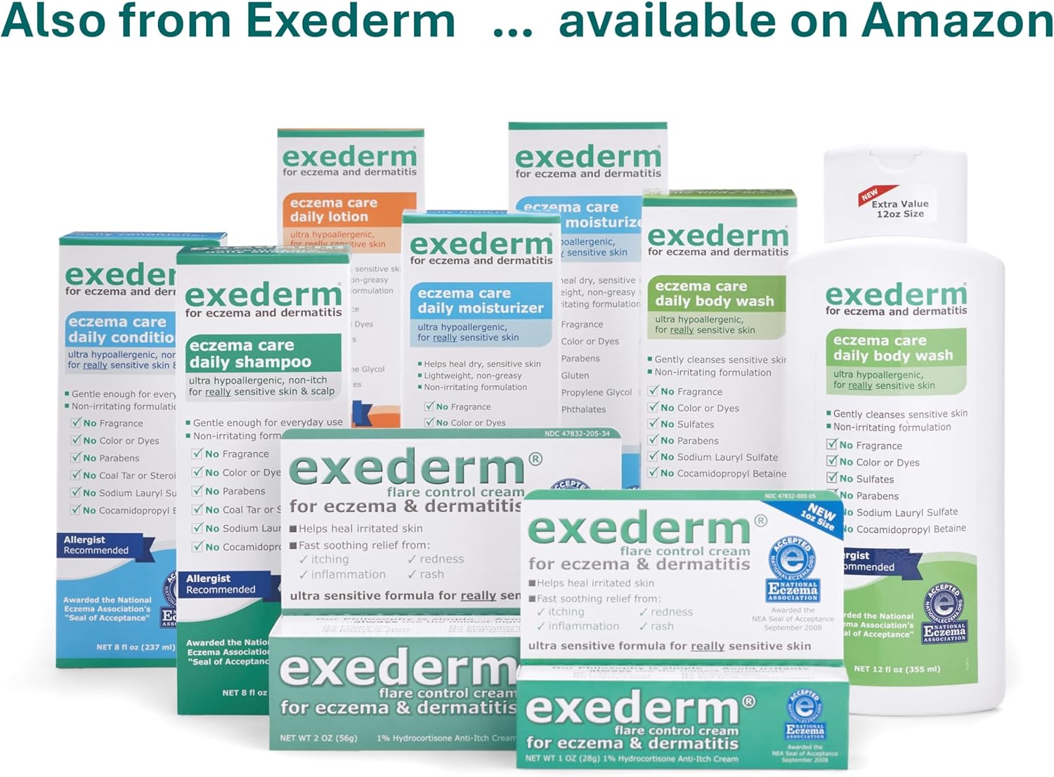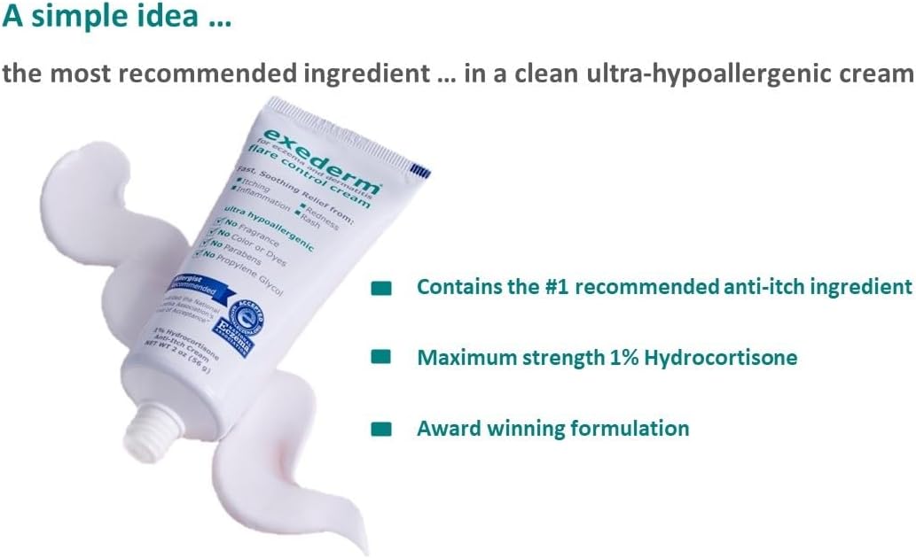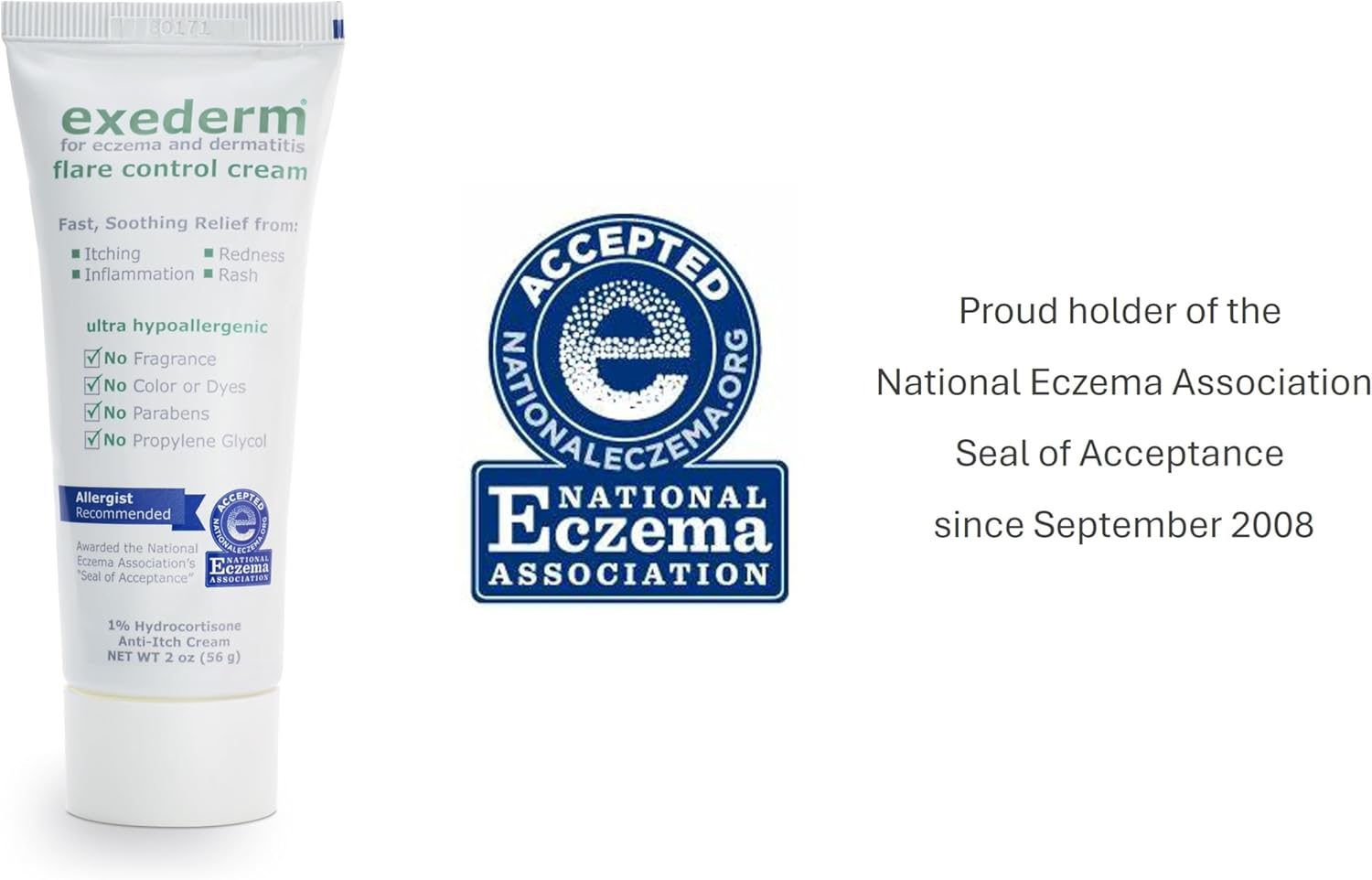 Exederm Flare Control Cream for Eczema & Dermatitis Exederm Flare Control Cream is specially formulated for very sensitive skin to help provide temporary relief from minor irritations, rashes & inflamed skin due to atopic eczema, contact dermatitis from soaps, detergents or cosmetics, psoriasis & seborrheic dermatitis.* Formulated with Hydrocortisone Acetate USP 1% and skin-soothing ingredients like glycerin & caprylic triglyceride to help relieve flare-ups & nourish sensitive skin. This itch relief cream helps provide maximum relief without a prescription. Free of gluten, paraben, fragrances, dyes & harsh preservatives. Apply to the affected area not more than 3 to 4 times daily. Avoid contact with eyes. Suitable for use on adults and children over 2 years. We believe that eczema, dermatitis and sensitive skin sufferers are different and need to avoid even mild irritants whenever possible. Exederm provides a simple and sensible approach to avoid eczema irritants. With Exederm it’s possible to gently cleanse, deeply moisturize and get smoother and healthier skin without using unnecessary chemicals. Awarded the National Eczema Association’s “Seal of Acceptance”. *These statements have not been evaluated by the Food and Drug Administration. This product is not intended to diagnose, treat, cure, or prevent any disease.