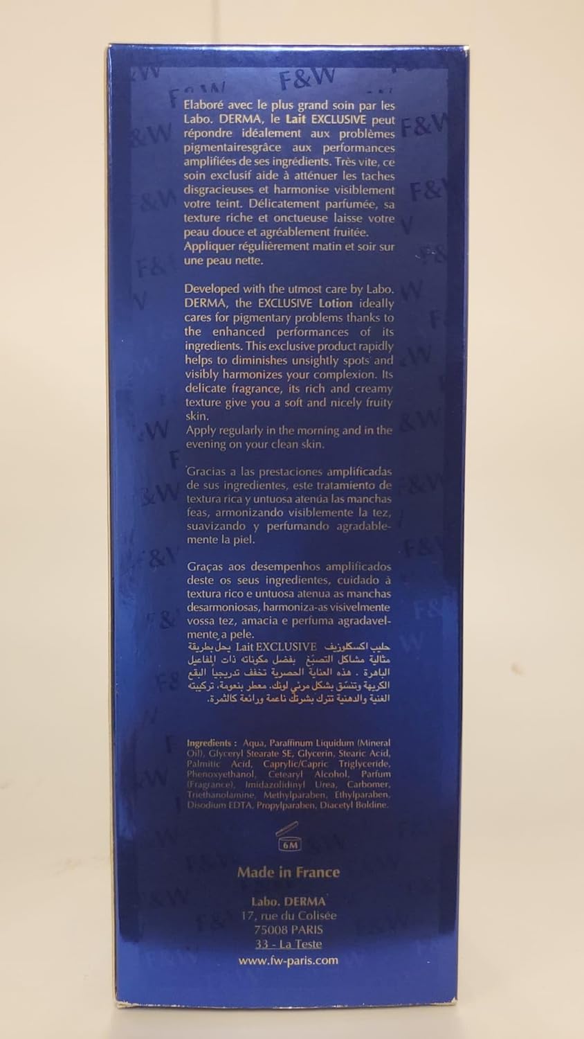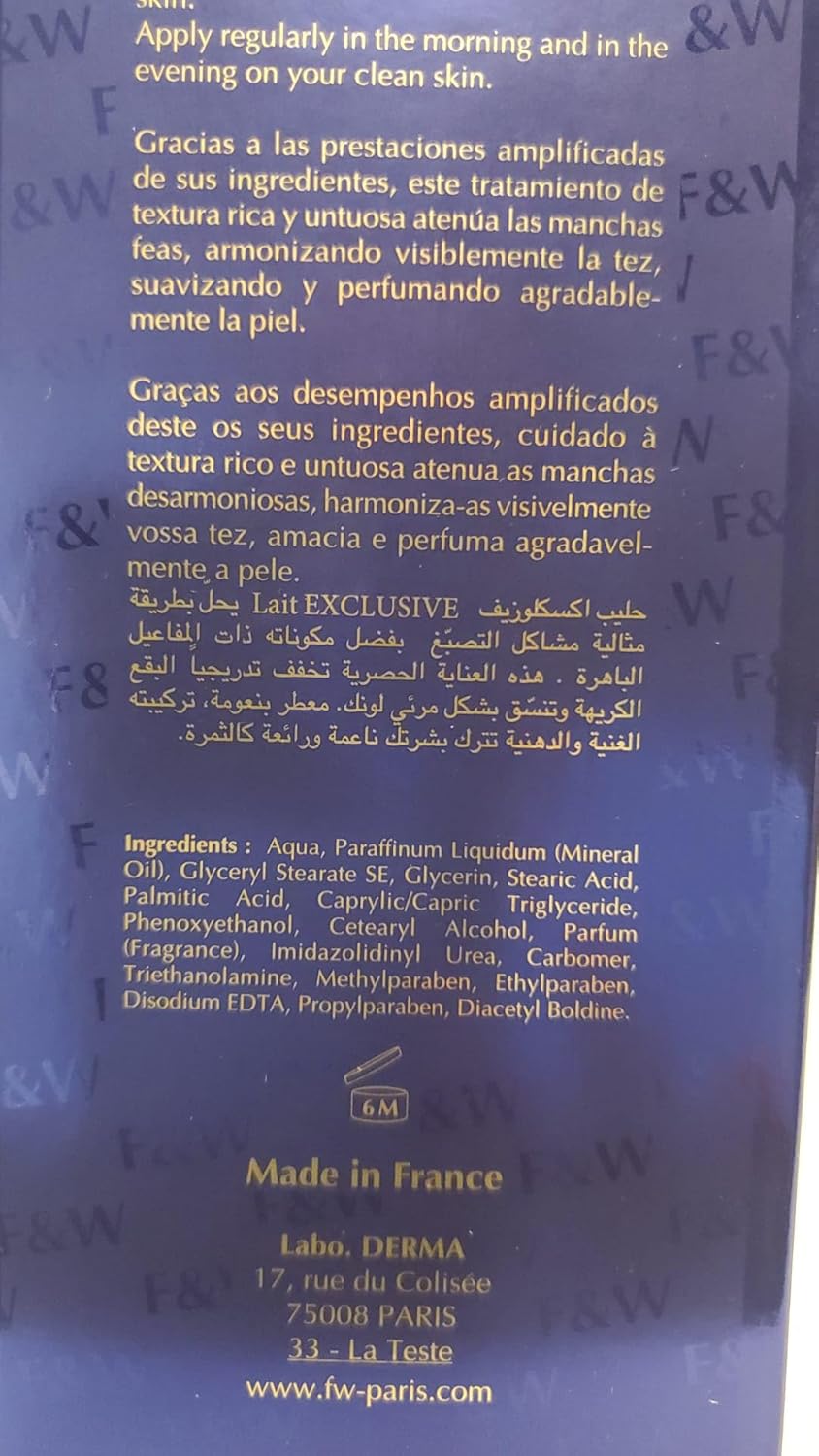 EXCLUSIVE FORMULA : This Lotion is specifically formulated to lighten and even out skin tone on the body with melanin inhibitor. Light textured lotion softens skin as it brightens and hydrates, promoting a luminous glow with Glycerin.