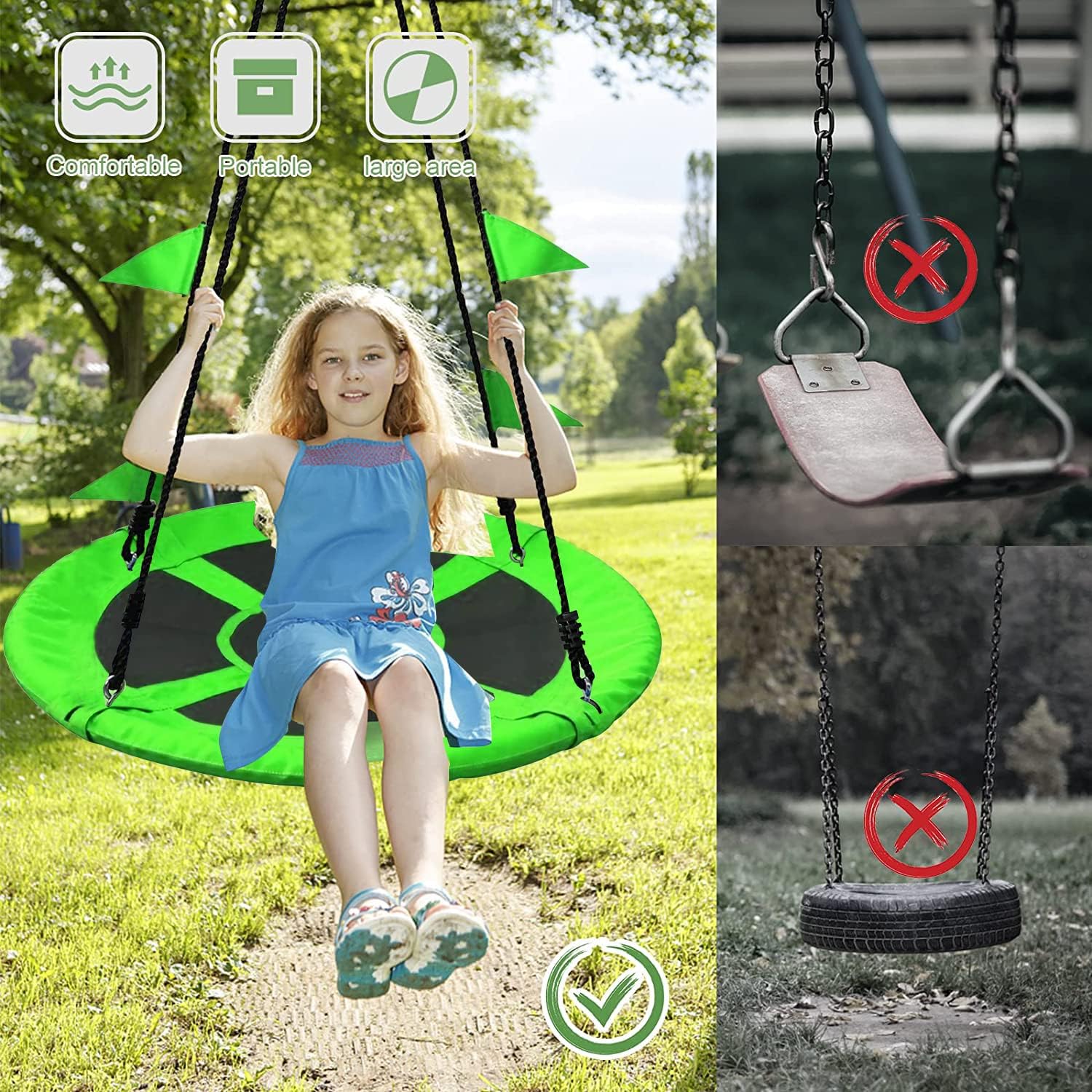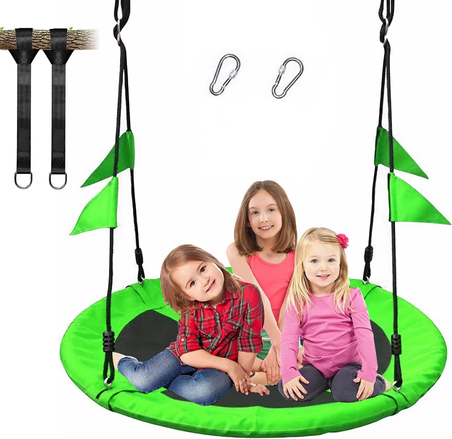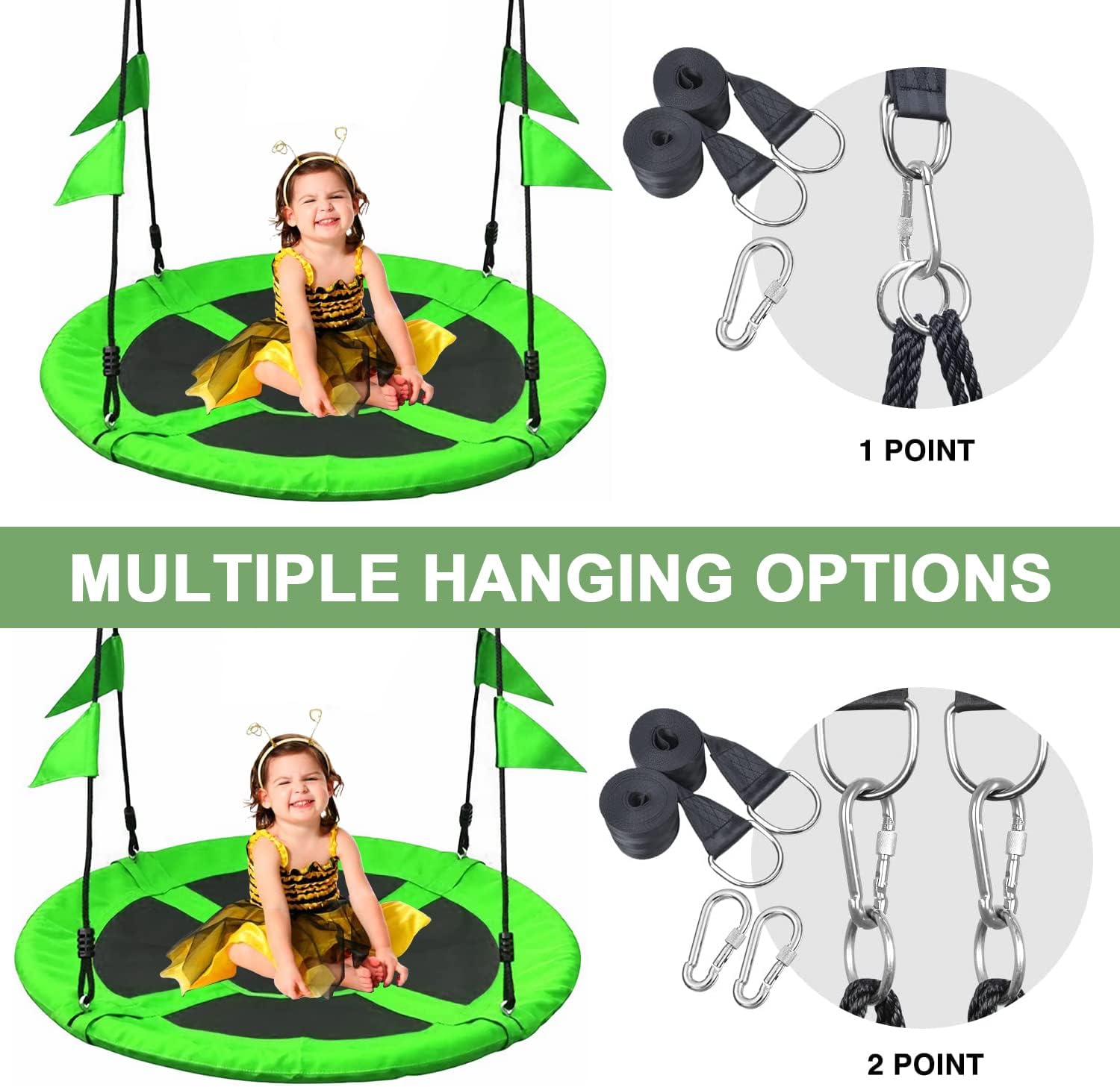 【Hanging Accessories Included】The saucer swing with removable flags includes two reinforced swing straps and heavy-duty galvanized locking carabiners that allow you to hang the web swing with 2 hanging straps on a tree limb securely and easily. Please follow the printed user manual for safe installation.
