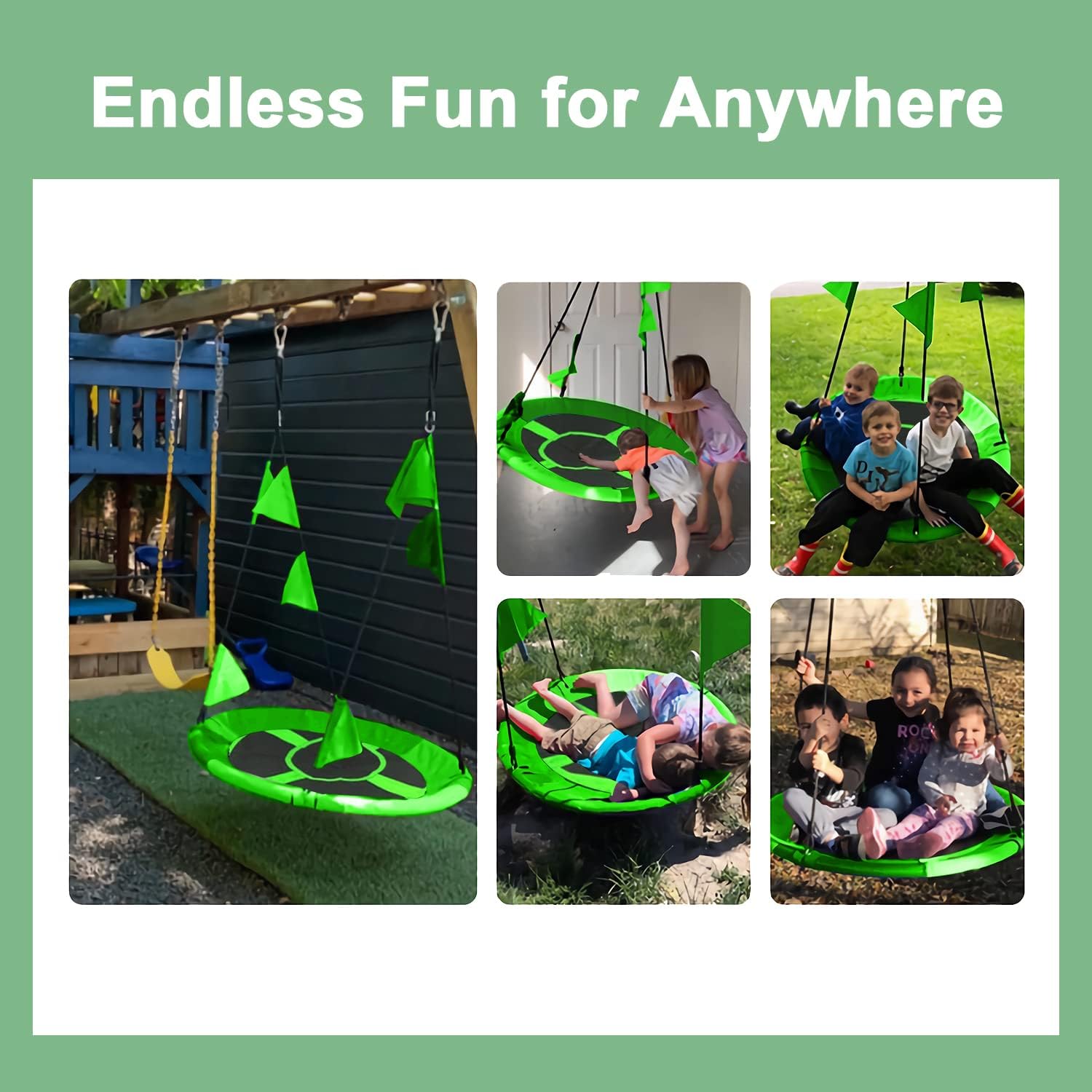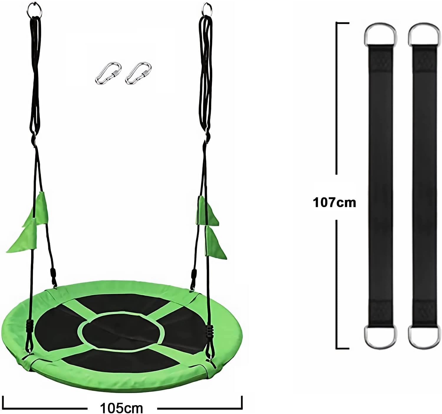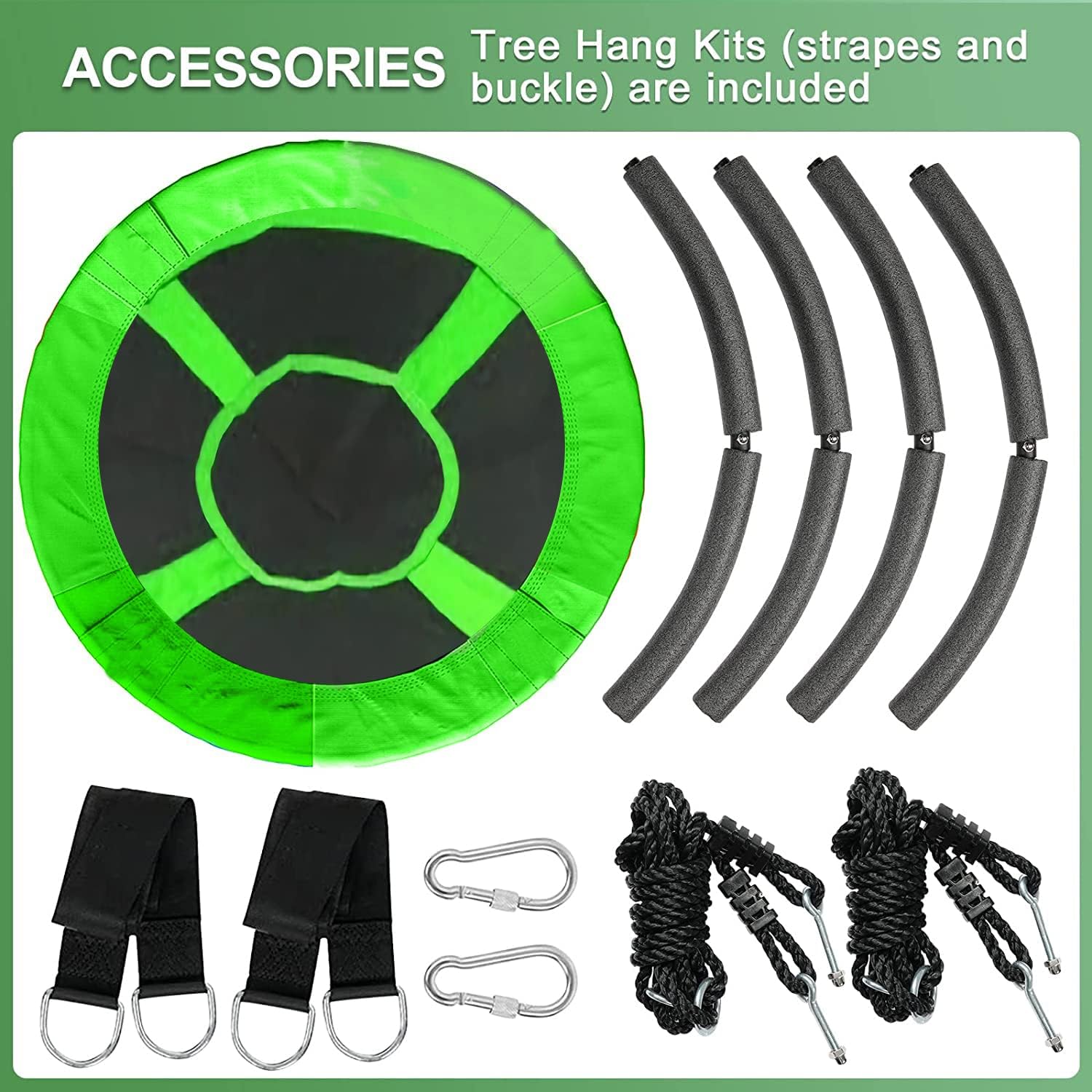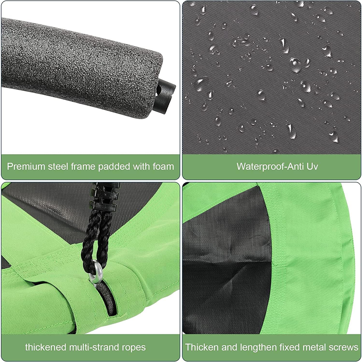 【Hanging Accessories Included】The saucer swing with removable flags includes two reinforced swing straps and heavy-duty galvanized locking carabiners that allow you to hang the web swing with 2 hanging straps on a tree limb securely and easily. Please follow the printed user manual for safe installation.