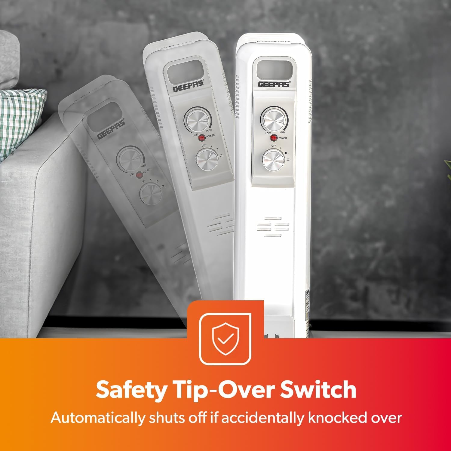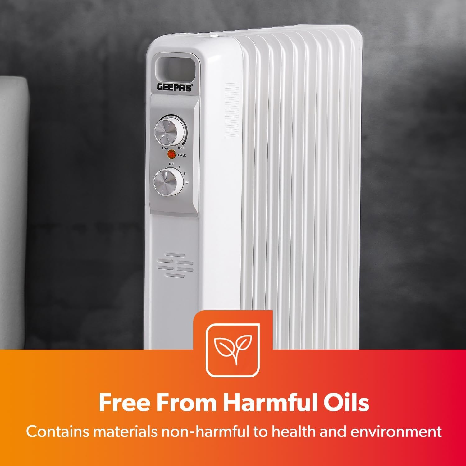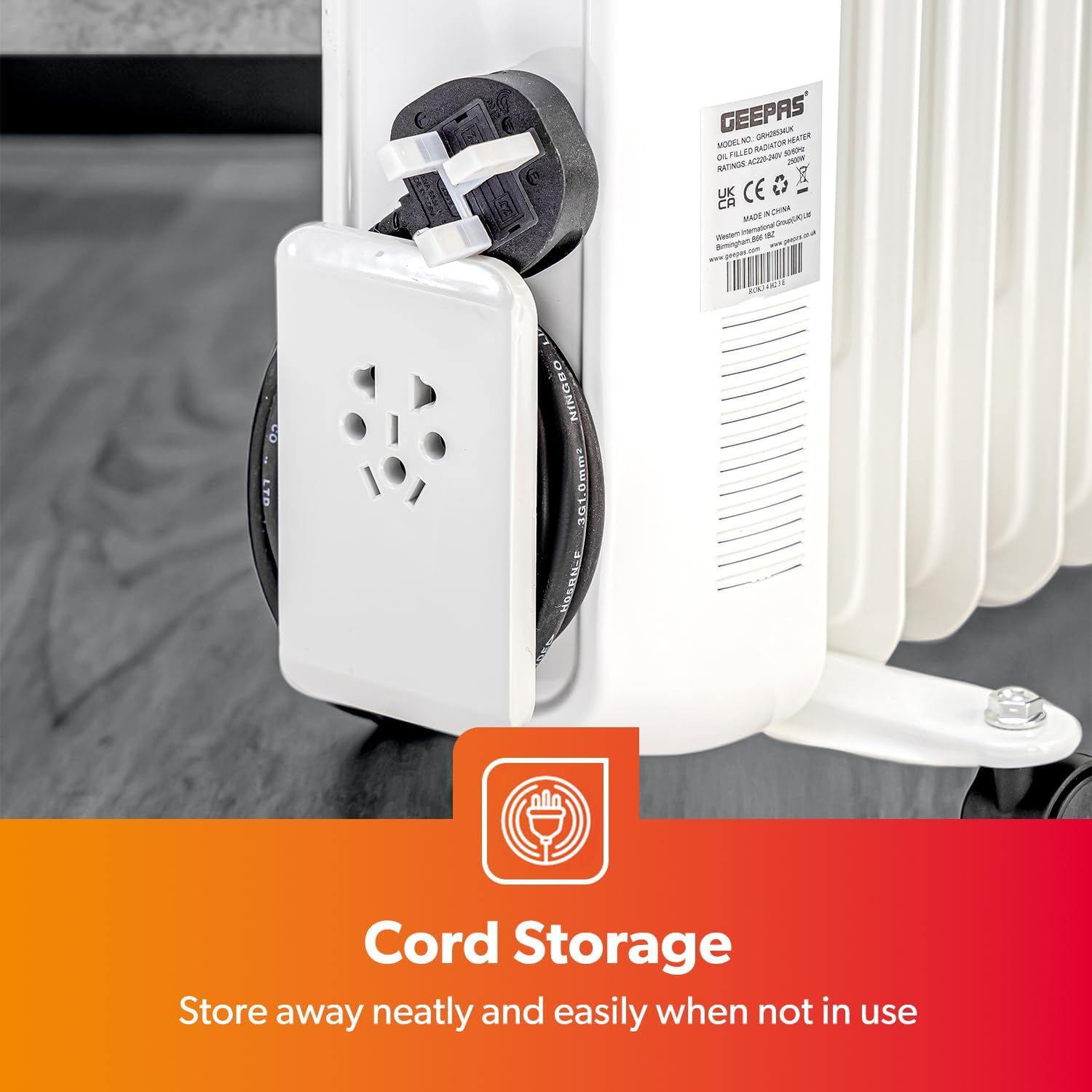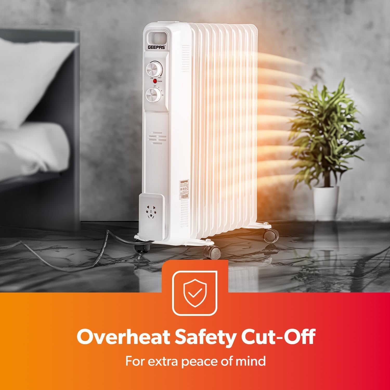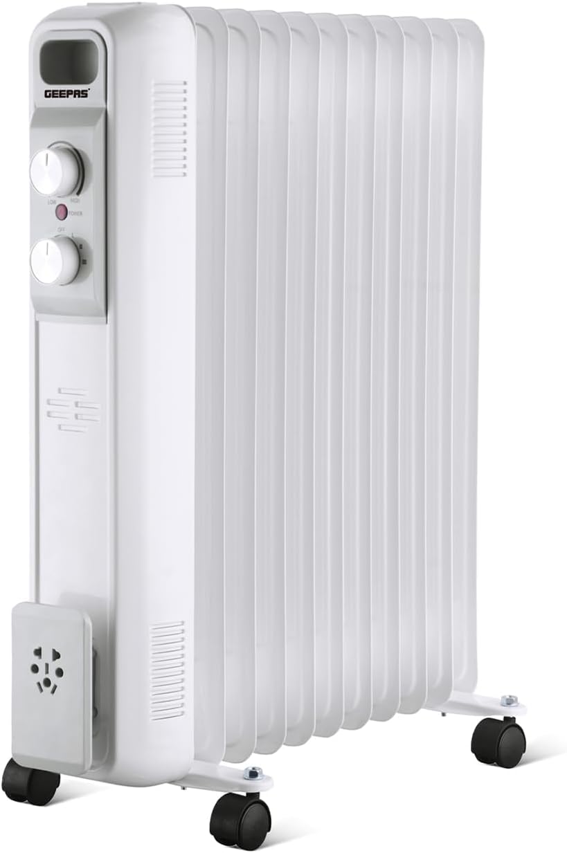 This Geepas 2500W radiator features 11 powerful heating fins with green environmental oil filled which quickly and efficiently warm and circulate hot air throughout your home, office, bedroom or living room. A fully adjustable thermostat and 3 heat settings of 1000W, 1500W and 2500W allow you to find and maintain the perfect room temperature. Built-in overheat protection, safety tip-over switch and automatic thermal shutoff ensure the radiator instantly switches off in any unsafe situation. Pre-assembled and fitted with 4 easy-roll castor wheels, a carry handle and cable tidy, this heater is easy to move and store.