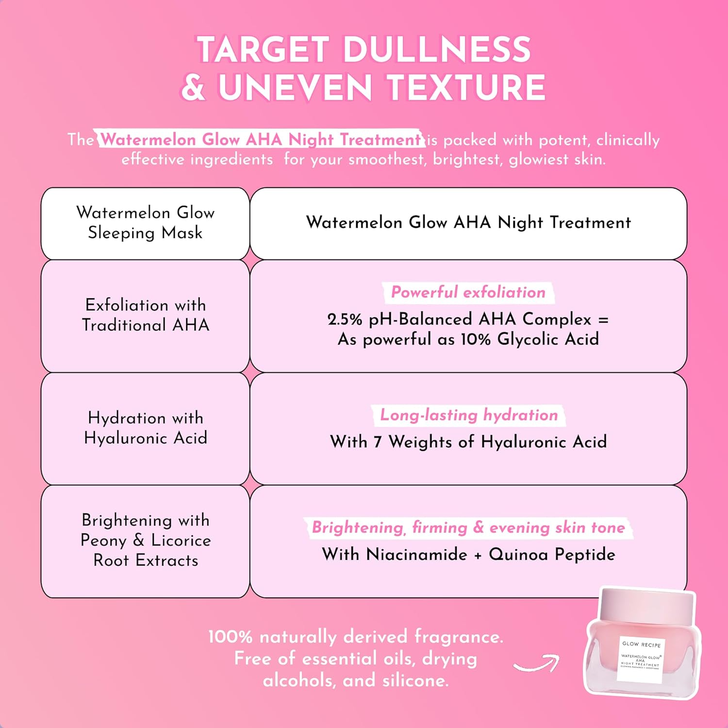 Soothing Overnight Mask – The Watermelon Glow AHA Sleeping Mask is a bouncy, breathable sleeping facial mask made with watermelon, hyaluronic acid, and. AHA’s to hydrate, smooth and perfect glowing skin.