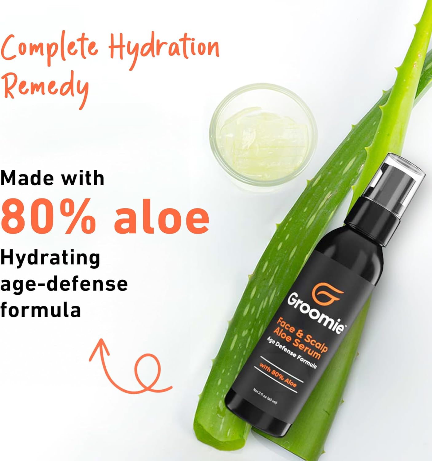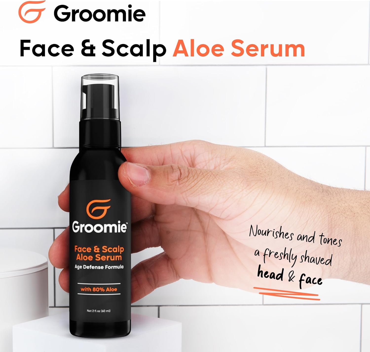 Introducing the Groomie Face & Scalp Aloe Serum: a serum designed to nourish, protect, and rejuvenate your skin after shaving. Our formula is enriched with the hydrating power of aloe vera gel. Say hello to intense moisture that keeps your face and scalp looking healthy and revitalized. Our serum offers unparalleled hydration that lasts all day and night, leaving you feeling refreshed and rejuvenated. Enjoy the benefits without the added weight of a thick product and bid farewell to dryness and discomfort. Each application soothes post-shave irritation and redness, providing a pampering experience. For optimal results, make our serum a part of your daily routine. Apply day and night to unlock the full benefits. At Groomie, we’ve developed aftershave serums tailored to nourish and tone freshly shaved heads and bodies. Our dedication to quality head & face care extends to pre-shaving oils and serums that ensure a smooth and comfortable shaving experience, but our commitment doesn’t stop there! We provide comprehensive grooming solutions for everyone. Explore our range of deodorants, clippers, blades, and even blotting sheets for oily skin. Stay confident and hydrated all day and give your skin the love and care it deserves.