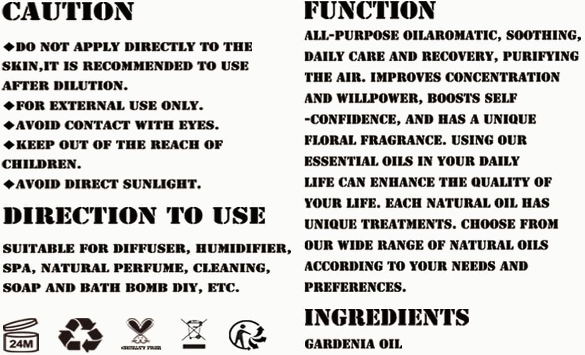 INGREDIENTS: Our premium Gardenia essential oil is 100% pure plant extract, carefully steam-distilled to preserve its vibrant, true-to-nature fragrance. Every batch is laboratory-tested to guarantee premium quality and consistent aromatic performance.