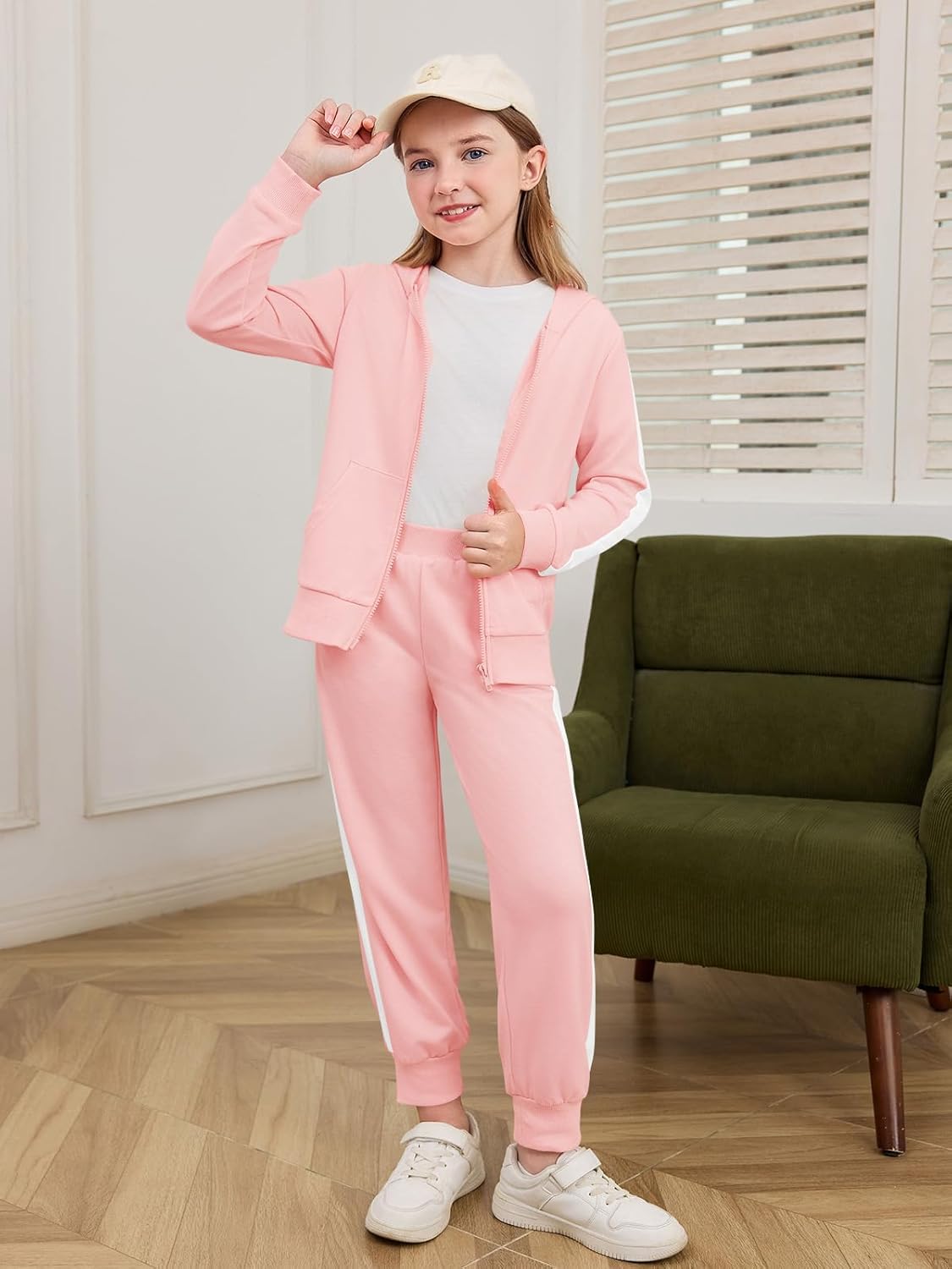 Keep your little one comfy and trendy in this adorable zip-up hoodie and jogger set! Made from soft, stretchy polyester-elastane fabric, this tracksuit is perfect for school, sports, or weekend adventures. The hoodie features a full-zip design, kangaroo pocket, and bold contrast stripes, while the tapered joggers have an elastic waistband and sporty side stripes for a sleek look. Easy to wash and available in sizes 5-14Y, it’s a must-have for active girls who love fashion and comfort!