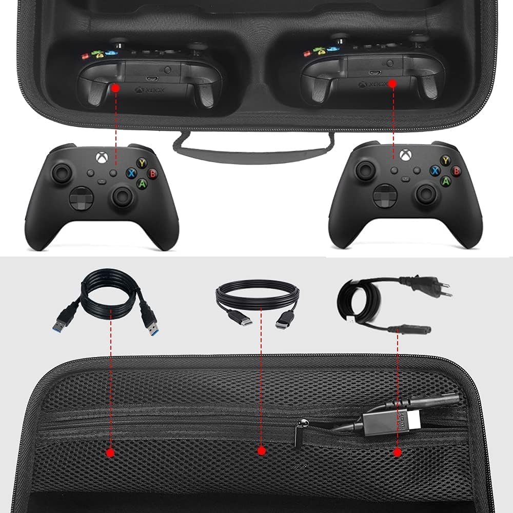 [السعة]: يمكن للحافظة أن تحمل وحدة تحكم Xbox Series X، ما يصل إلى جهازي تحكم لاسلكيين. كابلات HDMI والطاقة وبعض الملحقات الأخرى.